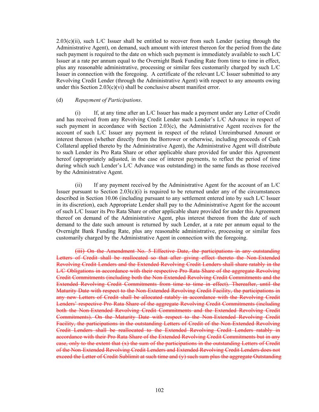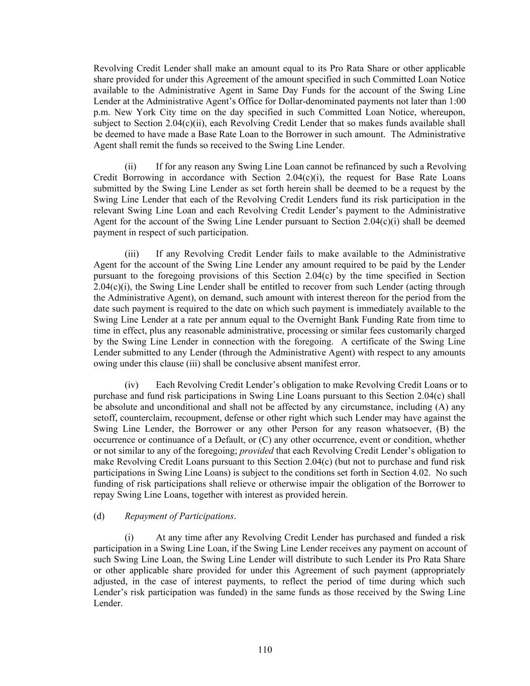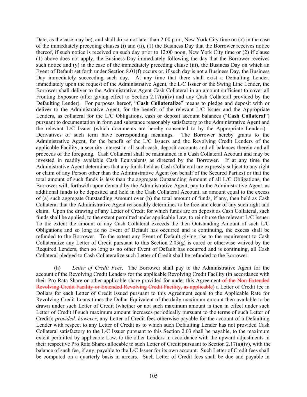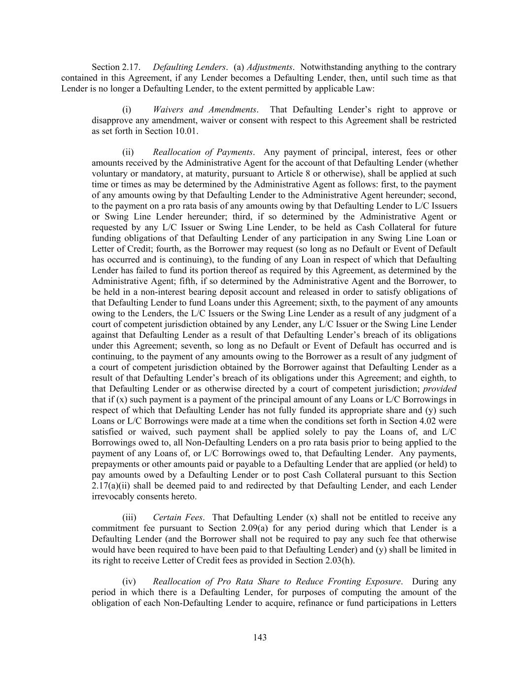 Section 2.17. Defaulting Lenders. (a) Adjustments. Notwithstanding anything to the contrarycontained in this Agreement, if any Lender becomes a Defaulting Lender, then, until such time as thatLender is no longer a Defaulting Lender, to the extent permitted by applicable Law:(i) Waivers and Amendments. That Defaulting Lender’s right to approve ordisapprove any amendment, waiver or consent with respect to this Agreement shall be restrictedas set forth in Section 10.01.(ii) Reallocation of Payments. Any payment of principal, interest, fees or otheramounts received by the Administrative Agent for the account of that Defaulting Lender (whethervoluntary or mandatory, at maturity, pursuant to Article 8 or otherwise), shall be applied at suchtime or times as may be determined by the Administrative Agent as follows: first, to the paymentof any amounts owing by that Defaulting Lender to the Administrative Agent hereunder; second,to the payment on a pro rata basis of any amounts owing by that Defaulting Lender to L/C Issuersor Swing Line Lender hereunder; third, if so determined by the Administrative Agent orrequested by any L/C Issuer or Swing Line Lender, to be held as Cash Collateral for futurefunding obligations of that Defaulting Lender of any participation in any Swing Line Loan orLetter of Credit; fourth, as the Borrower may request (so long as no Default or Event of Defaulthas occurred and is continuing), to the funding of any Loan in respect of which that DefaultingLender has failed to fund its portion thereof as required by this Agreement, as determined by theAdministrative Agent; fifth, if so determined by the Administrative Agent and the Borrower, tobe held in a non-interest bearing deposit account and released in order to satisfy obligations ofthat Defaulting Lender to fund Loans under this Agreement; sixth, to the payment of any amountsowing to the Lenders, the L/C Issuers or the Swing Line Lender as a result of any judgment of acourt of competent jurisdiction obtained by any Lender, any L/C Issuer or the Swing Line Lenderagainst that Defaulting Lender as a result of that Defaulting Lender’s breach of its obligationsunder this Agreement; seventh, so long as no Default or Event of Default has occurred and iscontinuing, to the payment of any amounts owing to the Borrower as a result of any judgment ofa court of competent jurisdiction obtained by the Borrower against that Defaulting Lender as aresult of that Defaulting Lender’s breach of its obligations under this Agreement; and eighth, tothat Defaulting Lender or as otherwise directed by a court of competent jurisdiction; providedthat if (x) such payment is a payment of the principal amount of any Loans or L/C Borrowings inrespect of which that Defaulting Lender has not fully funded its appropriate share and (y) suchLoans or L/C Borrowings were made at a time when the conditions set forth in Section 4.02 weresatisfied or waived, such payment shall be applied solely to pay the Loans of, and L/CBorrowings owed to, all Non-Defaulting Lenders on a pro rata basis prior to being applied to thepayment of any Loans of, or L/C Borrowings owed to, that Defaulting Lender. Any payments,prepayments or other amounts paid or payable to a Defaulting Lender that are applied (or held) topay amounts owed by a Defaulting Lender or to post Cash Collateral pursuant to this Section2.17(a)(ii) shall be deemed paid to and redirected by that Defaulting Lender, and each Lenderirrevocably consents hereto.(iii) Certain Fees. That Defaulting Lender (x) shall not be entitled to receive anycommitment fee pursuant to Section 2.09(a) for any period during which that Lender is aDefaulting Lender (and the Borrower shall not be required to pay any such fee that otherwisewould have been required to have been paid to that Defaulting Lender) and (y) shall be limited inits right to receive Letter of Credit fees as provided in Section 2.03(h).(iv) Reallocation of Pro Rata Share to Reduce Fronting Exposure. During anyperiod in which there is a Defaulting Lender, for purposes of computing the amount of theobligation of each Non-Defaulting Lender to acquire, refinance or fund participations in Letters143