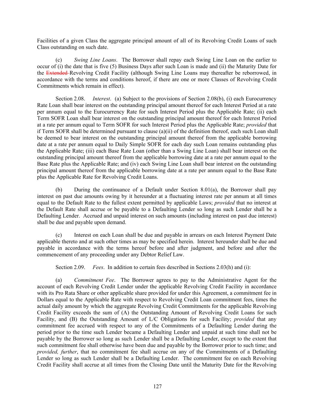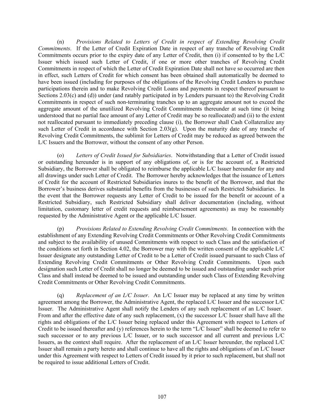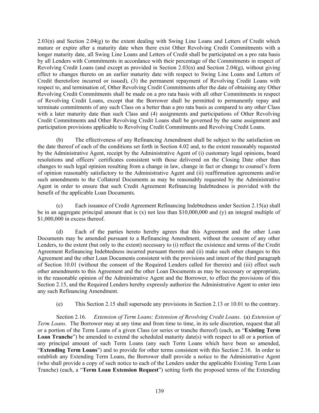 2.03(n) and Section 2.04(g) to the extent dealing with Swing Line Loans and Letters of Credit whichmature or expire after a maturity date when there exist Other Revolving Credit Commitments with alonger maturity date, all Swing Line Loans and Letters of Credit shall be participated on a pro rata basisby all Lenders with Commitments in accordance with their percentage of the Commitments in respect ofRevolving Credit Loans (and except as provided in Section 2.03(n) and Section 2.04(g), without givingeffect to changes thereto on an earlier maturity date with respect to Swing Line Loans and Letters ofCredit theretofore incurred or issued), (3) the permanent repayment of Revolving Credit Loans withrespect to, and termination of, Other Revolving Credit Commitments after the date of obtaining any OtherRevolving Credit Commitments shall be made on a pro rata basis with all other Commitments in respectof Revolving Credit Loans, except that the Borrower shall be permitted to permanently repay andterminate commitments of any such Class on a better than a pro rata basis as compared to any other Classwith a later maturity date than such Class and (4) assignments and participations of Other RevolvingCredit Commitments and Other Revolving Credit Loans shall be governed by the same assignment andparticipation provisions applicable to Revolving Credit Commitments and Revolving Credit Loans.(b) The effectiveness of any Refinancing Amendment shall be subject to the satisfaction onthe date thereof of each of the conditions set forth in Section 4.02 and, to the extent reasonably requestedby the Administrative Agent, receipt by the Administrative Agent of (i) customary legal opinions, boardresolutions and officers’ certificates consistent with those delivered on the Closing Date other thanchanges to such legal opinion resulting from a change in law, change in fact or change to counsel’s formof opinion reasonably satisfactory to the Administrative Agent and (ii) reaffirmation agreements and/orsuch amendments to the Collateral Documents as may be reasonably requested by the AdministrativeAgent in order to ensure that such Credit Agreement Refinancing Indebtedness is provided with thebenefit of the applicable Loan Documents.(c) Each issuance of Credit Agreement Refinancing Indebtedness under Section 2.15(a) shallbe in an aggregate principal amount that is (x) not less than $10,000,000 and (y) an integral multiple of$1,000,000 in excess thereof.(d) Each of the parties hereto hereby agrees that this Agreement and the other LoanDocuments may be amended pursuant to a Refinancing Amendment, without the consent of any otherLenders, to the extent (but only to the extent) necessary to (i) reflect the existence and terms of the CreditAgreement Refinancing Indebtedness incurred pursuant thereto and (ii) make such other changes to thisAgreement and the other Loan Documents consistent with the provisions and intent of the third paragraphof Section 10.01 (without the consent of the Required Lenders called for therein) and (iii) effect suchother amendments to this Agreement and the other Loan Documents as may be necessary or appropriate,in the reasonable opinion of the Administrative Agent and the Borrower, to effect the provisions of this Section 2.15, and the Required Lenders hereby expressly authorize the Administrative Agent to enter intoany such Refinancing Amendment.(e) This Section 2.15 shall supersede any provisions in Section 2.13 or 10.01 to the contrary.Section 2.16. Extension of Term Loans; Extension of Revolving Credit Loans. (a) Extension ofTerm Loans. The Borrower may at any time and from time to time, in its sole discretion, request that allor a portion of the Term Loans of a given Class (or series or tranche thereof) (each, an “Existing TermLoan Tranche”) be amended to extend the scheduled maturity date(s) with respect to all or a portion ofany principal amount of such Term Loans (any such Term Loans which have been so amended,“Extending Term Loans”) and to provide for other terms consistent with this Section 2.16. In order toestablish any Extending Term Loans, the Borrower shall provide a notice to the Administrative Agent(who shall provide a copy of such notice to each of the Lenders under the applicable Existing Term LoanTranche) (each, a “Term Loan Extension Request”) setting forth the proposed terms of the Extending139