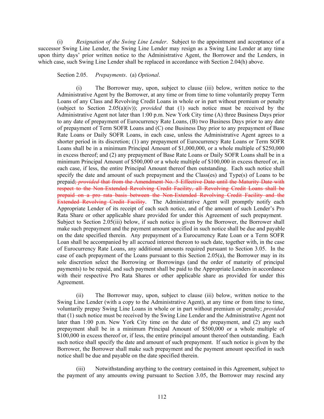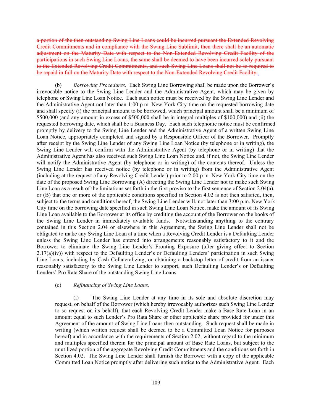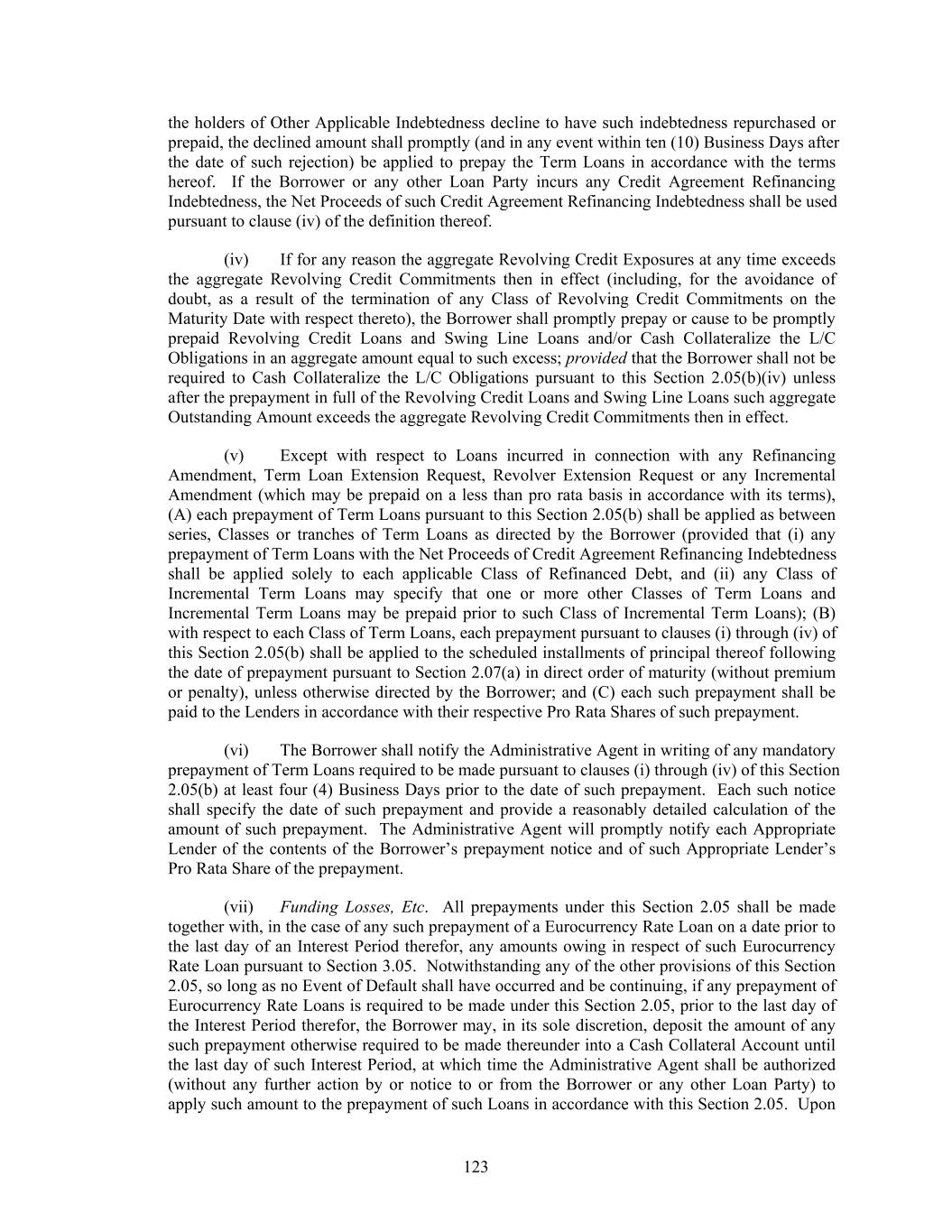 2.03(n) and Section 2.04(g) to the extent dealing with Swing Line Loans and Letters of Credit whichmature or expire after a maturity date when there exist Other Revolving Credit Commitments with alonger maturity date, all Swing Line Loans and Letters of Credit shall be participated on a pro rata basisby all Lenders with Commitments in accordance with their percentage of the Commitments in respect ofRevolving Credit Loans (and except as provided in Section 2.03(n) and Section 2.04(g), without givingeffect to changes thereto on an earlier maturity date with respect to Swing Line Loans and Letters ofCredit theretofore incurred or issued), (3) the permanent repayment of Revolving Credit Loans withrespect to, and termination of, Other Revolving Credit Commitments after the date of obtaining any OtherRevolving Credit Commitments shall be made on a pro rata basis with all other Commitments in respectof Revolving Credit Loans, except that the Borrower shall be permitted to permanently repay andterminate commitments of any such Class on a better than a pro rata basis as compared to any other Classwith a later maturity date than such Class and (4) assignments and participations of Other RevolvingCredit Commitments and Other Revolving Credit Loans shall be governed by the same assignment andparticipation provisions applicable to Revolving Credit Commitments and Revolving Credit Loans.(b) The effectiveness of any Refinancing Amendment shall be subject to the satisfaction onthe date thereof of each of the conditions set forth in Section 4.02 and, to the extent reasonably requestedby the Administrative Agent, receipt by the Administrative Agent of (i) customary legal opinions, boardresolutions and officers’ certificates consistent with those delivered on the Closing Date other thanchanges to such legal opinion resulting from a change in law, change in fact or change to counsel’s formof opinion reasonably satisfactory to the Administrative Agent and (ii) reaffirmation agreements and/orsuch amendments to the Collateral Documents as may be reasonably requested by the AdministrativeAgent in order to ensure that such Credit Agreement Refinancing Indebtedness is provided with thebenefit of the applicable Loan Documents.(c) Each issuance of Credit Agreement Refinancing Indebtedness under Section 2.15(a) shallbe in an aggregate principal amount that is (x) not less than $10,000,000 and (y) an integral multiple of$1,000,000 in excess thereof.(d) Each of the parties hereto hereby agrees that this Agreement and the other LoanDocuments may be amended pursuant to a Refinancing Amendment, without the consent of any otherLenders, to the extent (but only to the extent) necessary to (i) reflect the existence and terms of the CreditAgreement Refinancing Indebtedness incurred pursuant thereto and (ii) make such other changes to thisAgreement and the other Loan Documents consistent with the provisions and intent of the third paragraphof Section 10.01 (without the consent of the Required Lenders called for therein) and (iii) effect suchother amendments to this Agreement and the other Loan Documents as may be necessary or appropriate,in the reasonable opinion of the Administrative Agent and the Borrower, to effect the provisions of this Section 2.15, and the Required Lenders hereby expressly authorize the Administrative Agent to enter intoany such Refinancing Amendment.(e) This Section 2.15 shall supersede any provisions in Section 2.13 or 10.01 to the contrary.Section 2.16. Extension of Term Loans; Extension of Revolving Credit Loans. (a) Extension ofTerm Loans. The Borrower may at any time and from time to time, in its sole discretion, request that allor a portion of the Term Loans of a given Class (or series or tranche thereof) (each, an “Existing TermLoan Tranche”) be amended to extend the scheduled maturity date(s) with respect to all or a portion ofany principal amount of such Term Loans (any such Term Loans which have been so amended,“Extending Term Loans”) and to provide for other terms consistent with this Section 2.16. In order toestablish any Extending Term Loans, the Borrower shall provide a notice to the Administrative Agent(who shall provide a copy of such notice to each of the Lenders under the applicable Existing Term LoanTranche) (each, a “Term Loan Extension Request”) setting forth the proposed terms of the Extending139