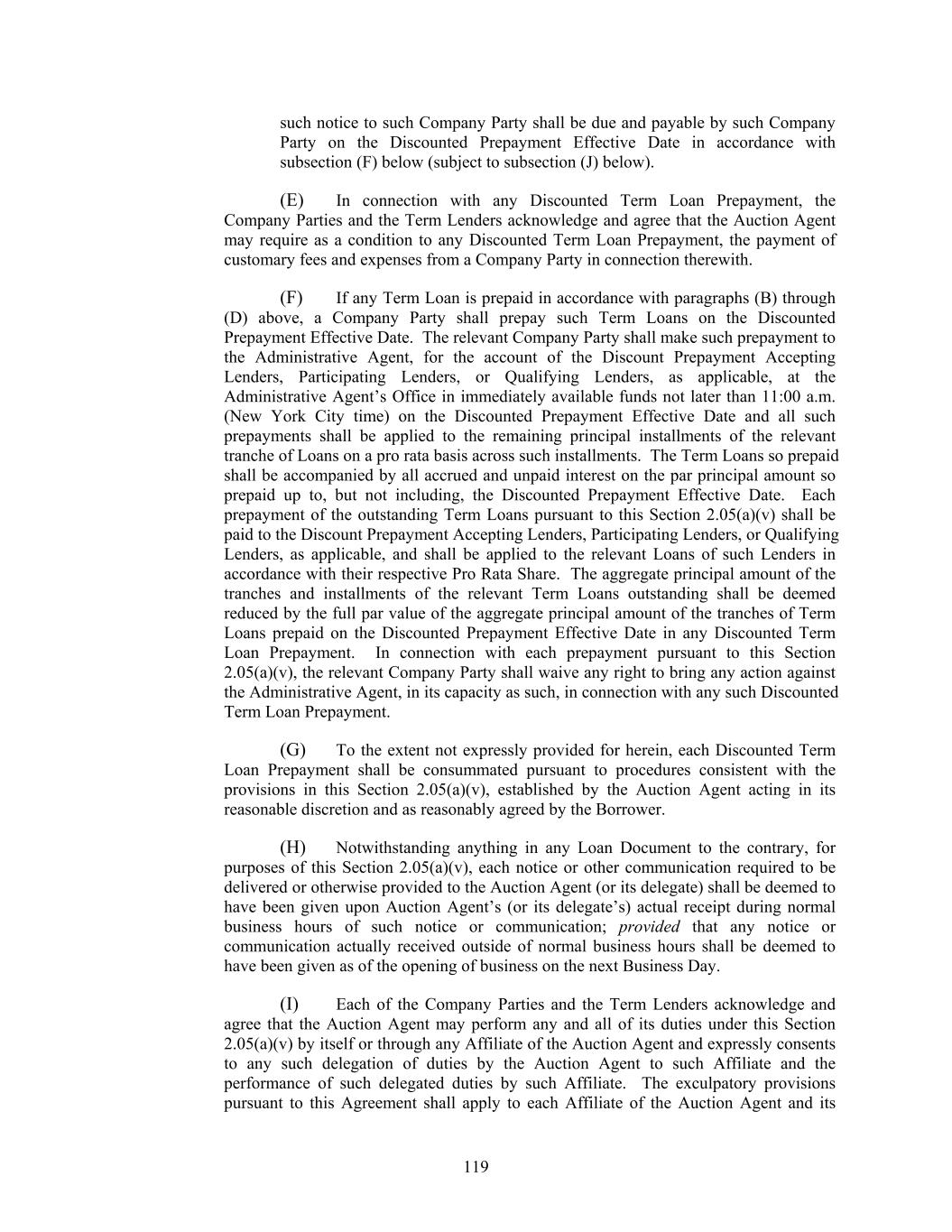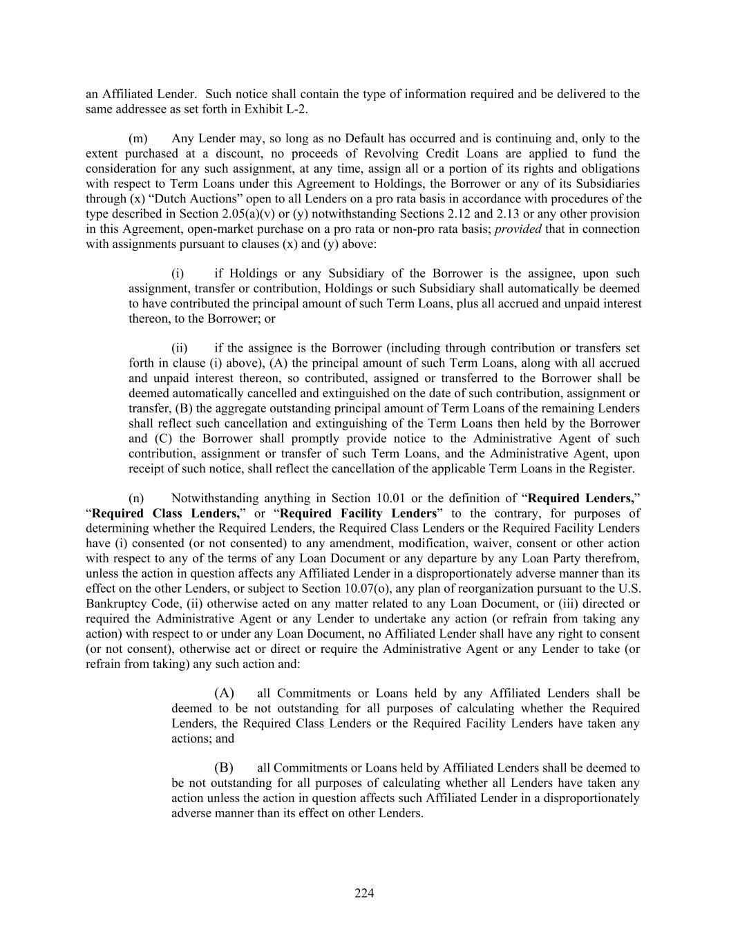 an Affiliated Lender. Such notice shall contain the type of information required and be delivered to thesame addressee as set forth in Exhibit L-2.(m) Any Lender may, so long as no Default has occurred and is continuing and, only to theextent purchased at a discount, no proceeds of Revolving Credit Loans are applied to fund theconsideration for any such assignment, at any time, assign all or a portion of its rights and obligationswith respect to Term Loans under this Agreement to Holdings, the Borrower or any of its Subsidiariesthrough (x) “Dutch Auctions” open to all Lenders on a pro rata basis in accordance with procedures of thetype described in Section 2.05(a)(v) or (y) notwithstanding Sections 2.12 and 2.13 or any other provisionin this Agreement, open-market purchase on a pro rata or non-pro rata basis; provided that in connectionwith assignments pursuant to clauses (x) and (y) above:(i) if Holdings or any Subsidiary of the Borrower is the assignee, upon suchassignment, transfer or contribution, Holdings or such Subsidiary shall automatically be deemedto have contributed the principal amount of such Term Loans, plus all accrued and unpaid interestthereon, to the Borrower; or(ii) if the assignee is the Borrower (including through contribution or transfers setforth in clause (i) above), (A) the principal amount of such Term Loans, along with all accruedand unpaid interest thereon, so contributed, assigned or transferred to the Borrower shall bedeemed automatically cancelled and extinguished on the date of such contribution, assignment ortransfer, (B) the aggregate outstanding principal amount of Term Loans of the remaining Lendersshall reflect such cancellation and extinguishing of the Term Loans then held by the Borrowerand (C) the Borrower shall promptly provide notice to the Administrative Agent of suchcontribution, assignment or transfer of such Term Loans, and the Administrative Agent, uponreceipt of such notice, shall reflect the cancellation of the applicable Term Loans in the Register.(n) Notwithstanding anything in Section 10.01 or the definition of “Required Lenders,”“Required Class Lenders,” or “Required Facility Lenders” to the contrary, for purposes ofdetermining whether the Required Lenders, the Required Class Lenders or the Required Facility Lendershave (i) consented (or not consented) to any amendment, modification, waiver, consent or other actionwith respect to any of the terms of any Loan Document or any departure by any Loan Party therefrom,unless the action in question affects any Affiliated Lender in a disproportionately adverse manner than itseffect on the other Lenders, or subject to Section 10.07(o), any plan of reorganization pursuant to the U.S.Bankruptcy Code, (ii) otherwise acted on any matter related to any Loan Document, or (iii) directed orrequired the Administrative Agent or any Lender to undertake any action (or refrain from taking anyaction) with respect to or under any Loan Document, no Affiliated Lender shall have any right to consent(or not consent), otherwise act or direct or require the Administrative Agent or any Lender to take (orrefrain from taking) any such action and:(A) all Commitments or Loans held by any Affiliated Lenders shall bedeemed to be not outstanding for all purposes of calculating whether the RequiredLenders, the Required Class Lenders or the Required Facility Lenders have taken anyactions; and(B) all Commitments or Loans held by Affiliated Lenders shall be deemed tobe not outstanding for all purposes of calculating whether all Lenders have taken anyaction unless the action in question affects such Affiliated Lender in a disproportionatelyadverse manner than its effect on other Lenders.224
