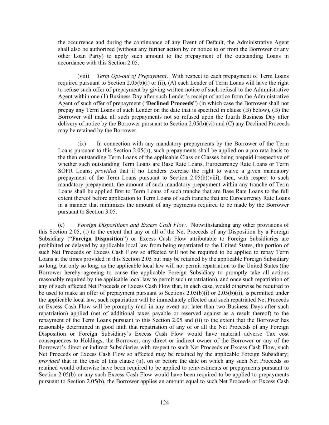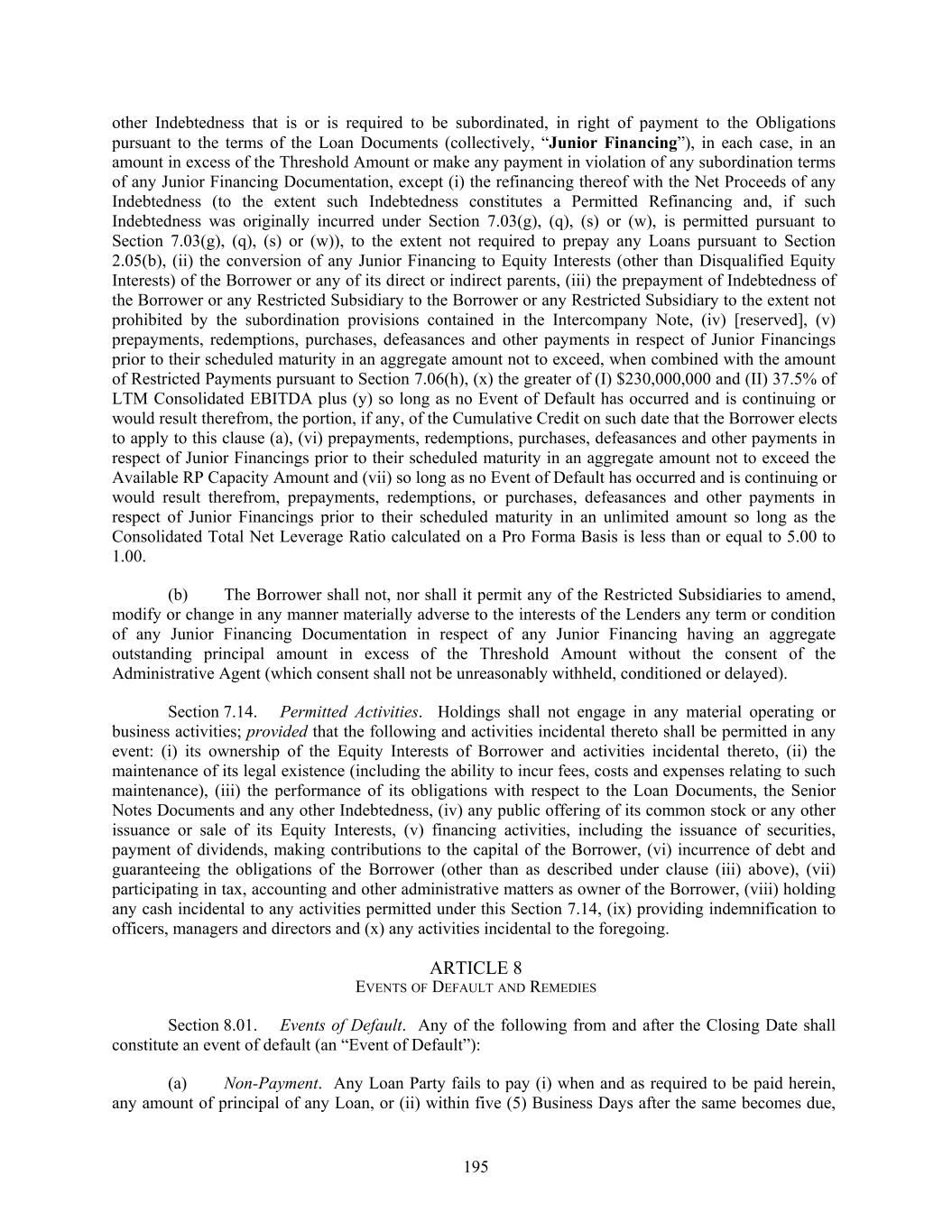 other Indebtedness that is or is required to be subordinated, in right of payment to the Obligationspursuant to the terms of the Loan Documents (collectively, “Junior Financing”), in each case, in anamount in excess of the Threshold Amount or make any payment in violation of any subordination termsof any Junior Financing Documentation, except (i) the refinancing thereof with the Net Proceeds of anyIndebtedness (to the extent such Indebtedness constitutes a Permitted Refinancing and, if suchIndebtedness was originally incurred under Section 7.03(g), (q), (s) or (w), is permitted pursuant to Section 7.03(g), (q), (s) or (w)), to the extent not required to prepay any Loans pursuant to Section2.05(b), (ii) the conversion of any Junior Financing to Equity Interests (other than Disqualified EquityInterests) of the Borrower or any of its direct or indirect parents, (iii) the prepayment of Indebtedness ofthe Borrower or any Restricted Subsidiary to the Borrower or any Restricted Subsidiary to the extent notprohibited by the subordination provisions contained in the Intercompany Note, (iv) [reserved], (v)prepayments, redemptions, purchases, defeasances and other payments in respect of Junior Financingsprior to their scheduled maturity in an aggregate amount not to exceed, when combined with the amountof Restricted Payments pursuant to Section 7.06(h), (x) the greater of (I) $230,000,000 and (II) 37.5% ofLTM Consolidated EBITDA plus (y) so long as no Event of Default has occurred and is continuing orwould result therefrom, the portion, if any, of the Cumulative Credit on such date that the Borrower electsto apply to this clause (a), (vi) prepayments, redemptions, purchases, defeasances and other payments inrespect of Junior Financings prior to their scheduled maturity in an aggregate amount not to exceed theAvailable RP Capacity Amount and (vii) so long as no Event of Default has occurred and is continuing orwould result therefrom, prepayments, redemptions, or purchases, defeasances and other payments inrespect of Junior Financings prior to their scheduled maturity in an unlimited amount so long as theConsolidated Total Net Leverage Ratio calculated on a Pro Forma Basis is less than or equal to 5.00 to1.00. (b) The Borrower shall not, nor shall it permit any of the Restricted Subsidiaries to amend,modify or change in any manner materially adverse to the interests of the Lenders any term or conditionof any Junior Financing Documentation in respect of any Junior Financing having an aggregateoutstanding principal amount in excess of the Threshold Amount without the consent of theAdministrative Agent (which consent shall not be unreasonably withheld, conditioned or delayed).Section 7.14. Permitted Activities. Holdings shall not engage in any material operating orbusiness activities; provided that the following and activities incidental thereto shall be permitted in anyevent: (i) its ownership of the Equity Interests of Borrower and activities incidental thereto, (ii) themaintenance of its legal existence (including the ability to incur fees, costs and expenses relating to suchmaintenance), (iii) the performance of its obligations with respect to the Loan Documents, the SeniorNotes Documents and any other Indebtedness, (iv) any public offering of its common stock or any otherissuance or sale of its Equity Interests, (v) financing activities, including the issuance of securities,payment of dividends, making contributions to the capital of the Borrower, (vi) incurrence of debt andguaranteeing the obligations of the Borrower (other than as described under clause (iii) above), (vii)participating in tax, accounting and other administrative matters as owner of the Borrower, (viii) holdingany cash incidental to any activities permitted under this Section 7.14, (ix) providing indemnification toofficers, managers and directors and (x) any activities incidental to the foregoing.ARTICLE 8EVENTS OF DEFAULT AND REMEDIESSection 8.01. Events of Default. Any of the following from and after the Closing Date shallconstitute an event of default (an “Event of Default”):(a) Non-Payment. Any Loan Party fails to pay (i) when and as required to be paid herein,any amount of principal of any Loan, or (ii) within five (5) Business Days after the same becomes due,195