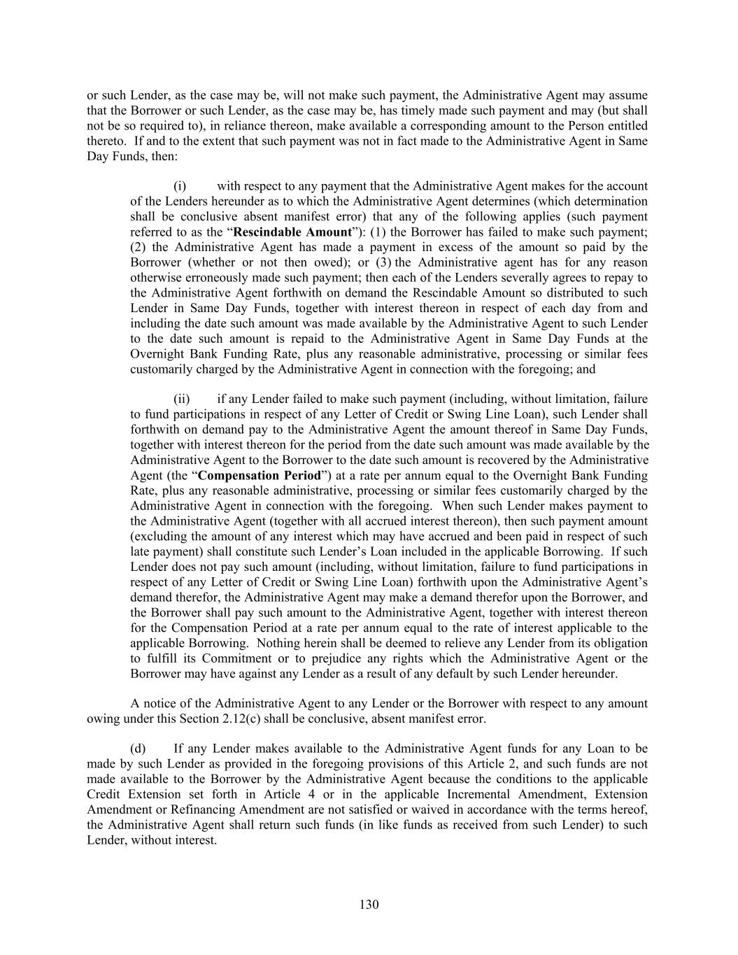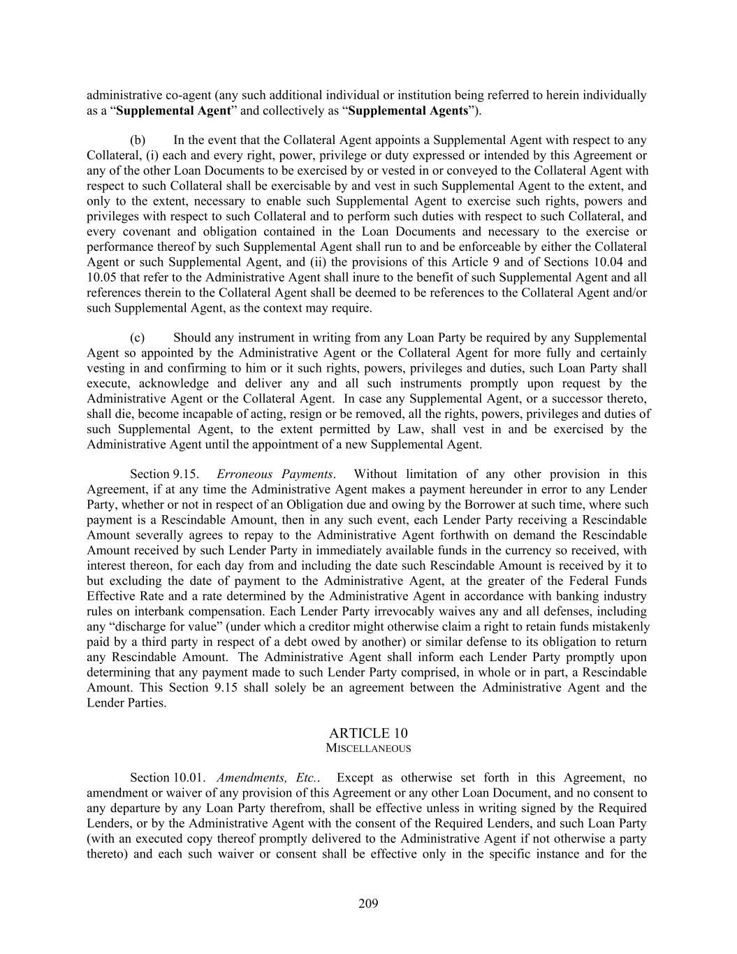 administrative co-agent (any such additional individual or institution being referred to herein individuallyas a “Supplemental Agent” and collectively as “Supplemental Agents”).(b) In the event that the Collateral Agent appoints a Supplemental Agent with respect to anyCollateral, (i) each and every right, power, privilege or duty expressed or intended by this Agreement orany of the other Loan Documents to be exercised by or vested in or conveyed to the Collateral Agent withrespect to such Collateral shall be exercisable by and vest in such Supplemental Agent to the extent, andonly to the extent, necessary to enable such Supplemental Agent to exercise such rights, powers andprivileges with respect to such Collateral and to perform such duties with respect to such Collateral, andevery covenant and obligation contained in the Loan Documents and necessary to the exercise orperformance thereof by such Supplemental Agent shall run to and be enforceable by either the CollateralAgent or such Supplemental Agent, and (ii) the provisions of this Article 9 and of Sections 10.04 and 10.05 that refer to the Administrative Agent shall inure to the benefit of such Supplemental Agent and allreferences therein to the Collateral Agent shall be deemed to be references to the Collateral Agent and/orsuch Supplemental Agent, as the context may require.(c) Should any instrument in writing from any Loan Party be required by any SupplementalAgent so appointed by the Administrative Agent or the Collateral Agent for more fully and certainlyvesting in and confirming to him or it such rights, powers, privileges and duties, such Loan Party shallexecute, acknowledge and deliver any and all such instruments promptly upon request by theAdministrative Agent or the Collateral Agent. In case any Supplemental Agent, or a successor thereto,shall die, become incapable of acting, resign or be removed, all the rights, powers, privileges and duties ofsuch Supplemental Agent, to the extent permitted by Law, shall vest in and be exercised by theAdministrative Agent until the appointment of a new Supplemental Agent.Section 9.15. Erroneous Payments. Without limitation of any other provision in thisAgreement, if at any time the Administrative Agent makes a payment hereunder in error to any LenderParty, whether or not in respect of an Obligation due and owing by the Borrower at such time, where suchpayment is a Rescindable Amount, then in any such event, each Lender Party receiving a RescindableAmount severally agrees to repay to the Administrative Agent forthwith on demand the RescindableAmount received by such Lender Party in immediately available funds in the currency so received, withinterest thereon, for each day from and including the date such Rescindable Amount is received by it tobut excluding the date of payment to the Administrative Agent, at the greater of the Federal FundsEffective Rate and a rate determined by the Administrative Agent in accordance with banking industryrules on interbank compensation. Each Lender Party irrevocably waives any and all defenses, includingany “discharge for value” (under which a creditor might otherwise claim a right to retain funds mistakenlypaid by a third party in respect of a debt owed by another) or similar defense to its obligation to returnany Rescindable Amount. The Administrative Agent shall inform each Lender Party promptly upondetermining that any payment made to such Lender Party comprised, in whole or in part, a RescindableAmount. This Section 9.15 shall solely be an agreement between the Administrative Agent and theLender Parties. ARTICLE 10MISCELLANEOUSSection 10.01. Amendments, Etc.. Except as otherwise set forth in this Agreement, noamendment or waiver of any provision of this Agreement or any other Loan Document, and no consent toany departure by any Loan Party therefrom, shall be effective unless in writing signed by the RequiredLenders, or by the Administrative Agent with the consent of the Required Lenders, and such Loan Party(with an executed copy thereof promptly delivered to the Administrative Agent if not otherwise a partythereto) and each such waiver or consent shall be effective only in the specific instance and for the209