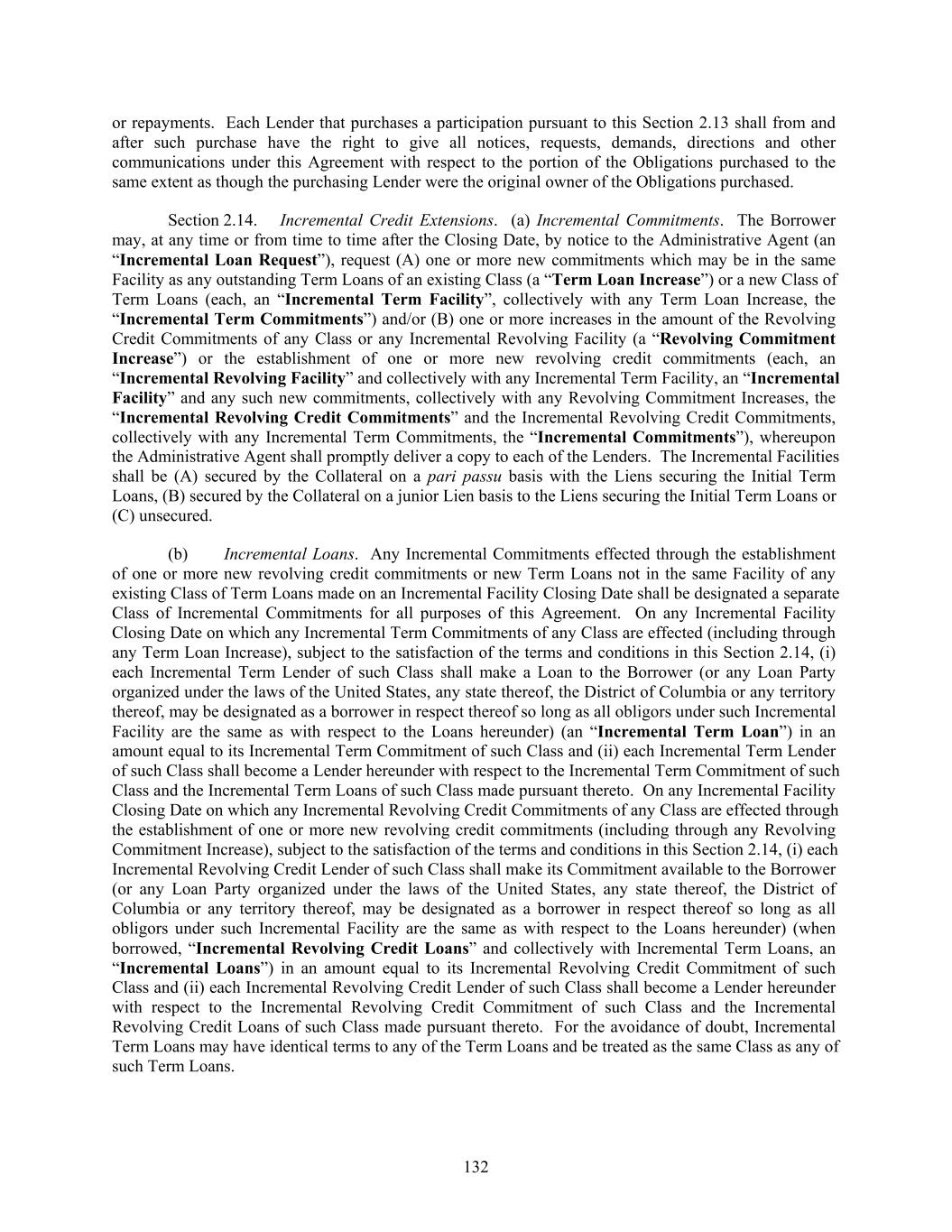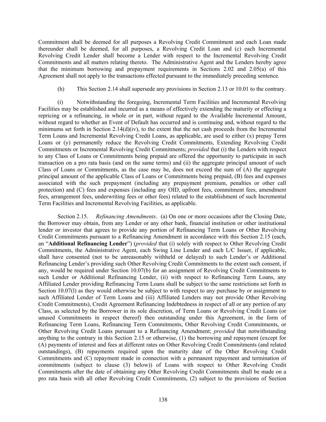 Commitment shall be deemed for all purposes a Revolving Credit Commitment and each Loan madethereunder shall be deemed, for all purposes, a Revolving Credit Loan and (c) each IncrementalRevolving Credit Lender shall become a Lender with respect to the Incremental Revolving CreditCommitments and all matters relating thereto. The Administrative Agent and the Lenders hereby agreethat the minimum borrowing and prepayment requirements in Sections 2.02 and 2.05(a) of thisAgreement shall not apply to the transactions effected pursuant to the immediately preceding sentence.(h) This Section 2.14 shall supersede any provisions in Section 2.13 or 10.01 to the contrary.(i) Notwithstanding the foregoing, Incremental Term Facilities and Incremental RevolvingFacilities may be established and incurred as a means of effectively extending the maturity or effecting arepricing or a refinancing, in whole or in part, without regard to the Available Incremental Amount,without regard to whether an Event of Default has occurred and is continuing and, without regard to theminimums set forth in Section 2.14(d)(iv), to the extent that the net cash proceeds from the IncrementalTerm Loans and Incremental Revolving Credit Loans, as applicable, are used to either (x) prepay TermLoans or (y) permanently reduce the Revolving Credit Commitments, Extending Revolving CreditCommitments or Incremental Revolving Credit Commitments; provided that (i) the Lenders with respectto any Class of Loans or Commitments being prepaid are offered the opportunity to participate in suchtransaction on a pro rata basis (and on the same terms) and (ii) the aggregate principal amount of suchClass of Loans or Commitments, as the case may be, does not exceed the sum of (A) the aggregateprincipal amount of the applicable Class of Loans or Commitments being prepaid, (B) fees and expensesassociated with the such prepayment (including any prepayment premium, penalties or other callprotection) and (C) fees and expenses (including any OID, upfront fees, commitment fees, amendmentfees, arrangement fees, underwriting fees or other fees) related to the establishment of such IncrementalTerm Facilities and Incremental Revolving Facilities, as applicable.Section 2.15. Refinancing Amendments. (a) On one or more occasions after the Closing Date,the Borrower may obtain, from any Lender or any other bank, financial institution or other institutionallender or investor that agrees to provide any portion of Refinancing Term Loans or Other RevolvingCredit Commitments pursuant to a Refinancing Amendment in accordance with this Section 2.15 (each,an “Additional Refinancing Lender”) (provided that (i) solely with respect to Other Revolving CreditCommitments, the Administrative Agent, each Swing Line Lender and each L/C Issuer, if applicable,shall have consented (not to be unreasonably withheld or delayed) to such Lender’s or AdditionalRefinancing Lender’s providing such Other Revolving Credit Commitments to the extent such consent, ifany, would be required under Section 10.07(b) for an assignment of Revolving Credit Commitments tosuch Lender or Additional Refinancing Lender, (ii) with respect to Refinancing Term Loans, anyAffiliated Lender providing Refinancing Term Loans shall be subject to the same restrictions set forth in Section 10.07(l) as they would otherwise be subject to with respect to any purchase by or assignment tosuch Affiliated Lender of Term Loans and (iii) Affiliated Lenders may not provide Other RevolvingCredit Commitments), Credit Agreement Refinancing Indebtedness in respect of all or any portion of anyClass, as selected by the Borrower in its sole discretion, of Term Loans or Revolving Credit Loans (orunused Commitments in respect thereof) then outstanding under this Agreement, in the form ofRefinancing Term Loans, Refinancing Term Commitments, Other Revolving Credit Commitments, orOther Revolving Credit Loans pursuant to a Refinancing Amendment; provided that notwithstandinganything to the contrary in this Section 2.15 or otherwise, (1) the borrowing and repayment (except for(A) payments of interest and fees at different rates on Other Revolving Credit Commitments (and relatedoutstandings), (B) repayments required upon the maturity date of the Other Revolving CreditCommitments and (C) repayment made in connection with a permanent repayment and termination ofcommitments (subject to clause (3) below)) of Loans with respect to Other Revolving CreditCommitments after the date of obtaining any Other Revolving Credit Commitments shall be made on apro rata basis with all other Revolving Credit Commitments, (2) subject to the provisions of Section138
