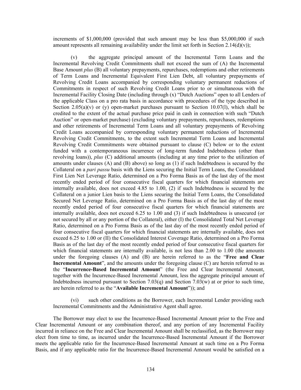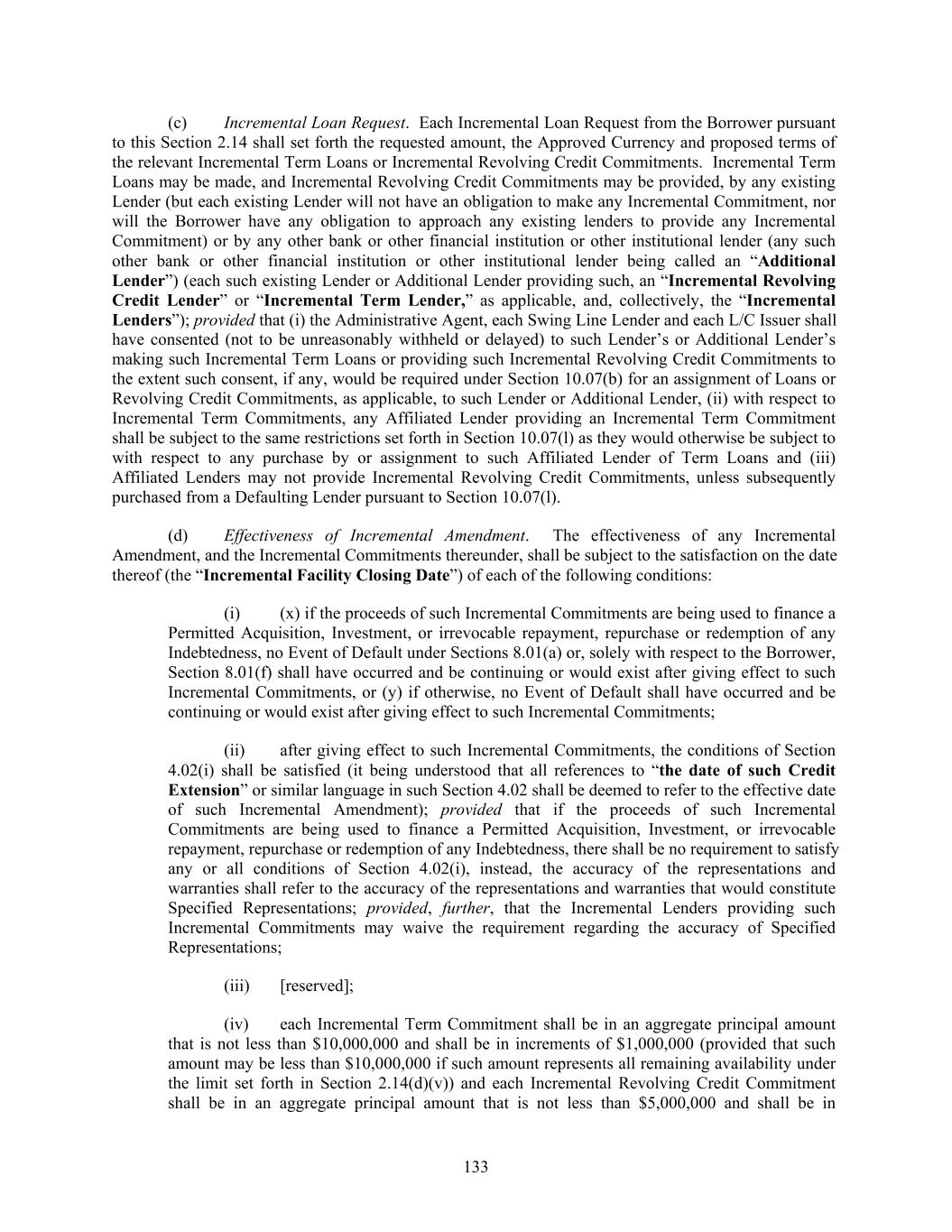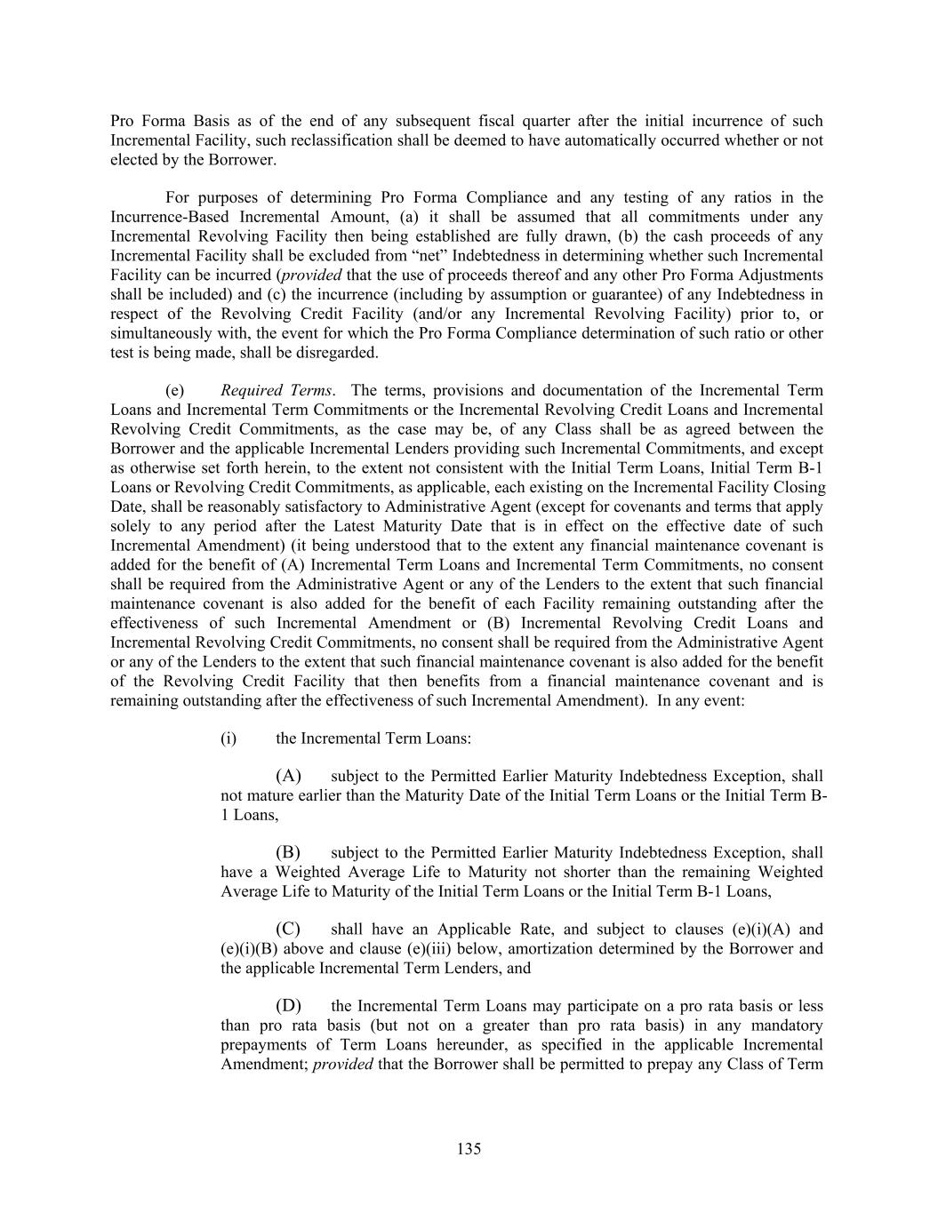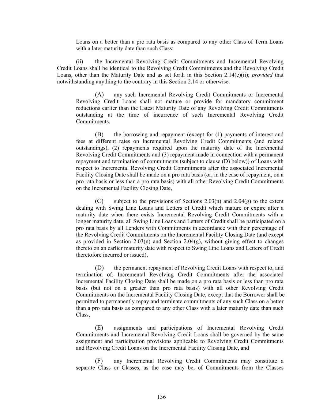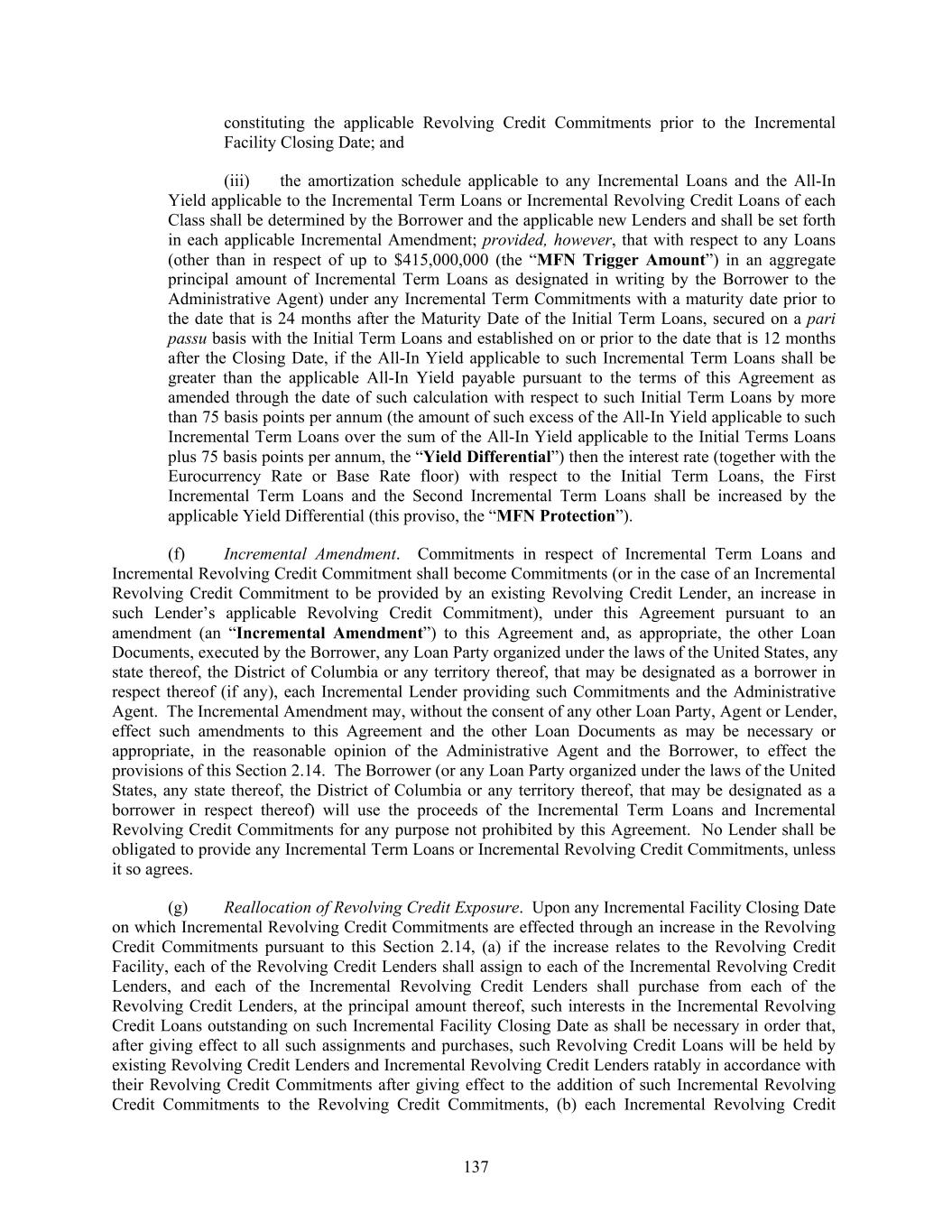 constituting the applicable Revolving Credit Commitments prior to the IncrementalFacility Closing Date; and(iii) the amortization schedule applicable to any Incremental Loans and the All-InYield applicable to the Incremental Term Loans or Incremental Revolving Credit Loans of eachClass shall be determined by the Borrower and the applicable new Lenders and shall be set forthin each applicable Incremental Amendment; provided, however, that with respect to any Loans(other than in respect of up to $415,000,000 (the “MFN Trigger Amount”) in an aggregateprincipal amount of Incremental Term Loans as designated in writing by the Borrower to theAdministrative Agent) under any Incremental Term Commitments with a maturity date prior tothe date that is 24 months after the Maturity Date of the Initial Term Loans, secured on a paripassu basis with the Initial Term Loans and established on or prior to the date that is 12 monthsafter the Closing Date, if the All-In Yield applicable to such Incremental Term Loans shall begreater than the applicable All-In Yield payable pursuant to the terms of this Agreement asamended through the date of such calculation with respect to such Initial Term Loans by morethan 75 basis points per annum (the amount of such excess of the All-In Yield applicable to suchIncremental Term Loans over the sum of the All-In Yield applicable to the Initial Terms Loansplus 75 basis points per annum, the “Yield Differential”) then the interest rate (together with theEurocurrency Rate or Base Rate floor) with respect to the Initial Term Loans, the FirstIncremental Term Loans and the Second Incremental Term Loans shall be increased by theapplicable Yield Differential (this proviso, the “MFN Protection”).(f) Incremental Amendment. Commitments in respect of Incremental Term Loans andIncremental Revolving Credit Commitment shall become Commitments (or in the case of an IncrementalRevolving Credit Commitment to be provided by an existing Revolving Credit Lender, an increase insuch Lender’s applicable Revolving Credit Commitment), under this Agreement pursuant to anamendment (an “Incremental Amendment”) to this Agreement and, as appropriate, the other LoanDocuments, executed by the Borrower, any Loan Party organized under the laws of the United States, anystate thereof, the District of Columbia or any territory thereof, that may be designated as a borrower inrespect thereof (if any), each Incremental Lender providing such Commitments and the AdministrativeAgent. The Incremental Amendment may, without the consent of any other Loan Party, Agent or Lender,effect such amendments to this Agreement and the other Loan Documents as may be necessary orappropriate, in the reasonable opinion of the Administrative Agent and the Borrower, to effect theprovisions of this Section 2.14. The Borrower (or any Loan Party organized under the laws of the UnitedStates, any state thereof, the District of Columbia or any territory thereof, that may be designated as aborrower in respect thereof) will use the proceeds of the Incremental Term Loans and IncrementalRevolving Credit Commitments for any purpose not prohibited by this Agreement. No Lender shall beobligated to provide any Incremental Term Loans or Incremental Revolving Credit Commitments, unlessit so agrees.(g) Reallocation of Revolving Credit Exposure. Upon any Incremental Facility Closing Dateon which Incremental Revolving Credit Commitments are effected through an increase in the RevolvingCredit Commitments pursuant to this Section 2.14, (a) if the increase relates to the Revolving CreditFacility, each of the Revolving Credit Lenders shall assign to each of the Incremental Revolving CreditLenders, and each of the Incremental Revolving Credit Lenders shall purchase from each of theRevolving Credit Lenders, at the principal amount thereof, such interests in the Incremental RevolvingCredit Loans outstanding on such Incremental Facility Closing Date as shall be necessary in order that,after giving effect to all such assignments and purchases, such Revolving Credit Loans will be held byexisting Revolving Credit Lenders and Incremental Revolving Credit Lenders ratably in accordance withtheir Revolving Credit Commitments after giving effect to the addition of such Incremental RevolvingCredit Commitments to the Revolving Credit Commitments, (b) each Incremental Revolving Credit137