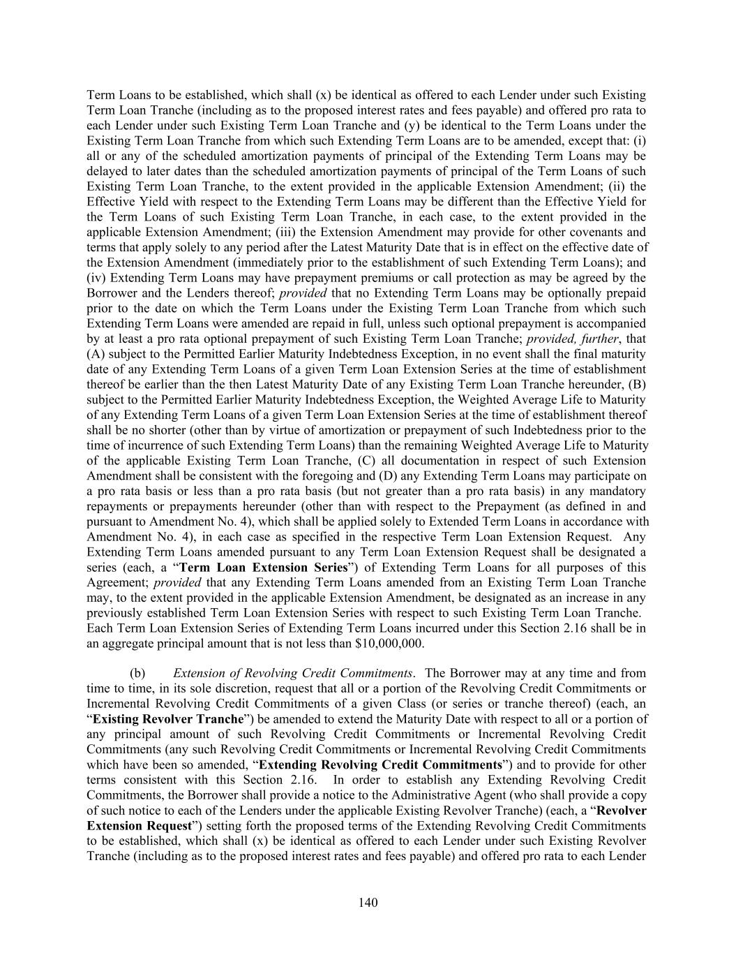 Term Loans to be established, which shall (x) be identical as offered to each Lender under such ExistingTerm Loan Tranche (including as to the proposed interest rates and fees payable) and offered pro rata toeach Lender under such Existing Term Loan Tranche and (y) be identical to the Term Loans under theExisting Term Loan Tranche from which such Extending Term Loans are to be amended, except that: (i)all or any of the scheduled amortization payments of principal of the Extending Term Loans may bedelayed to later dates than the scheduled amortization payments of principal of the Term Loans of suchExisting Term Loan Tranche, to the extent provided in the applicable Extension Amendment; (ii) theEffective Yield with respect to the Extending Term Loans may be different than the Effective Yield forthe Term Loans of such Existing Term Loan Tranche, in each case, to the extent provided in theapplicable Extension Amendment; (iii) the Extension Amendment may provide for other covenants andterms that apply solely to any period after the Latest Maturity Date that is in effect on the effective date ofthe Extension Amendment (immediately prior to the establishment of such Extending Term Loans); and(iv) Extending Term Loans may have prepayment premiums or call protection as may be agreed by theBorrower and the Lenders thereof; provided that no Extending Term Loans may be optionally prepaidprior to the date on which the Term Loans under the Existing Term Loan Tranche from which suchExtending Term Loans were amended are repaid in full, unless such optional prepayment is accompaniedby at least a pro rata optional prepayment of such Existing Term Loan Tranche; provided, further, that(A) subject to the Permitted Earlier Maturity Indebtedness Exception, in no event shall the final maturitydate of any Extending Term Loans of a given Term Loan Extension Series at the time of establishmentthereof be earlier than the then Latest Maturity Date of any Existing Term Loan Tranche hereunder, (B)subject to the Permitted Earlier Maturity Indebtedness Exception, the Weighted Average Life to Maturityof any Extending Term Loans of a given Term Loan Extension Series at the time of establishment thereofshall be no shorter (other than by virtue of amortization or prepayment of such Indebtedness prior to thetime of incurrence of such Extending Term Loans) than the remaining Weighted Average Life to Maturityof the applicable Existing Term Loan Tranche, (C) all documentation in respect of such ExtensionAmendment shall be consistent with the foregoing and (D) any Extending Term Loans may participate ona pro rata basis or less than a pro rata basis (but not greater than a pro rata basis) in any mandatoryrepayments or prepayments hereunder (other than with respect to the Prepayment (as defined in andpursuant to Amendment No. 4), which shall be applied solely to Extended Term Loans in accordance withAmendment No. 4), in each case as specified in the respective Term Loan Extension Request. AnyExtending Term Loans amended pursuant to any Term Loan Extension Request shall be designated aseries (each, a “Term Loan Extension Series”) of Extending Term Loans for all purposes of thisAgreement; provided that any Extending Term Loans amended from an Existing Term Loan Tranchemay, to the extent provided in the applicable Extension Amendment, be designated as an increase in anypreviously established Term Loan Extension Series with respect to such Existing Term Loan Tranche.Each Term Loan Extension Series of Extending Term Loans incurred under this Section 2.16 shall be inan aggregate principal amount that is not less than $10,000,000.(b) Extension of Revolving Credit Commitments. The Borrower may at any time and fromtime to time, in its sole discretion, request that all or a portion of the Revolving Credit Commitments orIncremental Revolving Credit Commitments of a given Class (or series or tranche thereof) (each, an“Existing Revolver Tranche”) be amended to extend the Maturity Date with respect to all or a portion ofany principal amount of such Revolving Credit Commitments or Incremental Revolving CreditCommitments (any such Revolving Credit Commitments or Incremental Revolving Credit Commitmentswhich have been so amended, “Extending Revolving Credit Commitments”) and to provide for otherterms consistent with this Section 2.16. In order to establish any Extending Revolving CreditCommitments, the Borrower shall provide a notice to the Administrative Agent (who shall provide a copyof such notice to each of the Lenders under the applicable Existing Revolver Tranche) (each, a “RevolverExtension Request”) setting forth the proposed terms of the Extending Revolving Credit Commitmentsto be established, which shall (x) be identical as offered to each Lender under such Existing RevolverTranche (including as to the proposed interest rates and fees payable) and offered pro rata to each Lender140