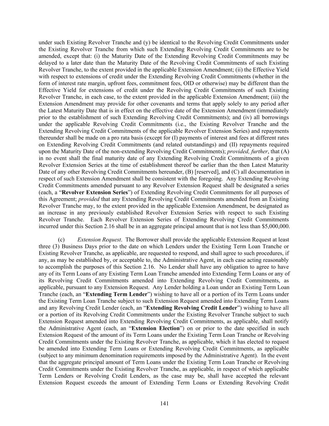 under such Existing Revolver Tranche and (y) be identical to the Revolving Credit Commitments underthe Existing Revolver Tranche from which such Extending Revolving Credit Commitments are to beamended, except that: (i) the Maturity Date of the Extending Revolving Credit Commitments may bedelayed to a later date than the Maturity Date of the Revolving Credit Commitments of such ExistingRevolver Tranche, to the extent provided in the applicable Extension Amendment; (ii) the Effective Yieldwith respect to extensions of credit under the Extending Revolving Credit Commitments (whether in theform of interest rate margin, upfront fees, commitment fees, OID or otherwise) may be different than theEffective Yield for extensions of credit under the Revolving Credit Commitments of such ExistingRevolver Tranche, in each case, to the extent provided in the applicable Extension Amendment; (iii) theExtension Amendment may provide for other covenants and terms that apply solely to any period afterthe Latest Maturity Date that is in effect on the effective date of the Extension Amendment (immediatelyprior to the establishment of such Extending Revolving Credit Commitments); and (iv) all borrowingsunder the applicable Revolving Credit Commitments (i.e., the Existing Revolver Tranche and theExtending Revolving Credit Commitments of the applicable Revolver Extension Series) and repaymentsthereunder shall be made on a pro rata basis (except for (I) payments of interest and fees at different rateson Extending Revolving Credit Commitments (and related outstandings) and (II) repayments requiredupon the Maturity Date of the non-extending Revolving Credit Commitments); provided, further, that (A)in no event shall the final maturity date of any Extending Revolving Credit Commitments of a givenRevolver Extension Series at the time of establishment thereof be earlier than the then Latest MaturityDate of any other Revolving Credit Commitments hereunder, (B) [reserved], and (C) all documentation inrespect of such Extension Amendment shall be consistent with the foregoing. Any Extending RevolvingCredit Commitments amended pursuant to any Revolver Extension Request shall be designated a series(each, a “Revolver Extension Series”) of Extending Revolving Credit Commitments for all purposes ofthis Agreement; provided that any Extending Revolving Credit Commitments amended from an ExistingRevolver Tranche may, to the extent provided in the applicable Extension Amendment, be designated asan increase in any previously established Revolver Extension Series with respect to such ExistingRevolver Tranche. Each Revolver Extension Series of Extending Revolving Credit Commitmentsincurred under this Section 2.16 shall be in an aggregate principal amount that is not less than $5,000,000.(c) Extension Request. The Borrower shall provide the applicable Extension Request at leastthree (3) Business Days prior to the date on which Lenders under the Existing Term Loan Tranche orExisting Revolver Tranche, as applicable, are requested to respond, and shall agree to such procedures, ifany, as may be established by, or acceptable to, the Administrative Agent, in each case acting reasonablyto accomplish the purposes of this Section 2.16. No Lender shall have any obligation to agree to haveany of its Term Loans of any Existing Term Loan Tranche amended into Extending Term Loans or any ofits Revolving Credit Commitments amended into Extending Revolving Credit Commitments, asapplicable, pursuant to any Extension Request. Any Lender holding a Loan under an Existing Term LoanTranche (each, an “Extending Term Lender”) wishing to have all or a portion of its Term Loans underthe Existing Term Loan Tranche subject to such Extension Request amended into Extending Term Loansand any Revolving Credit Lender (each, an “Extending Revolving Credit Lender”) wishing to have allor a portion of its Revolving Credit Commitments under the Existing Revolver Tranche subject to suchExtension Request amended into Extending Revolving Credit Commitments, as applicable, shall notifythe Administrative Agent (each, an “Extension Election”) on or prior to the date specified in suchExtension Request of the amount of its Term Loans under the Existing Term Loan Tranche or RevolvingCredit Commitments under the Existing Revolver Tranche, as applicable, which it has elected to requestbe amended into Extending Term Loans or Extending Revolving Credit Commitments, as applicable(subject to any minimum denomination requirements imposed by the Administrative Agent). In the eventthat the aggregate principal amount of Term Loans under the Existing Term Loan Tranche or RevolvingCredit Commitments under the Existing Revolver Tranche, as applicable, in respect of which applicableTerm Lenders or Revolving Credit Lenders, as the case may be, shall have accepted the relevantExtension Request exceeds the amount of Extending Term Loans or Extending Revolving Credit141