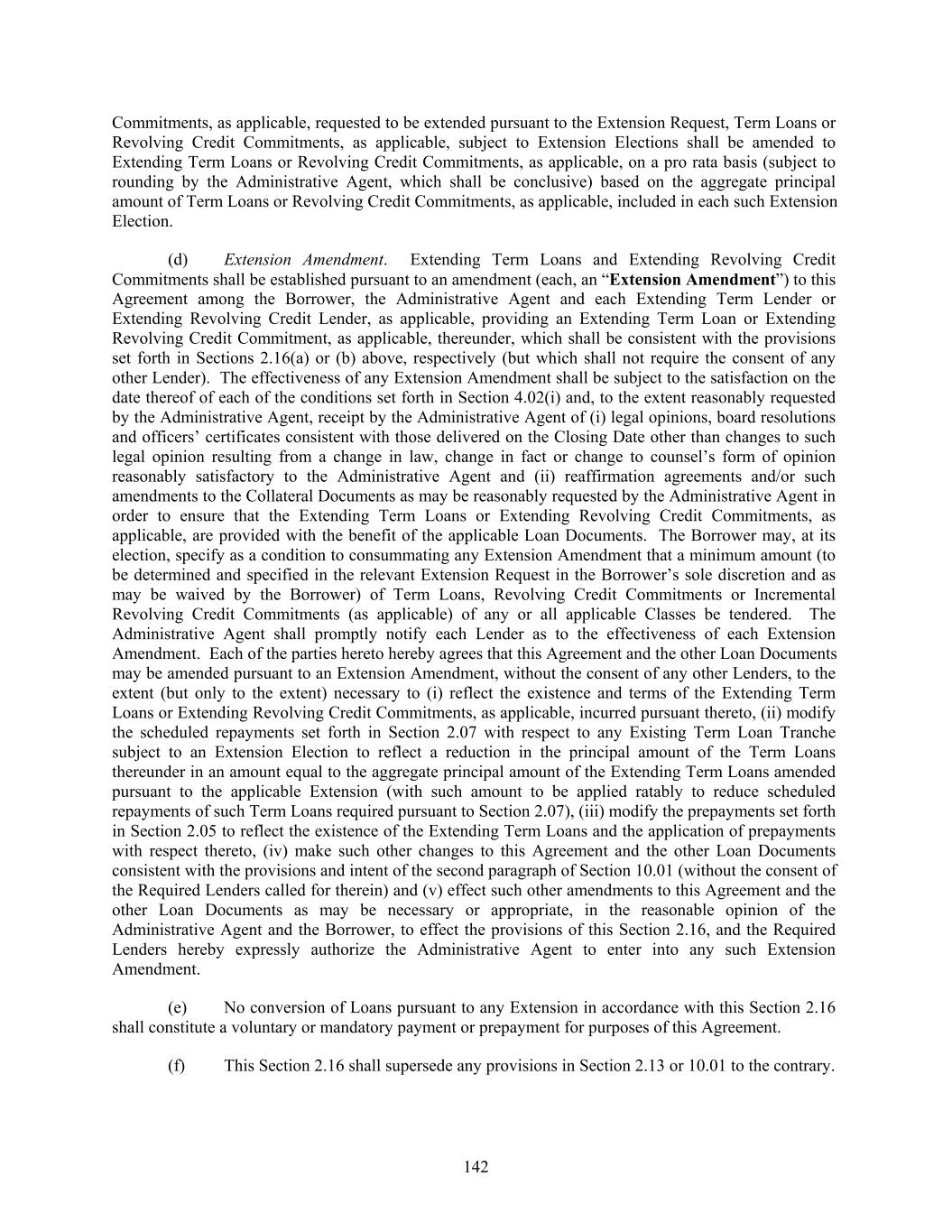 Commitments, as applicable, requested to be extended pursuant to the Extension Request, Term Loans orRevolving Credit Commitments, as applicable, subject to Extension Elections shall be amended toExtending Term Loans or Revolving Credit Commitments, as applicable, on a pro rata basis (subject torounding by the Administrative Agent, which shall be conclusive) based on the aggregate principalamount of Term Loans or Revolving Credit Commitments, as applicable, included in each such ExtensionElection.(d) Extension Amendment. Extending Term Loans and Extending Revolving CreditCommitments shall be established pursuant to an amendment (each, an “Extension Amendment”) to thisAgreement among the Borrower, the Administrative Agent and each Extending Term Lender orExtending Revolving Credit Lender, as applicable, providing an Extending Term Loan or ExtendingRevolving Credit Commitment, as applicable, thereunder, which shall be consistent with the provisionsset forth in Sections 2.16(a) or (b) above, respectively (but which shall not require the consent of anyother Lender). The effectiveness of any Extension Amendment shall be subject to the satisfaction on thedate thereof of each of the conditions set forth in Section 4.02(i) and, to the extent reasonably requestedby the Administrative Agent, receipt by the Administrative Agent of (i) legal opinions, board resolutionsand officers’ certificates consistent with those delivered on the Closing Date other than changes to suchlegal opinion resulting from a change in law, change in fact or change to counsel’s form of opinionreasonably satisfactory to the Administrative Agent and (ii) reaffirmation agreements and/or suchamendments to the Collateral Documents as may be reasonably requested by the Administrative Agent inorder to ensure that the Extending Term Loans or Extending Revolving Credit Commitments, asapplicable, are provided with the benefit of the applicable Loan Documents. The Borrower may, at itselection, specify as a condition to consummating any Extension Amendment that a minimum amount (tobe determined and specified in the relevant Extension Request in the Borrower’s sole discretion and asmay be waived by the Borrower) of Term Loans, Revolving Credit Commitments or IncrementalRevolving Credit Commitments (as applicable) of any or all applicable Classes be tendered. TheAdministrative Agent shall promptly notify each Lender as to the effectiveness of each ExtensionAmendment. Each of the parties hereto hereby agrees that this Agreement and the other Loan Documentsmay be amended pursuant to an Extension Amendment, without the consent of any other Lenders, to theextent (but only to the extent) necessary to (i) reflect the existence and terms of the Extending TermLoans or Extending Revolving Credit Commitments, as applicable, incurred pursuant thereto, (ii) modifythe scheduled repayments set forth in Section 2.07 with respect to any Existing Term Loan Tranchesubject to an Extension Election to reflect a reduction in the principal amount of the Term Loansthereunder in an amount equal to the aggregate principal amount of the Extending Term Loans amendedpursuant to the applicable Extension (with such amount to be applied ratably to reduce scheduledrepayments of such Term Loans required pursuant to Section 2.07), (iii) modify the prepayments set forthin Section 2.05 to reflect the existence of the Extending Term Loans and the application of prepaymentswith respect thereto, (iv) make such other changes to this Agreement and the other Loan Documentsconsistent with the provisions and intent of the second paragraph of Section 10.01 (without the consent ofthe Required Lenders called for therein) and (v) effect such other amendments to this Agreement and theother Loan Documents as may be necessary or appropriate, in the reasonable opinion of theAdministrative Agent and the Borrower, to effect the provisions of this Section 2.16, and the RequiredLenders hereby expressly authorize the Administrative Agent to enter into any such ExtensionAmendment.(e) No conversion of Loans pursuant to any Extension in accordance with this Section 2.16shall constitute a voluntary or mandatory payment or prepayment for purposes of this Agreement.(f) This Section 2.16 shall supersede any provisions in Section 2.13 or 10.01 to the contrary.142