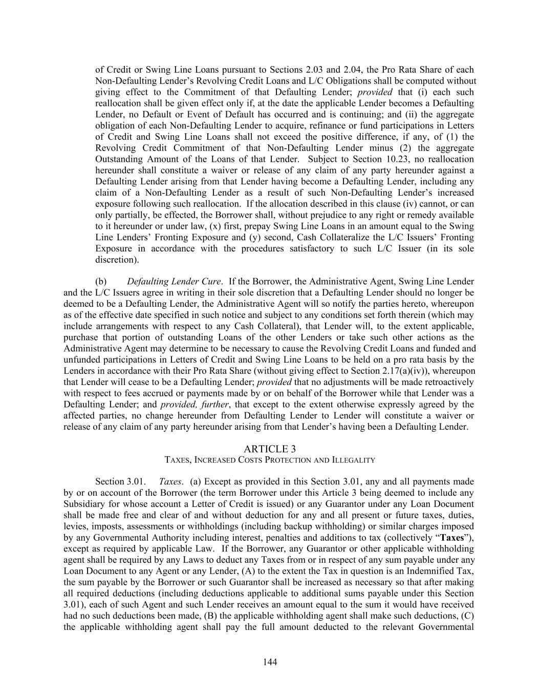 of Credit or Swing Line Loans pursuant to Sections 2.03 and 2.04, the Pro Rata Share of eachNon-Defaulting Lender’s Revolving Credit Loans and L/C Obligations shall be computed withoutgiving effect to the Commitment of that Defaulting Lender; provided that (i) each suchreallocation shall be given effect only if, at the date the applicable Lender becomes a DefaultingLender, no Default or Event of Default has occurred and is continuing; and (ii) the aggregateobligation of each Non-Defaulting Lender to acquire, refinance or fund participations in Lettersof Credit and Swing Line Loans shall not exceed the positive difference, if any, of (1) theRevolving Credit Commitment of that Non-Defaulting Lender minus (2) the aggregateOutstanding Amount of the Loans of that Lender. Subject to Section 10.23, no reallocationhereunder shall constitute a waiver or release of any claim of any party hereunder against aDefaulting Lender arising from that Lender having become a Defaulting Lender, including anyclaim of a Non-Defaulting Lender as a result of such Non-Defaulting Lender’s increasedexposure following such reallocation. If the allocation described in this clause (iv) cannot, or canonly partially, be effected, the Borrower shall, without prejudice to any right or remedy availableto it hereunder or under law, (x) first, prepay Swing Line Loans in an amount equal to the SwingLine Lenders’ Fronting Exposure and (y) second, Cash Collateralize the L/C Issuers’ FrontingExposure in accordance with the procedures satisfactory to such L/C Issuer (in its solediscretion).(b) Defaulting Lender Cure. If the Borrower, the Administrative Agent, Swing Line Lenderand the L/C Issuers agree in writing in their sole discretion that a Defaulting Lender should no longer bedeemed to be a Defaulting Lender, the Administrative Agent will so notify the parties hereto, whereuponas of the effective date specified in such notice and subject to any conditions set forth therein (which mayinclude arrangements with respect to any Cash Collateral), that Lender will, to the extent applicable,purchase that portion of outstanding Loans of the other Lenders or take such other actions as theAdministrative Agent may determine to be necessary to cause the Revolving Credit Loans and funded andunfunded participations in Letters of Credit and Swing Line Loans to be held on a pro rata basis by theLenders in accordance with their Pro Rata Share (without giving effect to Section 2.17(a)(iv)), whereuponthat Lender will cease to be a Defaulting Lender; provided that no adjustments will be made retroactivelywith respect to fees accrued or payments made by or on behalf of the Borrower while that Lender was aDefaulting Lender; and provided, further, that except to the extent otherwise expressly agreed by theaffected parties, no change hereunder from Defaulting Lender to Lender will constitute a waiver orrelease of any claim of any party hereunder arising from that Lender’s having been a Defaulting Lender.ARTICLE 3TAXES, INCREASED COSTS PROTECTION AND ILLEGALITYSection 3.01. Taxes. (a) Except as provided in this Section 3.01, any and all payments madeby or on account of the Borrower (the term Borrower under this Article 3 being deemed to include anySubsidiary for whose account a Letter of Credit is issued) or any Guarantor under any Loan Documentshall be made free and clear of and without deduction for any and all present or future taxes, duties,levies, imposts, assessments or withholdings (including backup withholding) or similar charges imposedby any Governmental Authority including interest, penalties and additions to tax (collectively “Taxes”),except as required by applicable Law. If the Borrower, any Guarantor or other applicable withholdingagent shall be required by any Laws to deduct any Taxes from or in respect of any sum payable under anyLoan Document to any Agent or any Lender, (A) to the extent the Tax in question is an Indemnified Tax,the sum payable by the Borrower or such Guarantor shall be increased as necessary so that after makingall required deductions (including deductions applicable to additional sums payable under this Section3.01), each of such Agent and such Lender receives an amount equal to the sum it would have receivedhad no such deductions been made, (B) the applicable withholding agent shall make such deductions, (C)the applicable withholding agent shall pay the full amount deducted to the relevant Governmental144