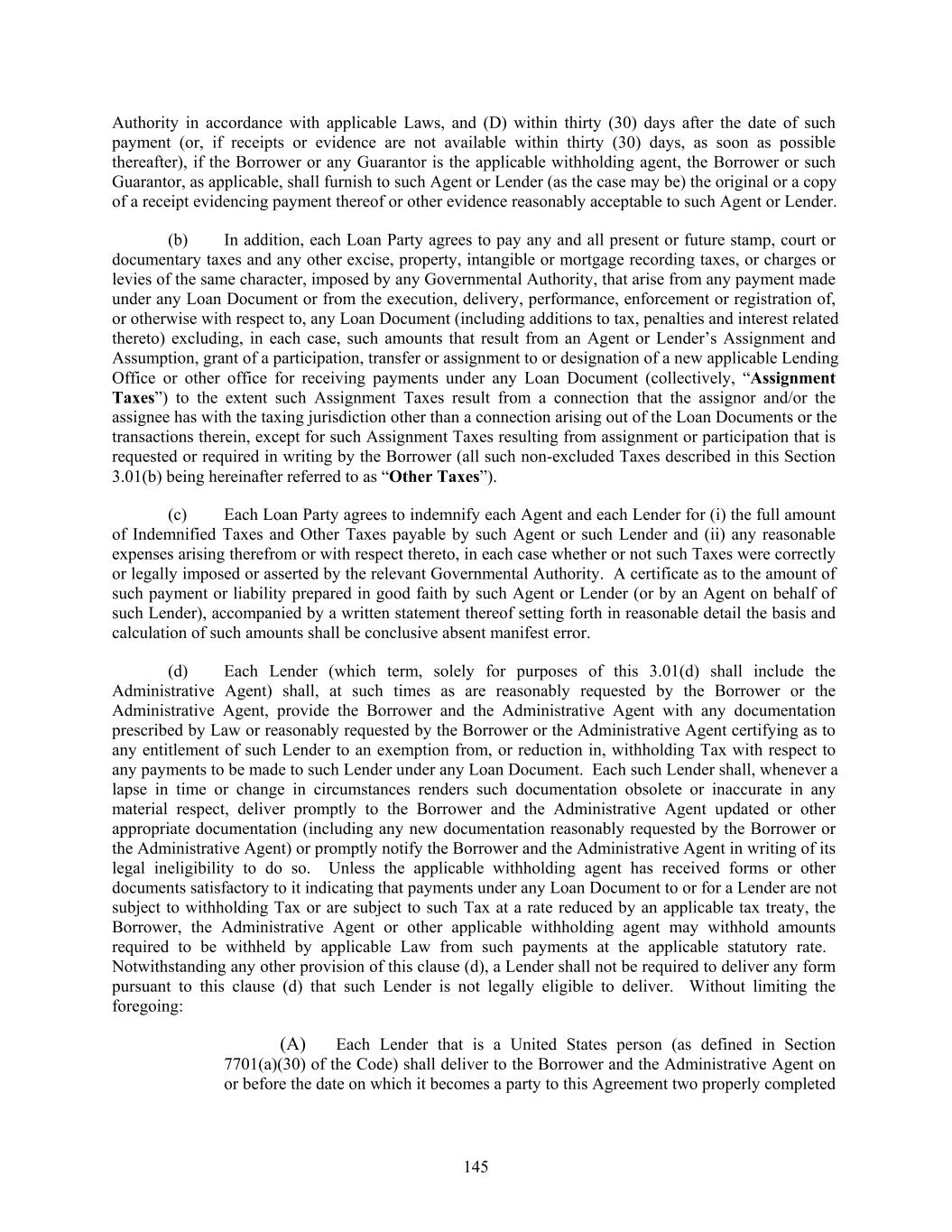 Authority in accordance with applicable Laws, and (D) within thirty (30) days after the date of suchpayment (or, if receipts or evidence are not available within thirty (30) days, as soon as possiblethereafter), if the Borrower or any Guarantor is the applicable withholding agent, the Borrower or suchGuarantor, as applicable, shall furnish to such Agent or Lender (as the case may be) the original or a copyof a receipt evidencing payment thereof or other evidence reasonably acceptable to such Agent or Lender.(b) In addition, each Loan Party agrees to pay any and all present or future stamp, court ordocumentary taxes and any other excise, property, intangible or mortgage recording taxes, or charges orlevies of the same character, imposed by any Governmental Authority, that arise from any payment madeunder any Loan Document or from the execution, delivery, performance, enforcement or registration of,or otherwise with respect to, any Loan Document (including additions to tax, penalties and interest relatedthereto) excluding, in each case, such amounts that result from an Agent or Lender’s Assignment andAssumption, grant of a participation, transfer or assignment to or designation of a new applicable LendingOffice or other office for receiving payments under any Loan Document (collectively, “AssignmentTaxes”) to the extent such Assignment Taxes result from a connection that the assignor and/or theassignee has with the taxing jurisdiction other than a connection arising out of the Loan Documents or thetransactions therein, except for such Assignment Taxes resulting from assignment or participation that isrequested or required in writing by the Borrower (all such non-excluded Taxes described in this Section3.01(b) being hereinafter referred to as “Other Taxes”).(c) Each Loan Party agrees to indemnify each Agent and each Lender for (i) the full amountof Indemnified Taxes and Other Taxes payable by such Agent or such Lender and (ii) any reasonableexpenses arising therefrom or with respect thereto, in each case whether or not such Taxes were correctlyor legally imposed or asserted by the relevant Governmental Authority. A certificate as to the amount ofsuch payment or liability prepared in good faith by such Agent or Lender (or by an Agent on behalf ofsuch Lender), accompanied by a written statement thereof setting forth in reasonable detail the basis andcalculation of such amounts shall be conclusive absent manifest error.(d) Each Lender (which term, solely for purposes of this 3.01(d) shall include theAdministrative Agent) shall, at such times as are reasonably requested by the Borrower or theAdministrative Agent, provide the Borrower and the Administrative Agent with any documentationprescribed by Law or reasonably requested by the Borrower or the Administrative Agent certifying as toany entitlement of such Lender to an exemption from, or reduction in, withholding Tax with respect toany payments to be made to such Lender under any Loan Document. Each such Lender shall, whenever alapse in time or change in circumstances renders such documentation obsolete or inaccurate in anymaterial respect, deliver promptly to the Borrower and the Administrative Agent updated or otherappropriate documentation (including any new documentation reasonably requested by the Borrower orthe Administrative Agent) or promptly notify the Borrower and the Administrative Agent in writing of itslegal ineligibility to do so. Unless the applicable withholding agent has received forms or otherdocuments satisfactory to it indicating that payments under any Loan Document to or for a Lender are notsubject to withholding Tax or are subject to such Tax at a rate reduced by an applicable tax treaty, theBorrower, the Administrative Agent or other applicable withholding agent may withhold amountsrequired to be withheld by applicable Law from such payments at the applicable statutory rate.Notwithstanding any other provision of this clause (d), a Lender shall not be required to deliver any formpursuant to this clause (d) that such Lender is not legally eligible to deliver. Without limiting theforegoing: (A) Each Lender that is a United States person (as defined in Section7701(a)(30) of the Code) shall deliver to the Borrower and the Administrative Agent onor before the date on which it becomes a party to this Agreement two properly completed145