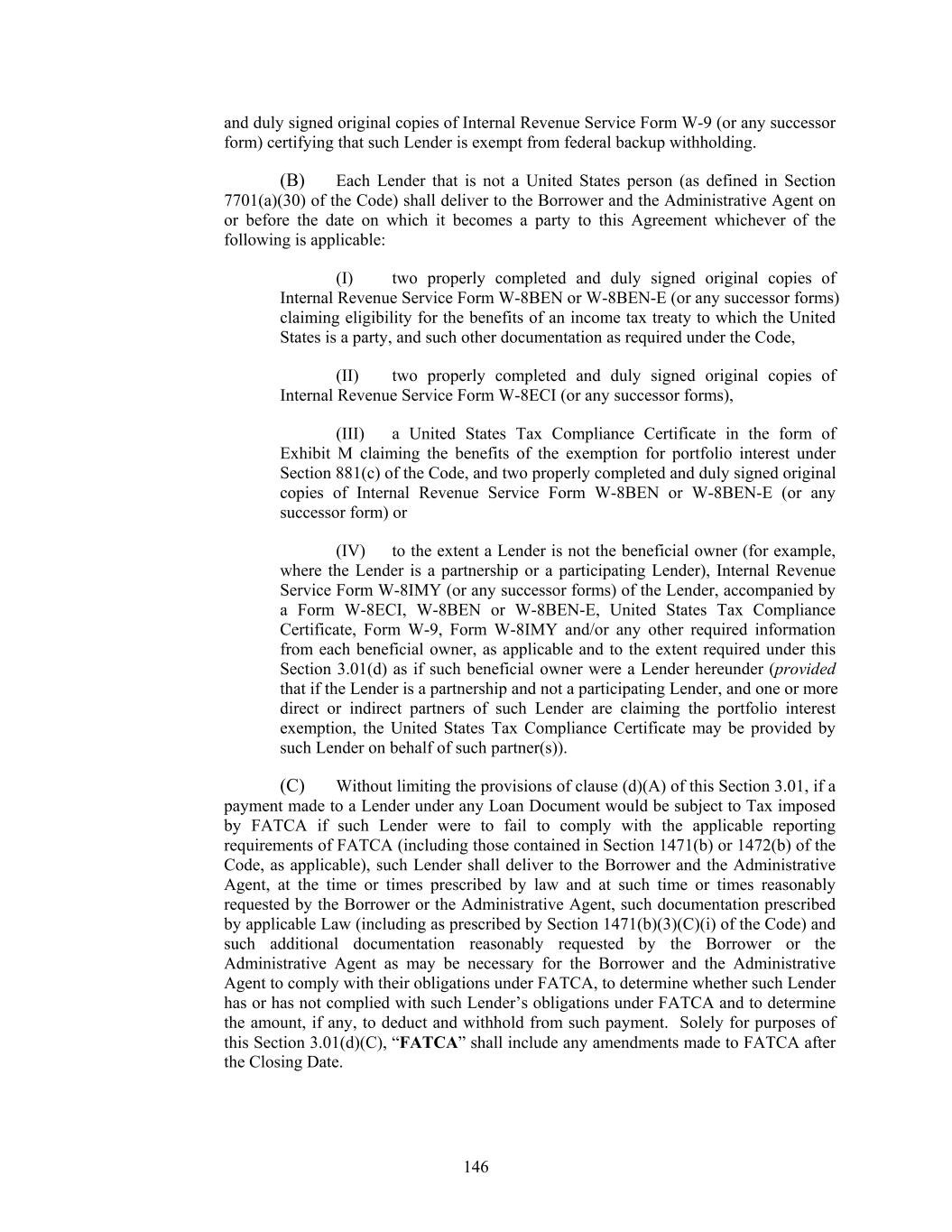 and duly signed original copies of Internal Revenue Service Form W-9 (or any successorform) certifying that such Lender is exempt from federal backup withholding.(B) Each Lender that is not a United States person (as defined in Section7701(a)(30) of the Code) shall deliver to the Borrower and the Administrative Agent onor before the date on which it becomes a party to this Agreement whichever of thefollowing is applicable:(I) two properly completed and duly signed original copies ofInternal Revenue Service Form W-8BEN or W-8BEN-E (or any successor forms)claiming eligibility for the benefits of an income tax treaty to which the UnitedStates is a party, and such other documentation as required under the Code,(II) two properly completed and duly signed original copies ofInternal Revenue Service Form W-8ECI (or any successor forms),(III) a United States Tax Compliance Certificate in the form ofExhibit M claiming the benefits of the exemption for portfolio interest underSection 881(c) of the Code, and two properly completed and duly signed originalcopies of Internal Revenue Service Form W-8BEN or W-8BEN-E (or anysuccessor form) or(IV) to the extent a Lender is not the beneficial owner (for example,where the Lender is a partnership or a participating Lender), Internal RevenueService Form W-8IMY (or any successor forms) of the Lender, accompanied bya Form W-8ECI, W-8BEN or W-8BEN-E, United States Tax ComplianceCertificate, Form W-9, Form W-8IMY and/or any other required informationfrom each beneficial owner, as applicable and to the extent required under thisSection 3.01(d) as if such beneficial owner were a Lender hereunder (providedthat if the Lender is a partnership and not a participating Lender, and one or moredirect or indirect partners of such Lender are claiming the portfolio interestexemption, the United States Tax Compliance Certificate may be provided bysuch Lender on behalf of such partner(s)).(C) Without limiting the provisions of clause (d)(A) of this Section 3.01, if apayment made to a Lender under any Loan Document would be subject to Tax imposedby FATCA if such Lender were to fail to comply with the applicable reportingrequirements of FATCA (including those contained in Section 1471(b) or 1472(b) of theCode, as applicable), such Lender shall deliver to the Borrower and the AdministrativeAgent, at the time or times prescribed by law and at such time or times reasonablyrequested by the Borrower or the Administrative Agent, such documentation prescribedby applicable Law (including as prescribed by Section 1471(b)(3)(C)(i) of the Code) andsuch additional documentation reasonably requested by the Borrower or theAdministrative Agent as may be necessary for the Borrower and the AdministrativeAgent to comply with their obligations under FATCA, to determine whether such Lenderhas or has not complied with such Lender’s obligations under FATCA and to determinethe amount, if any, to deduct and withhold from such payment. Solely for purposes ofthis Section 3.01(d)(C), “FATCA” shall include any amendments made to FATCA afterthe Closing Date. 146