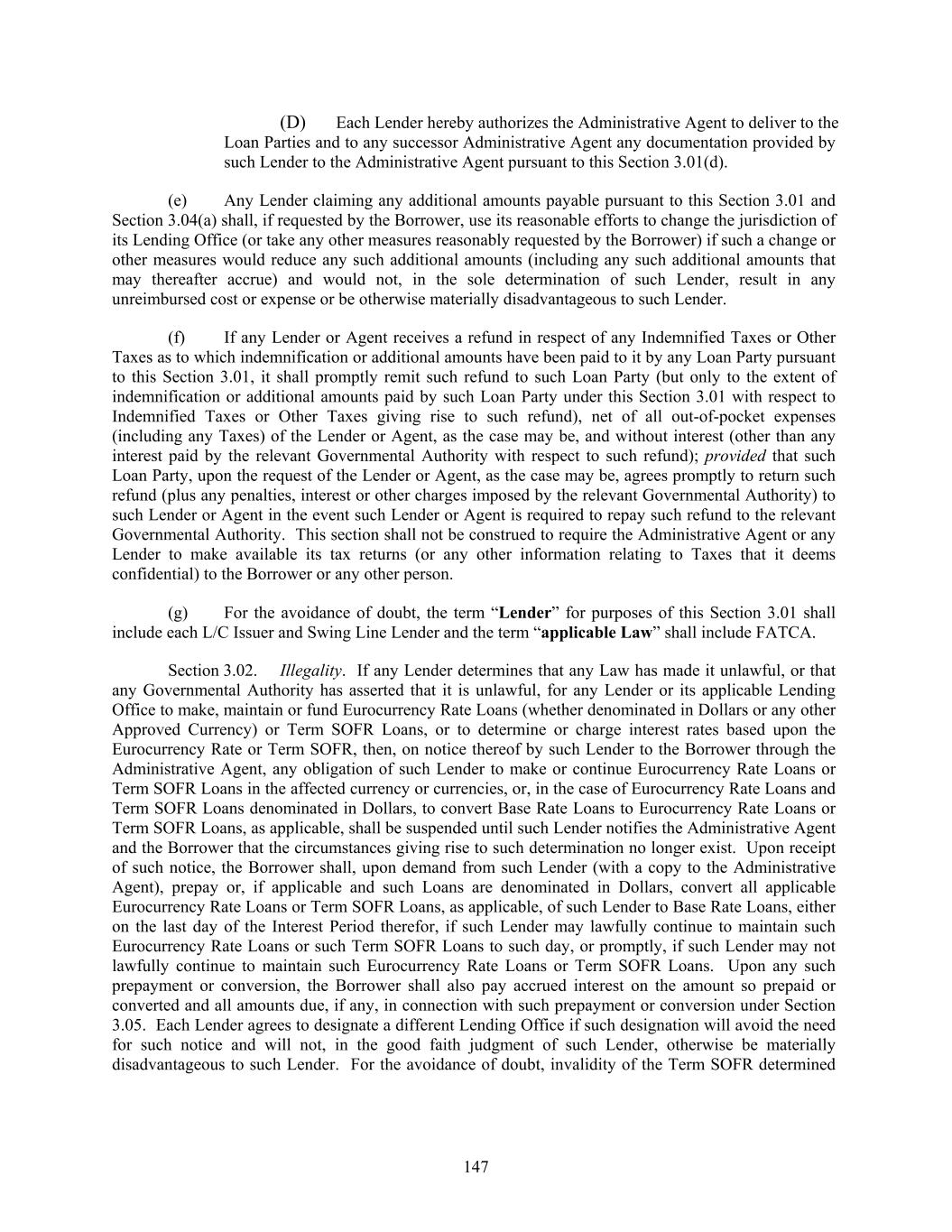 (D) Each Lender hereby authorizes the Administrative Agent to deliver to theLoan Parties and to any successor Administrative Agent any documentation provided bysuch Lender to the Administrative Agent pursuant to this Section 3.01(d).(e) Any Lender claiming any additional amounts payable pursuant to this Section 3.01 and Section 3.04(a) shall, if requested by the Borrower, use its reasonable efforts to change the jurisdiction ofits Lending Office (or take any other measures reasonably requested by the Borrower) if such a change orother measures would reduce any such additional amounts (including any such additional amounts thatmay thereafter accrue) and would not, in the sole determination of such Lender, result in anyunreimbursed cost or expense or be otherwise materially disadvantageous to such Lender.(f) If any Lender or Agent receives a refund in respect of any Indemnified Taxes or OtherTaxes as to which indemnification or additional amounts have been paid to it by any Loan Party pursuantto this Section 3.01, it shall promptly remit such refund to such Loan Party (but only to the extent ofindemnification or additional amounts paid by such Loan Party under this Section 3.01 with respect toIndemnified Taxes or Other Taxes giving rise to such refund), net of all out-of-pocket expenses(including any Taxes) of the Lender or Agent, as the case may be, and without interest (other than anyinterest paid by the relevant Governmental Authority with respect to such refund); provided that suchLoan Party, upon the request of the Lender or Agent, as the case may be, agrees promptly to return suchrefund (plus any penalties, interest or other charges imposed by the relevant Governmental Authority) tosuch Lender or Agent in the event such Lender or Agent is required to repay such refund to the relevantGovernmental Authority. This section shall not be construed to require the Administrative Agent or anyLender to make available its tax returns (or any other information relating to Taxes that it deemsconfidential) to the Borrower or any other person.(g) For the avoidance of doubt, the term “Lender” for purposes of this Section 3.01 shallinclude each L/C Issuer and Swing Line Lender and the term “applicable Law” shall include FATCA.Section 3.02. Illegality. If any Lender determines that any Law has made it unlawful, or thatany Governmental Authority has asserted that it is unlawful, for any Lender or its applicable LendingOffice to make, maintain or fund Eurocurrency Rate Loans (whether denominated in Dollars or any otherApproved Currency) or Term SOFR Loans, or to determine or charge interest rates based upon theEurocurrency Rate or Term SOFR, then, on notice thereof by such Lender to the Borrower through theAdministrative Agent, any obligation of such Lender to make or continue Eurocurrency Rate Loans orTerm SOFR Loans in the affected currency or currencies, or, in the case of Eurocurrency Rate Loans andTerm SOFR Loans denominated in Dollars, to convert Base Rate Loans to Eurocurrency Rate Loans orTerm SOFR Loans, as applicable, shall be suspended until such Lender notifies the Administrative Agentand the Borrower that the circumstances giving rise to such determination no longer exist. Upon receiptof such notice, the Borrower shall, upon demand from such Lender (with a copy to the AdministrativeAgent), prepay or, if applicable and such Loans are denominated in Dollars, convert all applicableEurocurrency Rate Loans or Term SOFR Loans, as applicable, of such Lender to Base Rate Loans, eitheron the last day of the Interest Period therefor, if such Lender may lawfully continue to maintain suchEurocurrency Rate Loans or such Term SOFR Loans to such day, or promptly, if such Lender may notlawfully continue to maintain such Eurocurrency Rate Loans or Term SOFR Loans. Upon any suchprepayment or conversion, the Borrower shall also pay accrued interest on the amount so prepaid orconverted and all amounts due, if any, in connection with such prepayment or conversion under Section3.05. Each Lender agrees to designate a different Lending Office if such designation will avoid the needfor such notice and will not, in the good faith judgment of such Lender, otherwise be materiallydisadvantageous to such Lender. For the avoidance of doubt, invalidity of the Term SOFR determined147