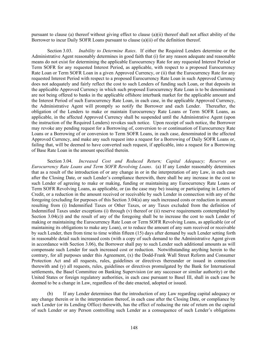 pursuant to clause (a) thereof without giving effect to clause (a)(ii) thereof shall not affect ability of theBorrower to incur Daily SOFR Loans pursuant to clause (a)(ii) of the definition thereof.Section 3.03. Inability to Determine Rates. If either the Required Lenders determine or theAdministrative Agent reasonably determines in good faith that (i) for any reason adequate and reasonablemeans do not exist for determining the applicable Eurocurrency Rate for any requested Interest Period orTerm SOFR for any requested Interest Period, as applicable, with respect to a proposed EurocurrencyRate Loan or Term SOFR Loan in a given Approved Currency, or (ii) that the Eurocurrency Rate for anyrequested Interest Period with respect to a proposed Eurocurrency Rate Loan in such Approved Currencydoes not adequately and fairly reflect the cost to such Lenders of funding such Loan, or that deposits inthe applicable Approved Currency in which such proposed Eurocurrency Rate Loan is to be denominatedare not being offered to banks in the applicable offshore interbank market for the applicable amount andthe Interest Period of such Eurocurrency Rate Loan, in each case, in the applicable Approved Currency,the Administrative Agent will promptly so notify the Borrower and each Lender. Thereafter, theobligation of the Lenders to make or maintain Eurocurrency Rate Loans or Term SOFR Loans, asapplicable, in the affected Approved Currency shall be suspended until the Administrative Agent (uponthe instruction of the Required Lenders) revokes such notice. Upon receipt of such notice, the Borrowermay revoke any pending request for a Borrowing of, conversion to or continuation of Eurocurrency RateLoans or a Borrowing of or conversion to Term SOFR Loans, in each case, denominated in the affectedApproved Currency, and make any such request into a request for a Borrowing of Daily SOFR Loans or,failing that, will be deemed to have converted such request, if applicable, into a request for a Borrowingof Base Rate Loan in the amount specified therein.Section 3.04. Increased Cost and Reduced Return; Capital Adequacy; Reserves onEurocurrency Rate Loans and Term SOFR Revolving Loans. (a) If any Lender reasonably determinesthat as a result of the introduction of or any change in or in the interpretation of any Law, in each caseafter the Closing Date, or such Lender’s compliance therewith, there shall be any increase in the cost tosuch Lender of agreeing to make or making, funding or maintaining any Eurocurrency Rate Loans orTerm SOFR Revolving Loans, as applicable, or (as the case may be) issuing or participating in Letters ofCredit, or a reduction in the amount received or receivable by such Lender in connection with any of theforegoing (excluding for purposes of this Section 3.04(a) any such increased costs or reduction in amountresulting from (i) Indemnified Taxes or Other Taxes, or any Taxes excluded from the definition ofIndemnified Taxes under exceptions (i) through (v) thereof or (ii) reserve requirements contemplated by Section 3.04(c)) and the result of any of the foregoing shall be to increase the cost to such Lender ofmaking or maintaining the Eurocurrency Rate Loan or Term SOFR Revolving Loans, as applicable (or ofmaintaining its obligations to make any Loan), or to reduce the amount of any sum received or receivableby such Lender, then from time to time within fifteen (15) days after demand by such Lender setting forthin reasonable detail such increased costs (with a copy of such demand to the Administrative Agent givenin accordance with Section 3.06), the Borrower shall pay to such Lender such additional amounts as willcompensate such Lender for such increased cost or reduction. Notwithstanding anything herein to thecontrary, for all purposes under this Agreement, (x) the Dodd-Frank Wall Street Reform and ConsumerProtection Act and all requests, rules, guidelines or directives thereunder or issued in connectiontherewith and (y) all requests, rules, guidelines or directives promulgated by the Bank for Internationalsettlements, the Basel Committee on Banking Supervision (or any successor or similar authority) or theUnited States or foreign regulatory authorities, in each case pursuant to Basel III, shall in each case bedeemed to be a change in Law, regardless of the date enacted, adopted or issued.(b) If any Lender determines that the introduction of any Law regarding capital adequacy orany change therein or in the interpretation thereof, in each case after the Closing Date, or compliance bysuch Lender (or its Lending Office) therewith, has the effect of reducing the rate of return on the capitalof such Lender or any Person controlling such Lender as a consequence of such Lender’s obligations148