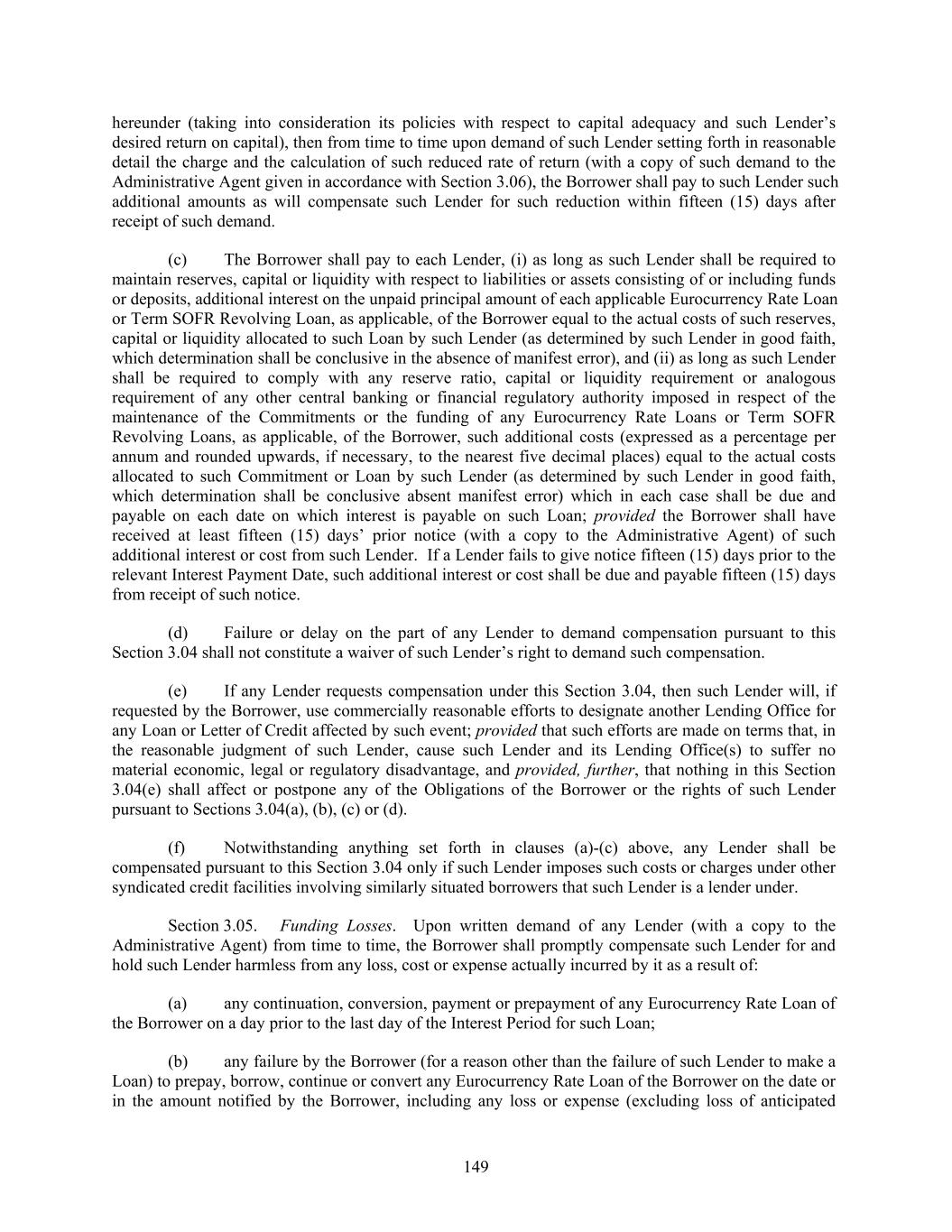 hereunder (taking into consideration its policies with respect to capital adequacy and such Lender’sdesired return on capital), then from time to time upon demand of such Lender setting forth in reasonabledetail the charge and the calculation of such reduced rate of return (with a copy of such demand to theAdministrative Agent given in accordance with Section 3.06), the Borrower shall pay to such Lender suchadditional amounts as will compensate such Lender for such reduction within fifteen (15) days afterreceipt of such demand.(c) The Borrower shall pay to each Lender, (i) as long as such Lender shall be required tomaintain reserves, capital or liquidity with respect to liabilities or assets consisting of or including fundsor deposits, additional interest on the unpaid principal amount of each applicable Eurocurrency Rate Loanor Term SOFR Revolving Loan, as applicable, of the Borrower equal to the actual costs of such reserves,capital or liquidity allocated to such Loan by such Lender (as determined by such Lender in good faith,which determination shall be conclusive in the absence of manifest error), and (ii) as long as such Lendershall be required to comply with any reserve ratio, capital or liquidity requirement or analogousrequirement of any other central banking or financial regulatory authority imposed in respect of themaintenance of the Commitments or the funding of any Eurocurrency Rate Loans or Term SOFRRevolving Loans, as applicable, of the Borrower, such additional costs (expressed as a percentage perannum and rounded upwards, if necessary, to the nearest five decimal places) equal to the actual costsallocated to such Commitment or Loan by such Lender (as determined by such Lender in good faith,which determination shall be conclusive absent manifest error) which in each case shall be due andpayable on each date on which interest is payable on such Loan; provided the Borrower shall havereceived at least fifteen (15) days’ prior notice (with a copy to the Administrative Agent) of suchadditional interest or cost from such Lender. If a Lender fails to give notice fifteen (15) days prior to therelevant Interest Payment Date, such additional interest or cost shall be due and payable fifteen (15) daysfrom receipt of such notice.(d) Failure or delay on the part of any Lender to demand compensation pursuant to this Section 3.04 shall not constitute a waiver of such Lender’s right to demand such compensation.(e) If any Lender requests compensation under this Section 3.04, then such Lender will, ifrequested by the Borrower, use commercially reasonable efforts to designate another Lending Office forany Loan or Letter of Credit affected by such event; provided that such efforts are made on terms that, inthe reasonable judgment of such Lender, cause such Lender and its Lending Office(s) to suffer nomaterial economic, legal or regulatory disadvantage, and provided, further, that nothing in this Section3.04(e) shall affect or postpone any of the Obligations of the Borrower or the rights of such Lenderpursuant to Sections 3.04 (a), (b), (c) or (d).(f) Notwithstanding anything set forth in clauses (a)-(c) above, any Lender shall becompensated pursuant to this Section 3.04 only if such Lender imposes such costs or charges under othersyndicated credit facilities involving similarly situated borrowers that such Lender is a lender under.Section 3.05. Funding Losses. Upon written demand of any Lender (with a copy to theAdministrative Agent) from time to time, the Borrower shall promptly compensate such Lender for andhold such Lender harmless from any loss, cost or expense actually incurred by it as a result of:(a) any continuation, conversion, payment or prepayment of any Eurocurrency Rate Loan ofthe Borrower on a day prior to the last day of the Interest Period for such Loan;(b) any failure by the Borrower (for a reason other than the failure of such Lender to make aLoan) to prepay, borrow, continue or convert any Eurocurrency Rate Loan of the Borrower on the date orin the amount notified by the Borrower, including any loss or expense (excluding loss of anticipated149