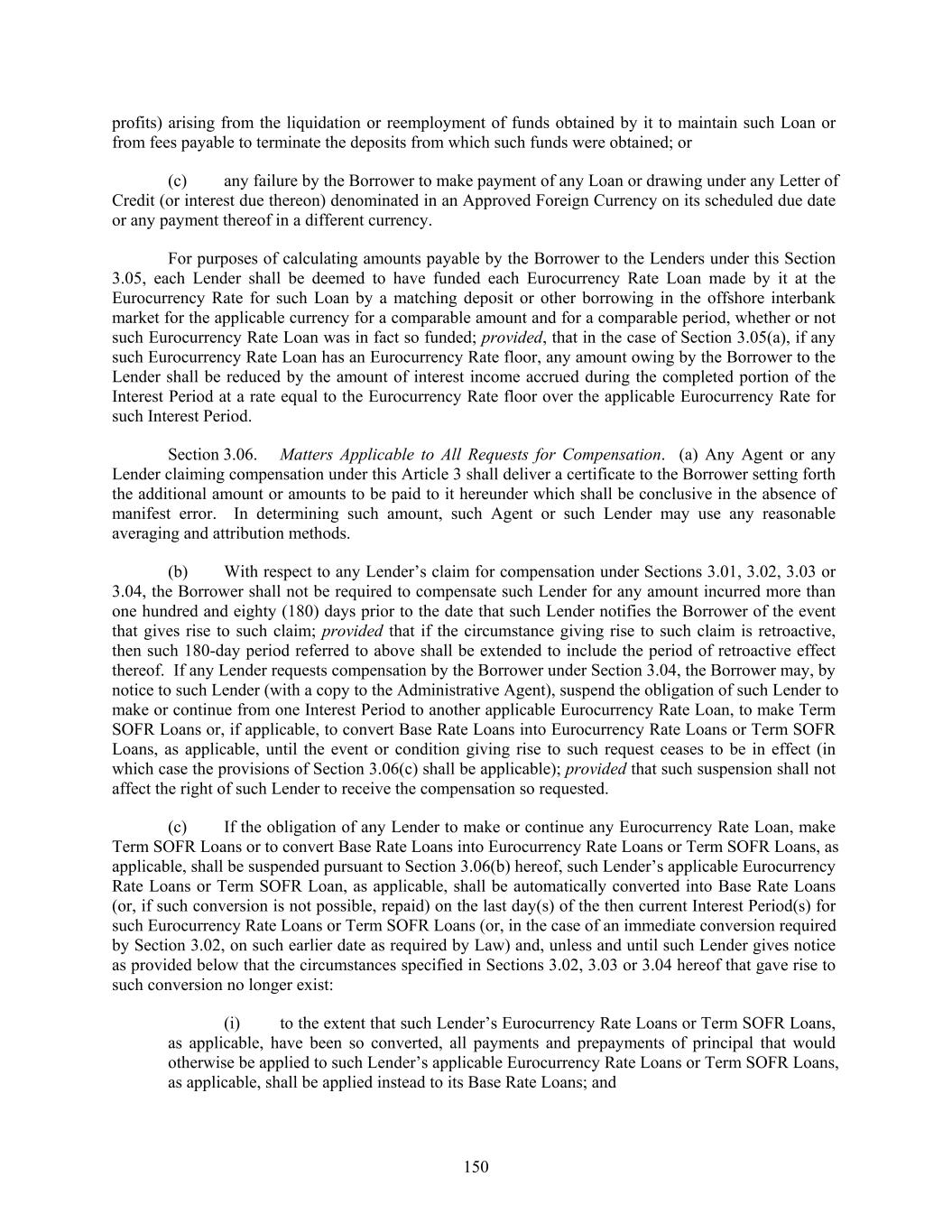 profits) arising from the liquidation or reemployment of funds obtained by it to maintain such Loan orfrom fees payable to terminate the deposits from which such funds were obtained; or(c) any failure by the Borrower to make payment of any Loan or drawing under any Letter ofCredit (or interest due thereon) denominated in an Approved Foreign Currency on its scheduled due dateor any payment thereof in a different currency.For purposes of calculating amounts payable by the Borrower to the Lenders under this Section3.05, each Lender shall be deemed to have funded each Eurocurrency Rate Loan made by it at theEurocurrency Rate for such Loan by a matching deposit or other borrowing in the offshore interbankmarket for the applicable currency for a comparable amount and for a comparable period, whether or notsuch Eurocurrency Rate Loan was in fact so funded; provided, that in the case of Section 3.05(a), if anysuch Eurocurrency Rate Loan has an Eurocurrency Rate floor, any amount owing by the Borrower to theLender shall be reduced by the amount of interest income accrued during the completed portion of theInterest Period at a rate equal to the Eurocurrency Rate floor over the applicable Eurocurrency Rate forsuch Interest Period.Section 3.06. Matters Applicable to All Requests for Compensation. (a) Any Agent or anyLender claiming compensation under this Article 3 shall deliver a certificate to the Borrower setting forththe additional amount or amounts to be paid to it hereunder which shall be conclusive in the absence ofmanifest error. In determining such amount, such Agent or such Lender may use any reasonableaveraging and attribution methods.(b) With respect to any Lender’s claim for compensation under Sections 3.01, 3.02, 3.03 or 3.04, the Borrower shall not be required to compensate such Lender for any amount incurred more thanone hundred and eighty (180) days prior to the date that such Lender notifies the Borrower of the eventthat gives rise to such claim; provided that if the circumstance giving rise to such claim is retroactive,then such 180-day period referred to above shall be extended to include the period of retroactive effectthereof. If any Lender requests compensation by the Borrower under Section 3.04, the Borrower may, bynotice to such Lender (with a copy to the Administrative Agent), suspend the obligation of such Lender tomake or continue from one Interest Period to another applicable Eurocurrency Rate Loan, to make TermSOFR Loans or, if applicable, to convert Base Rate Loans into Eurocurrency Rate Loans or Term SOFRLoans, as applicable, until the event or condition giving rise to such request ceases to be in effect (inwhich case the provisions of Section 3.06(c) shall be applicable); provided that such suspension shall notaffect the right of such Lender to receive the compensation so requested.(c) If the obligation of any Lender to make or continue any Eurocurrency Rate Loan, makeTerm SOFR Loans or to convert Base Rate Loans into Eurocurrency Rate Loans or Term SOFR Loans, asapplicable, shall be suspended pursuant to Section 3.06(b) hereof, such Lender’s applicable EurocurrencyRate Loans or Term SOFR Loan, as applicable, shall be automatically converted into Base Rate Loans(or, if such conversion is not possible, repaid) on the last day(s) of the then current Interest Period(s) forsuch Eurocurrency Rate Loans or Term SOFR Loans (or, in the case of an immediate conversion requiredby Section 3.02, on such earlier date as required by Law) and, unless and until such Lender gives noticeas provided below that the circumstances specified in Sections 3.02, 3.03 or 3.04 hereof that gave rise tosuch conversion no longer exist:(i) to the extent that such Lender’s Eurocurrency Rate Loans or Term SOFR Loans,as applicable, have been so converted, all payments and prepayments of principal that wouldotherwise be applied to such Lender’s applicable Eurocurrency Rate Loans or Term SOFR Loans,as applicable, shall be applied instead to its Base Rate Loans; and150