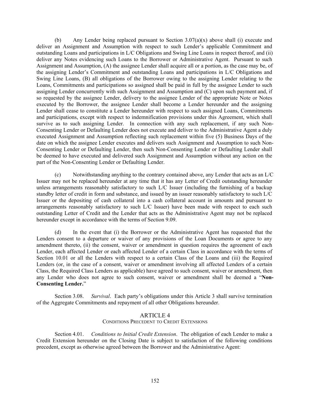 (b) Any Lender being replaced pursuant to Section 3.07(a)(x) above shall (i) execute anddeliver an Assignment and Assumption with respect to such Lender’s applicable Commitment andoutstanding Loans and participations in L/C Obligations and Swing Line Loans in respect thereof, and (ii)deliver any Notes evidencing such Loans to the Borrower or Administrative Agent. Pursuant to suchAssignment and Assumption, (A) the assignee Lender shall acquire all or a portion, as the case may be, ofthe assigning Lender’s Commitment and outstanding Loans and participations in L/C Obligations andSwing Line Loans, (B) all obligations of the Borrower owing to the assigning Lender relating to theLoans, Commitments and participations so assigned shall be paid in full by the assignee Lender to suchassigning Lender concurrently with such Assignment and Assumption and (C) upon such payment and, ifso requested by the assignee Lender, delivery to the assignee Lender of the appropriate Note or Notesexecuted by the Borrower, the assignee Lender shall become a Lender hereunder and the assigningLender shall cease to constitute a Lender hereunder with respect to such assigned Loans, Commitmentsand participations, except with respect to indemnification provisions under this Agreement, which shallsurvive as to such assigning Lender. In connection with any such replacement, if any such Non-Consenting Lender or Defaulting Lender does not execute and deliver to the Administrative Agent a dulyexecuted Assignment and Assumption reflecting such replacement within five (5) Business Days of thedate on which the assignee Lender executes and delivers such Assignment and Assumption to such Non-Consenting Lender or Defaulting Lender, then such Non-Consenting Lender or Defaulting Lender shallbe deemed to have executed and delivered such Assignment and Assumption without any action on thepart of the Non-Consenting Lender or Defaulting Lender.(c) Notwithstanding anything to the contrary contained above, any Lender that acts as an L/CIssuer may not be replaced hereunder at any time that it has any Letter of Credit outstanding hereunderunless arrangements reasonably satisfactory to such L/C Issuer (including the furnishing of a backupstandby letter of credit in form and substance, and issued by an issuer reasonably satisfactory to such L/CIssuer or the depositing of cash collateral into a cash collateral account in amounts and pursuant toarrangements reasonably satisfactory to such L/C Issuer) have been made with respect to each suchoutstanding Letter of Credit and the Lender that acts as the Administrative Agent may not be replacedhereunder except in accordance with the terms of Section 9.09.(d) In the event that (i) the Borrower or the Administrative Agent has requested that theLenders consent to a departure or waiver of any provisions of the Loan Documents or agree to anyamendment thereto, (ii) the consent, waiver or amendment in question requires the agreement of eachLender, each affected Lender or each affected Lender of a certain Class in accordance with the terms of Section 10.01 or all the Lenders with respect to a certain Class of the Loans and (iii) the RequiredLenders (or, in the case of a consent, waiver or amendment involving all affected Lenders of a certainClass, the Required Class Lenders as applicable) have agreed to such consent, waiver or amendment, thenany Lender who does not agree to such consent, waiver or amendment shall be deemed a “Non-Consenting Lender.”Section 3.08. Survival. Each party’s obligations under this Article 3 shall survive terminationof the Aggregate Commitments and repayment of all other Obligations hereunder.ARTICLE 4CONDITIONS PRECEDENT TO CREDIT EXTENSIONSSection 4.01. Conditions to Initial Credit Extension. The obligation of each Lender to make aCredit Extension hereunder on the Closing Date is subject to satisfaction of the following conditionsprecedent, except as otherwise agreed between the Borrower and the Administrative Agent:152