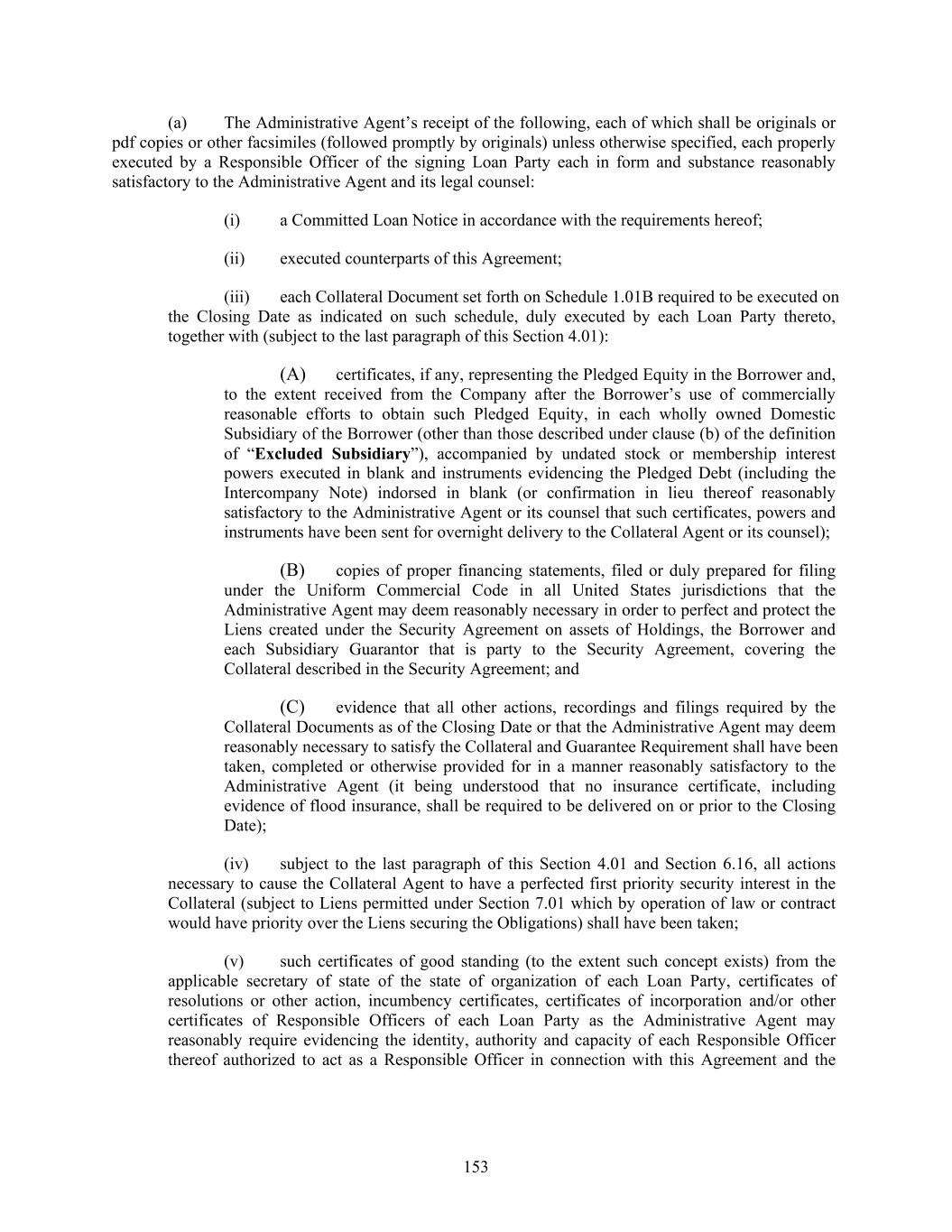 (a) The Administrative Agent’s receipt of the following, each of which shall be originals orpdf copies or other facsimiles (followed promptly by originals) unless otherwise specified, each properlyexecuted by a Responsible Officer of the signing Loan Party each in form and substance reasonablysatisfactory to the Administrative Agent and its legal counsel:(i) a Committed Loan Notice in accordance with the requirements hereof;(ii) executed counterparts of this Agreement;(iii) each Collateral Document set forth on Schedule 1.01B required to be executed onthe Closing Date as indicated on such schedule, duly executed by each Loan Party thereto,together with (subject to the last paragraph of this Section 4.01):(A) certificates, if any, representing the Pledged Equity in the Borrower and,to the extent received from the Company after the Borrower’s use of commerciallyreasonable efforts to obtain such Pledged Equity, in each wholly owned DomesticSubsidiary of the Borrower (other than those described under clause (b) of the definitionof “Excluded Subsidiary”), accompanied by undated stock or membership interestpowers executed in blank and instruments evidencing the Pledged Debt (including theIntercompany Note) indorsed in blank (or confirmation in lieu thereof reasonablysatisfactory to the Administrative Agent or its counsel that such certificates, powers andinstruments have been sent for overnight delivery to the Collateral Agent or its counsel);(B) copies of proper financing statements, filed or duly prepared for filingunder the Uniform Commercial Code in all United States jurisdictions that theAdministrative Agent may deem reasonably necessary in order to perfect and protect theLiens created under the Security Agreement on assets of Holdings, the Borrower andeach Subsidiary Guarantor that is party to the Security Agreement, covering theCollateral described in the Security Agreement; and(C) evidence that all other actions, recordings and filings required by theCollateral Documents as of the Closing Date or that the Administrative Agent may deemreasonably necessary to satisfy the Collateral and Guarantee Requirement shall have beentaken, completed or otherwise provided for in a manner reasonably satisfactory to theAdministrative Agent (it being understood that no insurance certificate, includingevidence of flood insurance, shall be required to be delivered on or prior to the ClosingDate);(iv) subject to the last paragraph of this Section 4.01 and Section 6.16, all actionsnecessary to cause the Collateral Agent to have a perfected first priority security interest in theCollateral (subject to Liens permitted under Section 7.01 which by operation of law or contractwould have priority over the Liens securing the Obligations) shall have been taken;(v) such certificates of good standing (to the extent such concept exists) from theapplicable secretary of state of the state of organization of each Loan Party, certificates ofresolutions or other action, incumbency certificates, certificates of incorporation and/or othercertificates of Responsible Officers of each Loan Party as the Administrative Agent mayreasonably require evidencing the identity, authority and capacity of each Responsible Officerthereof authorized to act as a Responsible Officer in connection with this Agreement and the153