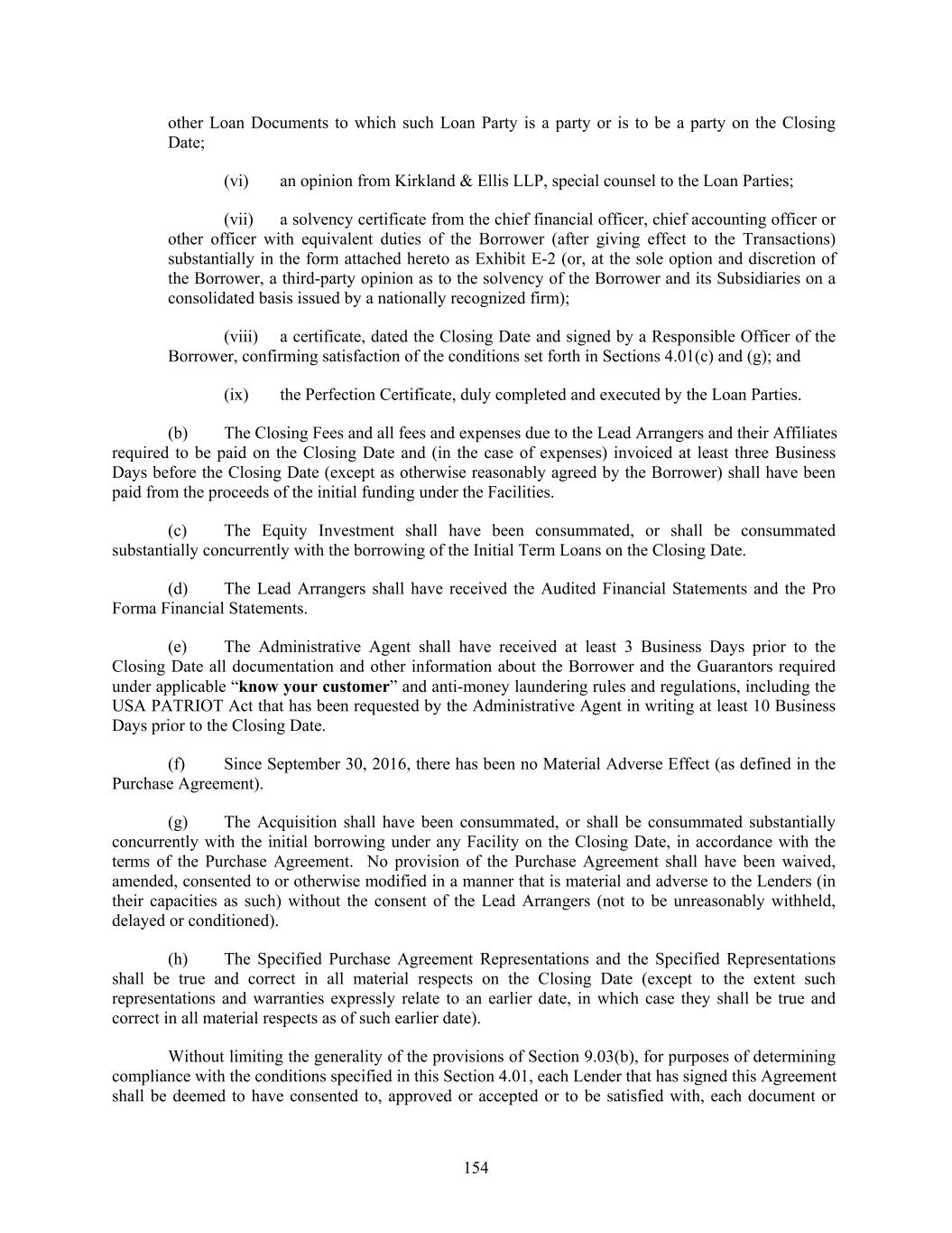 other Loan Documents to which such Loan Party is a party or is to be a party on the ClosingDate; (vi) an opinion from Kirkland & Ellis LLP, special counsel to the Loan Parties;(vii) a solvency certificate from the chief financial officer, chief accounting officer orother officer with equivalent duties of the Borrower (after giving effect to the Transactions)substantially in the form attached hereto as Exhibit E-2 (or, at the sole option and discretion ofthe Borrower, a third-party opinion as to the solvency of the Borrower and its Subsidiaries on aconsolidated basis issued by a nationally recognized firm);(viii) a certificate, dated the Closing Date and signed by a Responsible Officer of theBorrower, confirming satisfaction of the conditions set forth in Sections 4.01(c) and (g); and(ix) the Perfection Certificate, duly completed and executed by the Loan Parties.(b) The Closing Fees and all fees and expenses due to the Lead Arrangers and their Affiliatesrequired to be paid on the Closing Date and (in the case of expenses) invoiced at least three BusinessDays before the Closing Date (except as otherwise reasonably agreed by the Borrower) shall have beenpaid from the proceeds of the initial funding under the Facilities.(c) The Equity Investment shall have been consummated, or shall be consummatedsubstantially concurrently with the borrowing of the Initial Term Loans on the Closing Date.(d) The Lead Arrangers shall have received the Audited Financial Statements and the ProForma Financial Statements.(e) The Administrative Agent shall have received at least 3 Business Days prior to theClosing Date all documentation and other information about the Borrower and the Guarantors requiredunder applicable “know your customer” and anti-money laundering rules and regulations, including theUSA PATRIOT Act that has been requested by the Administrative Agent in writing at least 10 BusinessDays prior to the Closing Date.(f) Since September 30, 2016, there has been no Material Adverse Effect (as defined in thePurchase Agreement).(g) The Acquisition shall have been consummated, or shall be consummated substantiallyconcurrently with the initial borrowing under any Facility on the Closing Date, in accordance with theterms of the Purchase Agreement. No provision of the Purchase Agreement shall have been waived,amended, consented to or otherwise modified in a manner that is material and adverse to the Lenders (intheir capacities as such) without the consent of the Lead Arrangers (not to be unreasonably withheld,delayed or conditioned).(h) The Specified Purchase Agreement Representations and the Specified Representationsshall be true and correct in all material respects on the Closing Date (except to the extent suchrepresentations and warranties expressly relate to an earlier date, in which case they shall be true andcorrect in all material respects as of such earlier date).Without limiting the generality of the provisions of Section 9.03(b), for purposes of determiningcompliance with the conditions specified in this Section 4.01, each Lender that has signed this Agreementshall be deemed to have consented to, approved or accepted or to be satisfied with, each document or154