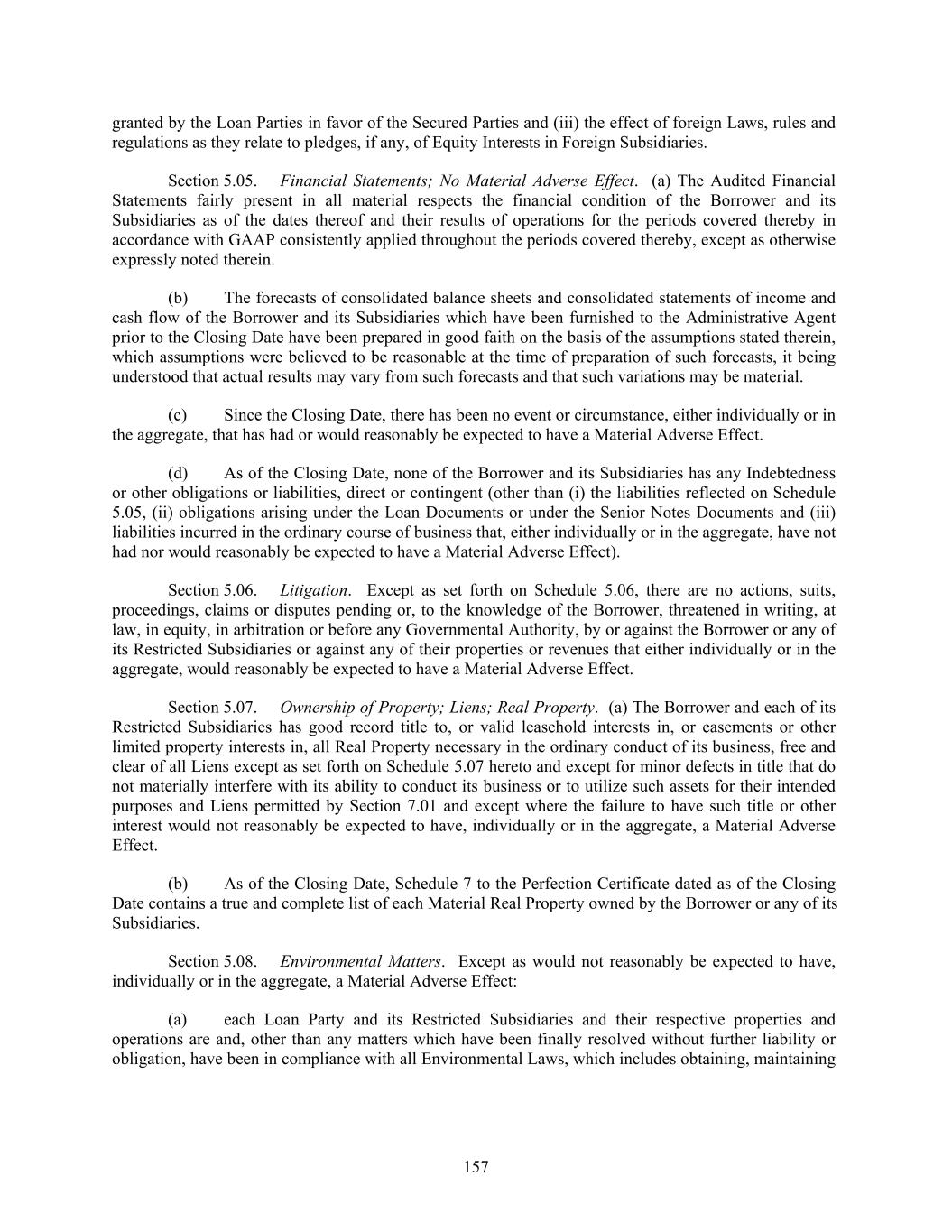 granted by the Loan Parties in favor of the Secured Parties and (iii) the effect of foreign Laws, rules andregulations as they relate to pledges, if any, of Equity Interests in Foreign Subsidiaries.Section 5.05. Financial Statements; No Material Adverse Effect. (a) The Audited FinancialStatements fairly present in all material respects the financial condition of the Borrower and itsSubsidiaries as of the dates thereof and their results of operations for the periods covered thereby inaccordance with GAAP consistently applied throughout the periods covered thereby, except as otherwiseexpressly noted therein.(b) The forecasts of consolidated balance sheets and consolidated statements of income andcash flow of the Borrower and its Subsidiaries which have been furnished to the Administrative Agentprior to the Closing Date have been prepared in good faith on the basis of the assumptions stated therein,which assumptions were believed to be reasonable at the time of preparation of such forecasts, it beingunderstood that actual results may vary from such forecasts and that such variations may be material.(c) Since the Closing Date, there has been no event or circumstance, either individually or inthe aggregate, that has had or would reasonably be expected to have a Material Adverse Effect.(d) As of the Closing Date, none of the Borrower and its Subsidiaries has any Indebtednessor other obligations or liabilities, direct or contingent (other than (i) the liabilities reflected on Schedule5.05, (ii) obligations arising under the Loan Documents or under the Senior Notes Documents and (iii)liabilities incurred in the ordinary course of business that, either individually or in the aggregate, have nothad nor would reasonably be expected to have a Material Adverse Effect).Section 5.06. Litigation. Except as set forth on Schedule 5.06, there are no actions, suits,proceedings, claims or disputes pending or, to the knowledge of the Borrower, threatened in writing, atlaw, in equity, in arbitration or before any Governmental Authority, by or against the Borrower or any ofits Restricted Subsidiaries or against any of their properties or revenues that either individually or in theaggregate, would reasonably be expected to have a Material Adverse Effect.Section 5.07. Ownership of Property; Liens; Real Property. (a) The Borrower and each of itsRestricted Subsidiaries has good record title to, or valid leasehold interests in, or easements or otherlimited property interests in, all Real Property necessary in the ordinary conduct of its business, free andclear of all Liens except as set forth on Schedule 5.07 hereto and except for minor defects in title that donot materially interfere with its ability to conduct its business or to utilize such assets for their intendedpurposes and Liens permitted by Section 7.01 and except where the failure to have such title or otherinterest would not reasonably be expected to have, individually or in the aggregate, a Material AdverseEffect. (b) As of the Closing Date, Schedule 7 to the Perfection Certificate dated as of the ClosingDate contains a true and complete list of each Material Real Property owned by the Borrower or any of itsSubsidiaries.Section 5.08. Environmental Matters. Except as would not reasonably be expected to have,individually or in the aggregate, a Material Adverse Effect:(a) each Loan Party and its Restricted Subsidiaries and their respective properties andoperations are and, other than any matters which have been finally resolved without further liability orobligation, have been in compliance with all Environmental Laws, which includes obtaining, maintaining157