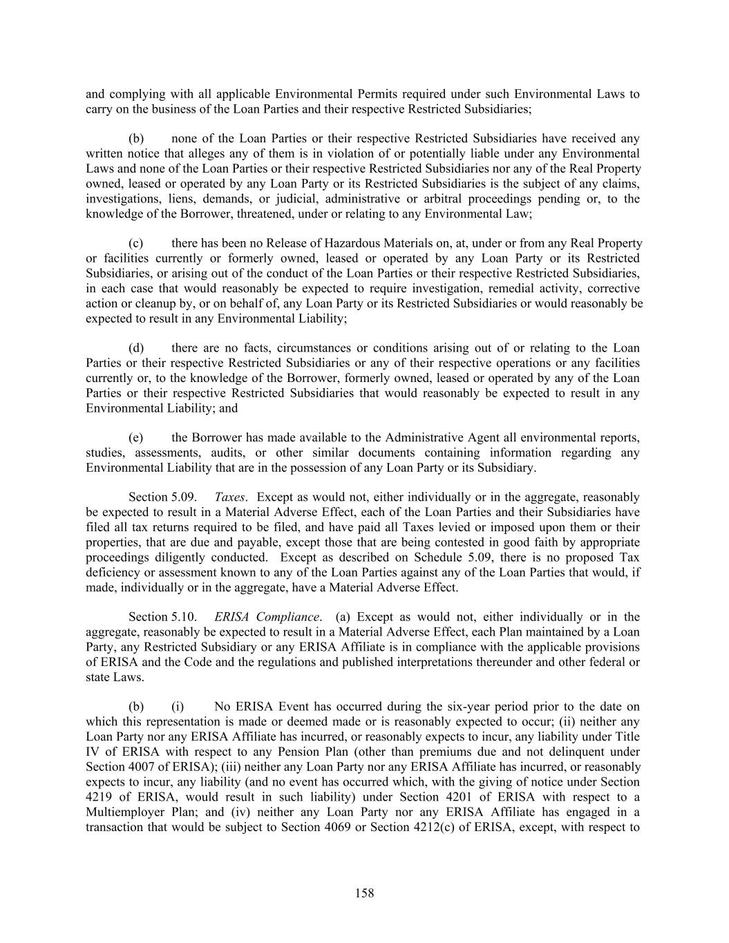 and complying with all applicable Environmental Permits required under such Environmental Laws tocarry on the business of the Loan Parties and their respective Restricted Subsidiaries;(b) none of the Loan Parties or their respective Restricted Subsidiaries have received anywritten notice that alleges any of them is in violation of or potentially liable under any EnvironmentalLaws and none of the Loan Parties or their respective Restricted Subsidiaries nor any of the Real Propertyowned, leased or operated by any Loan Party or its Restricted Subsidiaries is the subject of any claims,investigations, liens, demands, or judicial, administrative or arbitral proceedings pending or, to theknowledge of the Borrower, threatened, under or relating to any Environmental Law;(c) there has been no Release of Hazardous Materials on, at, under or from any Real Propertyor facilities currently or formerly owned, leased or operated by any Loan Party or its RestrictedSubsidiaries, or arising out of the conduct of the Loan Parties or their respective Restricted Subsidiaries,in each case that would reasonably be expected to require investigation, remedial activity, correctiveaction or cleanup by, or on behalf of, any Loan Party or its Restricted Subsidiaries or would reasonably beexpected to result in any Environmental Liability;(d) there are no facts, circumstances or conditions arising out of or relating to the LoanParties or their respective Restricted Subsidiaries or any of their respective operations or any facilitiescurrently or, to the knowledge of the Borrower, formerly owned, leased or operated by any of the LoanParties or their respective Restricted Subsidiaries that would reasonably be expected to result in anyEnvironmental Liability; and(e) the Borrower has made available to the Administrative Agent all environmental reports,studies, assessments, audits, or other similar documents containing information regarding anyEnvironmental Liability that are in the possession of any Loan Party or its Subsidiary.Section 5.09. Taxes. Except as would not, either individually or in the aggregate, reasonablybe expected to result in a Material Adverse Effect, each of the Loan Parties and their Subsidiaries havefiled all tax returns required to be filed, and have paid all Taxes levied or imposed upon them or theirproperties, that are due and payable, except those that are being contested in good faith by appropriateproceedings diligently conducted. Except as described on Schedule 5.09, there is no proposed Taxdeficiency or assessment known to any of the Loan Parties against any of the Loan Parties that would, ifmade, individually or in the aggregate, have a Material Adverse Effect.Section 5.10. ERISA Compliance. (a) Except as would not, either individually or in theaggregate, reasonably be expected to result in a Material Adverse Effect, each Plan maintained by a LoanParty, any Restricted Subsidiary or any ERISA Affiliate is in compliance with the applicable provisionsof ERISA and the Code and the regulations and published interpretations thereunder and other federal orstate Laws.(b) (i) No ERISA Event has occurred during the six-year period prior to the date onwhich this representation is made or deemed made or is reasonably expected to occur; (ii) neither anyLoan Party nor any ERISA Affiliate has incurred, or reasonably expects to incur, any liability under TitleIV of ERISA with respect to any Pension Plan (other than premiums due and not delinquent underSection 4007 of ERISA); (iii) neither any Loan Party nor any ERISA Affiliate has incurred, or reasonablyexpects to incur, any liability (and no event has occurred which, with the giving of notice under Section4219 of ERISA, would result in such liability) under Section 4201 of ERISA with respect to aMultiemployer Plan; and (iv) neither any Loan Party nor any ERISA Affiliate has engaged in atransaction that would be subject to Section 4069 or Section 4212(c) of ERISA, except, with respect to158