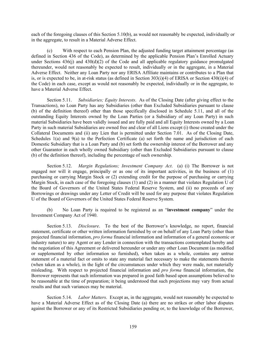 each of the foregoing clauses of this Section 5.10(b), as would not reasonably be expected, individually orin the aggregate, to result in a Material Adverse Effect.(c) With respect to each Pension Plan, the adjusted funding target attainment percentage (asdefined in Section 436 of the Code), as determined by the applicable Pension Plan’s Enrolled Actuaryunder Sections 436(j) and 430(d)(2) of the Code and all applicable regulatory guidance promulgatedthereunder, would not reasonably be expected to result, individually or in the aggregate, in a MaterialAdverse Effect. Neither any Loan Party nor any ERISA Affiliate maintains or contributes to a Plan thatis, or is expected to be, in at-risk status (as defined in Section 303(i)(4) of ERISA or Section 430(i)(4) ofthe Code) in each case, except as would not reasonably be expected, individually or in the aggregate, tohave a Material Adverse Effect.Section 5.11. Subsidiaries; Equity Interests. As of the Closing Date (after giving effect to theTransactions), no Loan Party has any Subsidiaries (other than Excluded Subsidiaries pursuant to clause(b) of the definition thereof) other than those specifically disclosed in Schedule 5.11, and all of theoutstanding Equity Interests owned by the Loan Parties (or a Subsidiary of any Loan Party) in suchmaterial Subsidiaries have been validly issued and are fully paid and all Equity Interests owned by a LoanParty in such material Subsidiaries are owned free and clear of all Liens except (i) those created under theCollateral Documents and (ii) any Lien that is permitted under Section 7.01. As of the Closing Date,Schedules 1(a) and 9(a) to the Perfection Certificate (a) set forth the name and jurisdiction of eachDomestic Subsidiary that is a Loan Party and (b) set forth the ownership interest of the Borrower and anyother Guarantor in each wholly owned Subsidiary (other than Excluded Subsidiaries pursuant to clause(b) of the definition thereof), including the percentage of such ownership.Section 5.12. Margin Regulations; Investment Company Act. (a) (i) The Borrower is notengaged nor will it engage, principally or as one of its important activities, in the business of (1)purchasing or carrying Margin Stock or (2) extending credit for the purpose of purchasing or carryingMargin Stock, in each case of the foregoing clauses (1) and (2) in a manner that violates Regulation U ofthe Board of Governors of the United States Federal Reserve System, and (ii) no proceeds of anyBorrowings or drawings under any Letter of Credit will be used for any purpose that violates RegulationU of the Board of Governors of the United States Federal Reserve System.(b) No Loan Party is required to be registered as an “investment company” under theInvestment Company Act of 1940.Section 5.13. Disclosure. To the best of the Borrower’s knowledge, no report, financialstatement, certificate or other written information furnished by or on behalf of any Loan Party (other thanprojected financial information, pro forma financial information and information of a general economic orindustry nature) to any Agent or any Lender in connection with the transactions contemplated hereby andthe negotiation of this Agreement or delivered hereunder or under any other Loan Document (as modifiedor supplemented by other information so furnished), when taken as a whole, contains any untruestatement of a material fact or omits to state any material fact necessary to make the statements therein(when taken as a whole), in the light of the circumstances under which they were made, not materiallymisleading. With respect to projected financial information and pro forma financial information, theBorrower represents that such information was prepared in good faith based upon assumptions believed tobe reasonable at the time of preparation; it being understood that such projections may vary from actualresults and that such variances may be material.Section 5.14. Labor Matters. Except as, in the aggregate, would not reasonably be expected tohave a Material Adverse Effect as of the Closing Date (a) there are no strikes or other labor disputesagainst the Borrower or any of its Restricted Subsidiaries pending or, to the knowledge of the Borrower,159