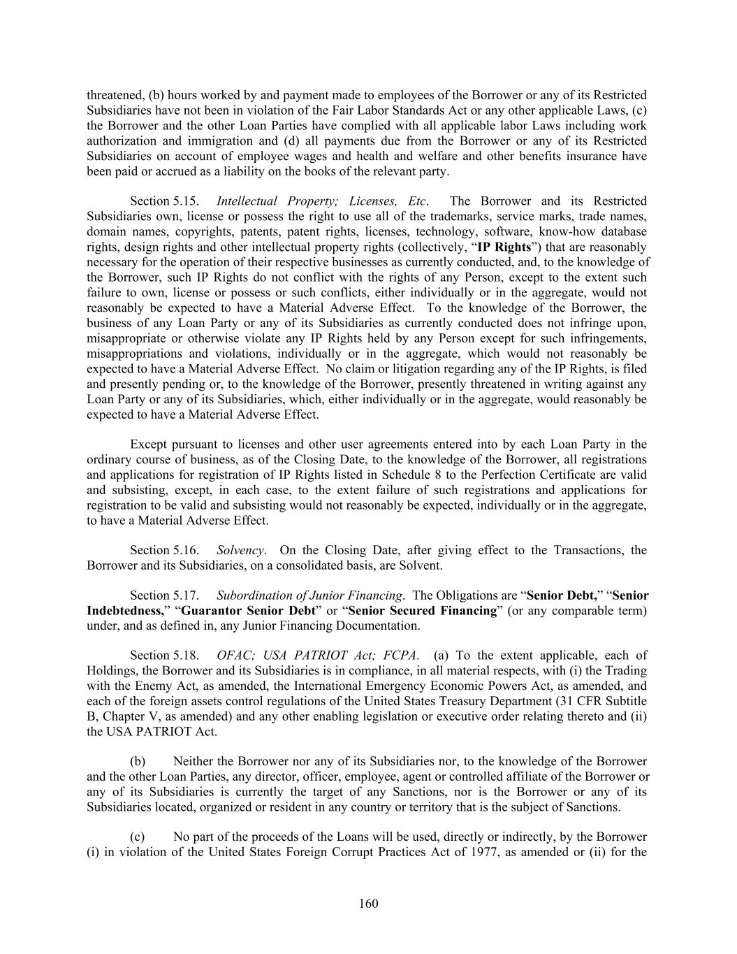 threatened, (b) hours worked by and payment made to employees of the Borrower or any of its RestrictedSubsidiaries have not been in violation of the Fair Labor Standards Act or any other applicable Laws, (c)the Borrower and the other Loan Parties have complied with all applicable labor Laws including workauthorization and immigration and (d) all payments due from the Borrower or any of its RestrictedSubsidiaries on account of employee wages and health and welfare and other benefits insurance havebeen paid or accrued as a liability on the books of the relevant party.Section 5.15. Intellectual Property; Licenses, Etc. The Borrower and its RestrictedSubsidiaries own, license or possess the right to use all of the trademarks, service marks, trade names,domain names, copyrights, patents, patent rights, licenses, technology, software, know-how databaserights, design rights and other intellectual property rights (collectively, “IP Rights”) that are reasonablynecessary for the operation of their respective businesses as currently conducted, and, to the knowledge ofthe Borrower, such IP Rights do not conflict with the rights of any Person, except to the extent suchfailure to own, license or possess or such conflicts, either individually or in the aggregate, would notreasonably be expected to have a Material Adverse Effect. To the knowledge of the Borrower, thebusiness of any Loan Party or any of its Subsidiaries as currently conducted does not infringe upon,misappropriate or otherwise violate any IP Rights held by any Person except for such infringements,misappropriations and violations, individually or in the aggregate, which would not reasonably beexpected to have a Material Adverse Effect. No claim or litigation regarding any of the IP Rights, is filedand presently pending or, to the knowledge of the Borrower, presently threatened in writing against anyLoan Party or any of its Subsidiaries, which, either individually or in the aggregate, would reasonably beexpected to have a Material Adverse Effect.Except pursuant to licenses and other user agreements entered into by each Loan Party in theordinary course of business, as of the Closing Date, to the knowledge of the Borrower, all registrationsand applications for registration of IP Rights listed in Schedule 8 to the Perfection Certificate are validand subsisting, except, in each case, to the extent failure of such registrations and applications forregistration to be valid and subsisting would not reasonably be expected, individually or in the aggregate,to have a Material Adverse Effect.Section 5.16. Solvency. On the Closing Date, after giving effect to the Transactions, theBorrower and its Subsidiaries, on a consolidated basis, are Solvent.Section 5.17. Subordination of Junior Financing. The Obligations are “Senior Debt,” “SeniorIndebtedness,” “Guarantor Senior Debt” or “Senior Secured Financing” (or any comparable term)under, and as defined in, any Junior Financing Documentation.Section 5.18. OFAC; USA PATRIOT Act; FCPA. (a) To the extent applicable, each ofHoldings, the Borrower and its Subsidiaries is in compliance, in all material respects, with (i) the Tradingwith the Enemy Act, as amended, the International Emergency Economic Powers Act, as amended, andeach of the foreign assets control regulations of the United States Treasury Department (31 CFR SubtitleB, Chapter V, as amended) and any other enabling legislation or executive order relating thereto and (ii)the USA PATRIOT Act.(b) Neither the Borrower nor any of its Subsidiaries nor, to the knowledge of the Borrowerand the other Loan Parties, any director, officer, employee, agent or controlled affiliate of the Borrower orany of its Subsidiaries is currently the target of any Sanctions, nor is the Borrower or any of itsSubsidiaries located, organized or resident in any country or territory that is the subject of Sanctions.(c) No part of the proceeds of the Loans will be used, directly or indirectly, by the Borrower(i) in violation of the United States Foreign Corrupt Practices Act of 1977, as amended or (ii) for the160