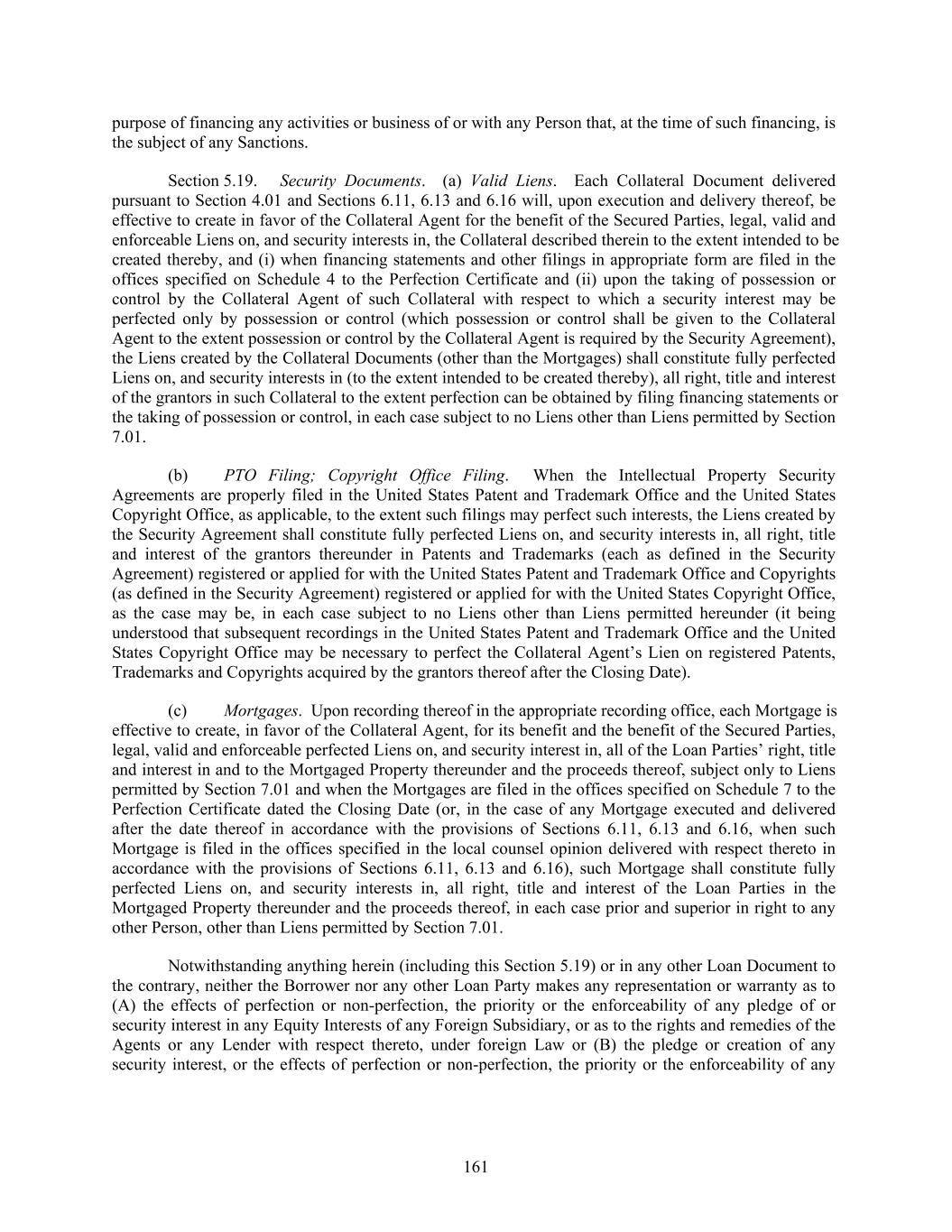 purpose of financing any activities or business of or with any Person that, at the time of such financing, isthe subject of any Sanctions.Section 5.19. Security Documents. (a) Valid Liens. Each Collateral Document deliveredpursuant to Section 4.01 and Sections 6.11, 6.13 and 6.16 will, upon execution and delivery thereof, beeffective to create in favor of the Collateral Agent for the benefit of the Secured Parties, legal, valid andenforceable Liens on, and security interests in, the Collateral described therein to the extent intended to becreated thereby, and (i) when financing statements and other filings in appropriate form are filed in theoffices specified on Schedule 4 to the Perfection Certificate and (ii) upon the taking of possession orcontrol by the Collateral Agent of such Collateral with respect to which a security interest may beperfected only by possession or control (which possession or control shall be given to the CollateralAgent to the extent possession or control by the Collateral Agent is required by the Security Agreement),the Liens created by the Collateral Documents (other than the Mortgages) shall constitute fully perfectedLiens on, and security interests in (to the extent intended to be created thereby), all right, title and interestof the grantors in such Collateral to the extent perfection can be obtained by filing financing statements orthe taking of possession or control, in each case subject to no Liens other than Liens permitted by Section7.01. (b) PTO Filing; Copyright Office Filing. When the Intellectual Property SecurityAgreements are properly filed in the United States Patent and Trademark Office and the United StatesCopyright Office, as applicable, to the extent such filings may perfect such interests, the Liens created bythe Security Agreement shall constitute fully perfected Liens on, and security interests in, all right, titleand interest of the grantors thereunder in Patents and Trademarks (each as defined in the SecurityAgreement) registered or applied for with the United States Patent and Trademark Office and Copyrights(as defined in the Security Agreement) registered or applied for with the United States Copyright Office,as the case may be, in each case subject to no Liens other than Liens permitted hereunder (it beingunderstood that subsequent recordings in the United States Patent and Trademark Office and the UnitedStates Copyright Office may be necessary to perfect the Collateral Agent’s Lien on registered Patents,Trademarks and Copyrights acquired by the grantors thereof after the Closing Date).(c) Mortgages. Upon recording thereof in the appropriate recording office, each Mortgage iseffective to create, in favor of the Collateral Agent, for its benefit and the benefit of the Secured Parties,legal, valid and enforceable perfected Liens on, and security interest in, all of the Loan Parties’ right, titleand interest in and to the Mortgaged Property thereunder and the proceeds thereof, subject only to Lienspermitted by Section 7.01 and when the Mortgages are filed in the offices specified on Schedule 7 to thePerfection Certificate dated the Closing Date (or, in the case of any Mortgage executed and deliveredafter the date thereof in accordance with the provisions of Sections 6.11, 6.13 and 6.16, when suchMortgage is filed in the offices specified in the local counsel opinion delivered with respect thereto inaccordance with the provisions of Sections 6.11, 6.13 and 6.16), such Mortgage shall constitute fullyperfected Liens on, and security interests in, all right, title and interest of the Loan Parties in theMortgaged Property thereunder and the proceeds thereof, in each case prior and superior in right to anyother Person, other than Liens permitted by Section 7.01.Notwithstanding anything herein (including this Section 5.19) or in any other Loan Document tothe contrary, neither the Borrower nor any other Loan Party makes any representation or warranty as to(A) the effects of perfection or non-perfection, the priority or the enforceability of any pledge of orsecurity interest in any Equity Interests of any Foreign Subsidiary, or as to the rights and remedies of theAgents or any Lender with respect thereto, under foreign Law or (B) the pledge or creation of anysecurity interest, or the effects of perfection or non-perfection, the priority or the enforceability of any161