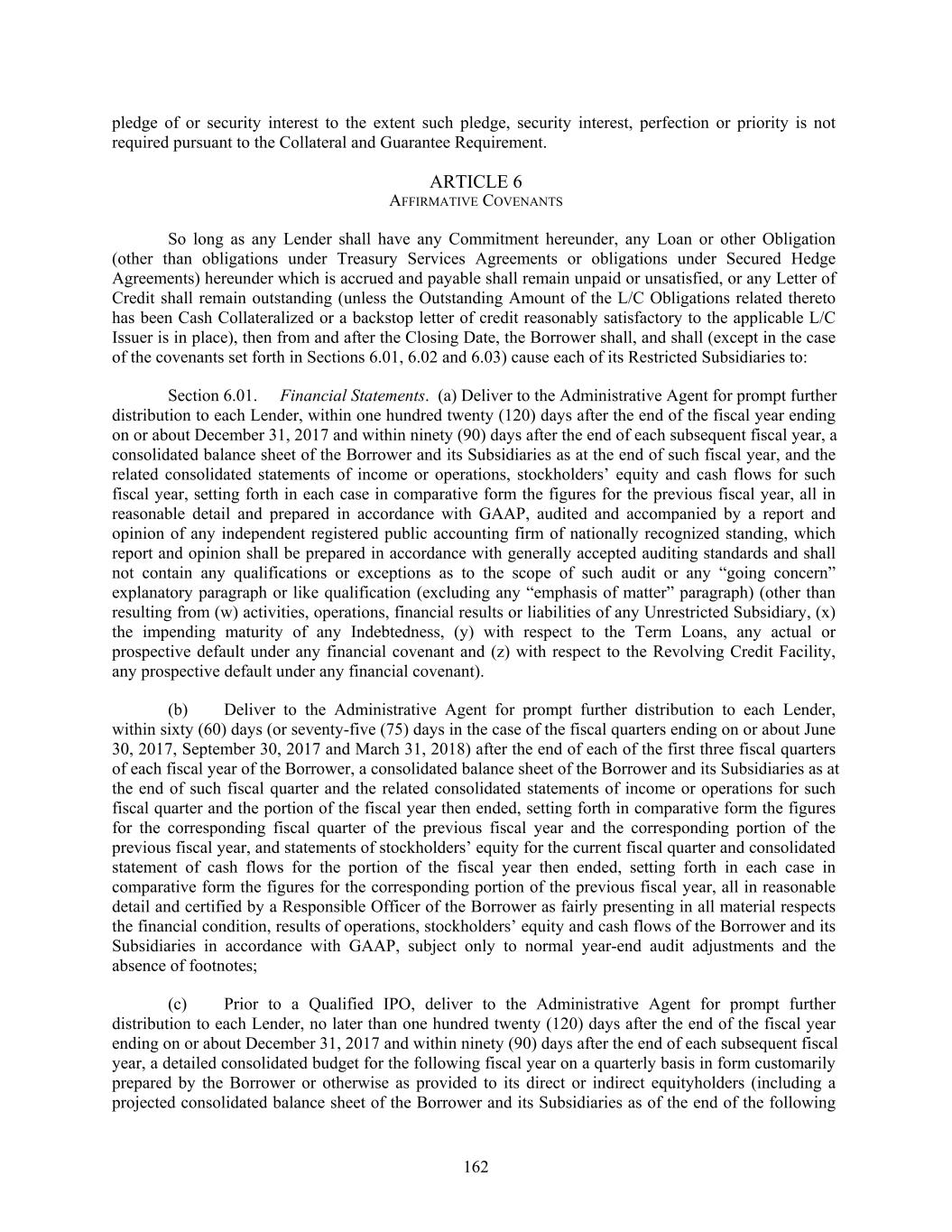 pledge of or security interest to the extent such pledge, security interest, perfection or priority is notrequired pursuant to the Collateral and Guarantee Requirement.ARTICLE 6AFFIRMATIVE COVENANTSSo long as any Lender shall have any Commitment hereunder, any Loan or other Obligation(other than obligations under Treasury Services Agreements or obligations under Secured HedgeAgreements) hereunder which is accrued and payable shall remain unpaid or unsatisfied, or any Letter ofCredit shall remain outstanding (unless the Outstanding Amount of the L/C Obligations related theretohas been Cash Collateralized or a backstop letter of credit reasonably satisfactory to the applicable L/CIssuer is in place), then from and after the Closing Date, the Borrower shall, and shall (except in the caseof the covenants set forth in Sections 6.01, 6.02 and 6.03) cause each of its Restricted Subsidiaries to:Section 6.01. Financial Statements. (a) Deliver to the Administrative Agent for prompt furtherdistribution to each Lender, within one hundred twenty (120) days after the end of the fiscal year endingon or about December 31, 2017 and within ninety (90) days after the end of each subsequent fiscal year, aconsolidated balance sheet of the Borrower and its Subsidiaries as at the end of such fiscal year, and therelated consolidated statements of income or operations, stockholders’ equity and cash flows for suchfiscal year, setting forth in each case in comparative form the figures for the previous fiscal year, all inreasonable detail and prepared in accordance with GAAP, audited and accompanied by a report andopinion of any independent registered public accounting firm of nationally recognized standing, whichreport and opinion shall be prepared in accordance with generally accepted auditing standards and shallnot contain any qualifications or exceptions as to the scope of such audit or any “going concern”explanatory paragraph or like qualification (excluding any “emphasis of matter” paragraph) (other thanresulting from (w) activities, operations, financial results or liabilities of any Unrestricted Subsidiary, (x)the impending maturity of any Indebtedness, (y) with respect to the Term Loans, any actual orprospective default under any financial covenant and (z) with respect to the Revolving Credit Facility,any prospective default under any financial covenant).(b) Deliver to the Administrative Agent for prompt further distribution to each Lender,within sixty (60) days (or seventy-five (75) days in the case of the fiscal quarters ending on or about June30, 2017, September 30, 2017 and March 31, 2018) after the end of each of the first three fiscal quartersof each fiscal year of the Borrower, a consolidated balance sheet of the Borrower and its Subsidiaries as atthe end of such fiscal quarter and the related consolidated statements of income or operations for suchfiscal quarter and the portion of the fiscal year then ended, setting forth in comparative form the figuresfor the corresponding fiscal quarter of the previous fiscal year and the corresponding portion of theprevious fiscal year, and statements of stockholders’ equity for the current fiscal quarter and consolidatedstatement of cash flows for the portion of the fiscal year then ended, setting forth in each case incomparative form the figures for the corresponding portion of the previous fiscal year, all in reasonabledetail and certified by a Responsible Officer of the Borrower as fairly presenting in all material respectsthe financial condition, results of operations, stockholders’ equity and cash flows of the Borrower and itsSubsidiaries in accordance with GAAP, subject only to normal year-end audit adjustments and theabsence of footnotes;(c) Prior to a Qualified IPO, deliver to the Administrative Agent for prompt furtherdistribution to each Lender, no later than one hundred twenty (120) days after the end of the fiscal yearending on or about December 31, 2017 and within ninety (90) days after the end of each subsequent fiscalyear, a detailed consolidated budget for the following fiscal year on a quarterly basis in form customarilyprepared by the Borrower or otherwise as provided to its direct or indirect equityholders (including aprojected consolidated balance sheet of the Borrower and its Subsidiaries as of the end of the following162