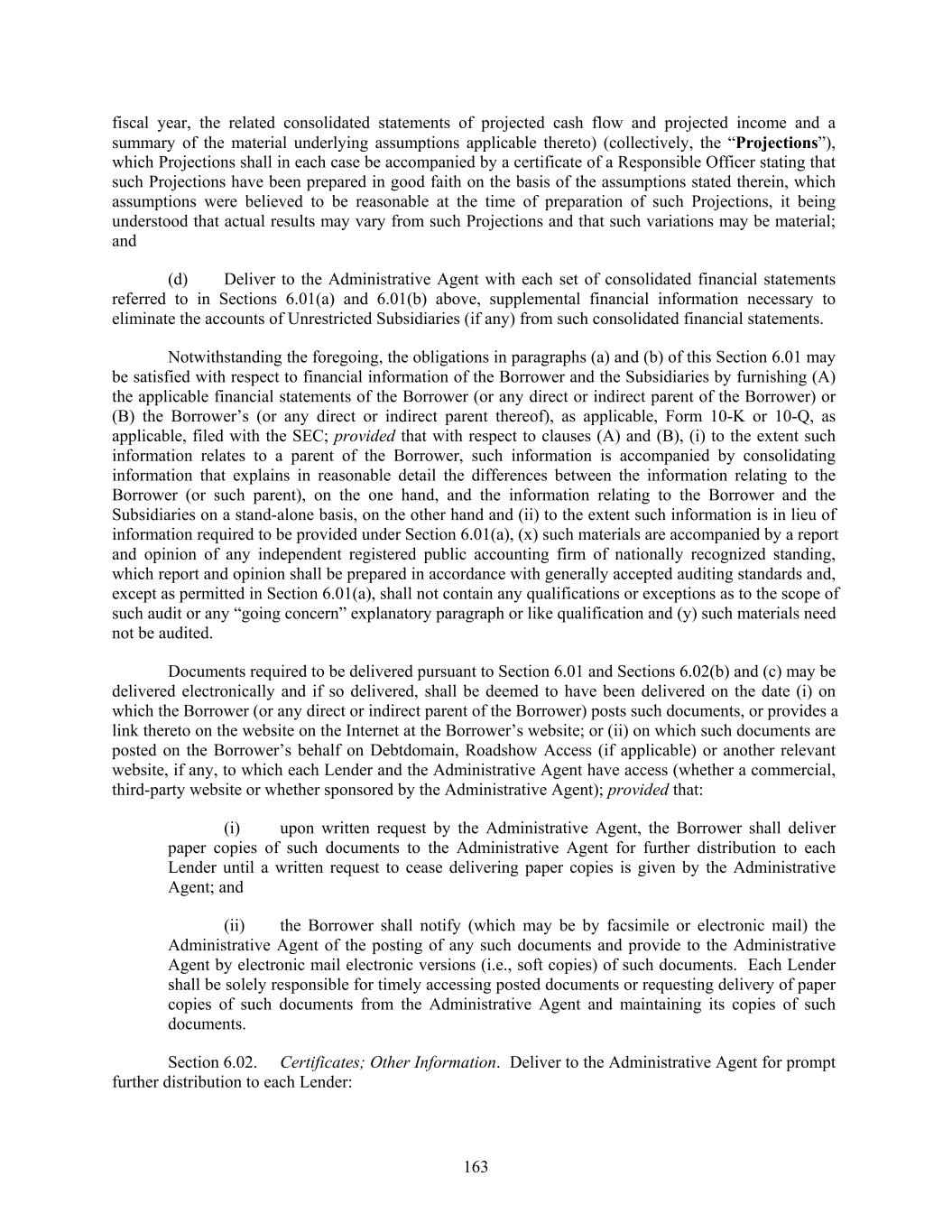 fiscal year, the related consolidated statements of projected cash flow and projected income and asummary of the material underlying assumptions applicable thereto) (collectively, the “Projections”),which Projections shall in each case be accompanied by a certificate of a Responsible Officer stating thatsuch Projections have been prepared in good faith on the basis of the assumptions stated therein, whichassumptions were believed to be reasonable at the time of preparation of such Projections, it beingunderstood that actual results may vary from such Projections and that such variations may be material;and (d) Deliver to the Administrative Agent with each set of consolidated financial statementsreferred to in Sections 6.01(a) and 6.01(b) above, supplemental financial information necessary toeliminate the accounts of Unrestricted Subsidiaries (if any) from such consolidated financial statements.Notwithstanding the foregoing, the obligations in paragraphs (a) and (b) of this Section 6.01 maybe satisfied with respect to financial information of the Borrower and the Subsidiaries by furnishing (A)the applicable financial statements of the Borrower (or any direct or indirect parent of the Borrower) or(B) the Borrower’s (or any direct or indirect parent thereof), as applicable, Form 10-K or 10-Q, asapplicable, filed with the SEC; provided that with respect to clauses (A) and (B), (i) to the extent suchinformation relates to a parent of the Borrower, such information is accompanied by consolidatinginformation that explains in reasonable detail the differences between the information relating to theBorrower (or such parent), on the one hand, and the information relating to the Borrower and theSubsidiaries on a stand-alone basis, on the other hand and (ii) to the extent such information is in lieu ofinformation required to be provided under Section 6.01(a), (x) such materials are accompanied by a reportand opinion of any independent registered public accounting firm of nationally recognized standing,which report and opinion shall be prepared in accordance with generally accepted auditing standards and,except as permitted in Section 6.01(a), shall not contain any qualifications or exceptions as to the scope ofsuch audit or any “going concern” explanatory paragraph or like qualification and (y) such materials neednot be audited.Documents required to be delivered pursuant to Section 6.01 and Sections 6.02(b) and (c) may bedelivered electronically and if so delivered, shall be deemed to have been delivered on the date (i) onwhich the Borrower (or any direct or indirect parent of the Borrower) posts such documents, or provides alink thereto on the website on the Internet at the Borrower’s website; or (ii) on which such documents areposted on the Borrower’s behalf on Debtdomain, Roadshow Access (if applicable) or another relevantwebsite, if any, to which each Lender and the Administrative Agent have access (whether a commercial,third-party website or whether sponsored by the Administrative Agent); provided that:(i) upon written request by the Administrative Agent, the Borrower shall deliverpaper copies of such documents to the Administrative Agent for further distribution to eachLender until a written request to cease delivering paper copies is given by the AdministrativeAgent; and(ii) the Borrower shall notify (which may be by facsimile or electronic mail) theAdministrative Agent of the posting of any such documents and provide to the AdministrativeAgent by electronic mail electronic versions (i.e., soft copies) of such documents. Each Lendershall be solely responsible for timely accessing posted documents or requesting delivery of papercopies of such documents from the Administrative Agent and maintaining its copies of suchdocuments.Section 6.02. Certificates; Other Information. Deliver to the Administrative Agent for promptfurther distribution to each Lender: 163
