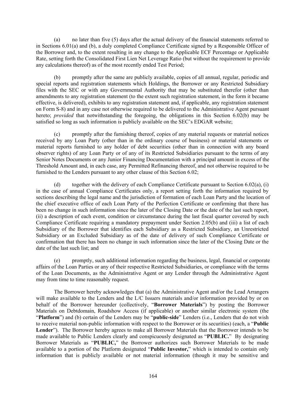 (a) no later than five (5) days after the actual delivery of the financial statements referred toin Sections 6.01(a) and (b), a duly completed Compliance Certificate signed by a Responsible Officer ofthe Borrower and, to the extent resulting in any change to the Applicable ECF Percentage or ApplicableRate, setting forth the Consolidated First Lien Net Leverage Ratio (but without the requirement to provideany calculations thereof) as of the most recently ended Test Period;(b) promptly after the same are publicly available, copies of all annual, regular, periodic andspecial reports and registration statements which Holdings, the Borrower or any Restricted Subsidiaryfiles with the SEC or with any Governmental Authority that may be substituted therefor (other thanamendments to any registration statement (to the extent such registration statement, in the form it becameeffective, is delivered), exhibits to any registration statement and, if applicable, any registration statementon Form S-8) and in any case not otherwise required to be delivered to the Administrative Agent pursuanthereto; provided that notwithstanding the foregoing, the obligations in this Section 6.02(b) may besatisfied so long as such information is publicly available on the SEC’s EDGAR website;(c) promptly after the furnishing thereof, copies of any material requests or material noticesreceived by any Loan Party (other than in the ordinary course of business) or material statements ormaterial reports furnished to any holder of debt securities (other than in connection with any boardobserver rights) of any Loan Party or of any of its Restricted Subsidiaries pursuant to the terms of anySenior Notes Documents or any Junior Financing Documentation with a principal amount in excess of theThreshold Amount and, in each case, any Permitted Refinancing thereof, and not otherwise required to befurnished to the Lenders pursuant to any other clause of this Section 6.02;(d) together with the delivery of each Compliance Certificate pursuant to Section 6.02(a), (i)in the case of annual Compliance Certificates only, a report setting forth the information required bysections describing the legal name and the jurisdiction of formation of each Loan Party and the location ofthe chief executive office of each Loan Party of the Perfection Certificate or confirming that there hasbeen no change in such information since the later of the Closing Date or the date of the last such report,(ii) a description of each event, condition or circumstance during the last fiscal quarter covered by suchCompliance Certificate requiring a mandatory prepayment under Section 2.05(b) and (iii) a list of eachSubsidiary of the Borrower that identifies each Subsidiary as a Restricted Subsidiary, an UnrestrictedSubsidiary or an Excluded Subsidiary as of the date of delivery of such Compliance Certificate orconfirmation that there has been no change in such information since the later of the Closing Date or thedate of the last such list; and(e) promptly, such additional information regarding the business, legal, financial or corporateaffairs of the Loan Parties or any of their respective Restricted Subsidiaries, or compliance with the termsof the Loan Documents, as the Administrative Agent or any Lender through the Administrative Agentmay from time to time reasonably request.The Borrower hereby acknowledges that (a) the Administrative Agent and/or the Lead Arrangerswill make available to the Lenders and the L/C Issuers materials and/or information provided by or onbehalf of the Borrower hereunder (collectively, “Borrower Materials”) by posting the BorrowerMaterials on Debtdomain, Roadshow Access (if applicable) or another similar electronic system (the“Platform”) and (b) certain of the Lenders may be “public-side” Lenders (i.e., Lenders that do not wishto receive material non-public information with respect to the Borrower or its securities) (each, a “PublicLender”). The Borrower hereby agrees to make all Borrower Materials that the Borrower intends to bemade available to Public Lenders clearly and conspicuously designated as “PUBLIC.” By designatingBorrower Materials as “PUBLIC,” the Borrower authorizes such Borrower Materials to be madeavailable to a portion of the Platform designated “Public Investor,” which is intended to contain onlyinformation that is publicly available or not material information (though it may be sensitive and164