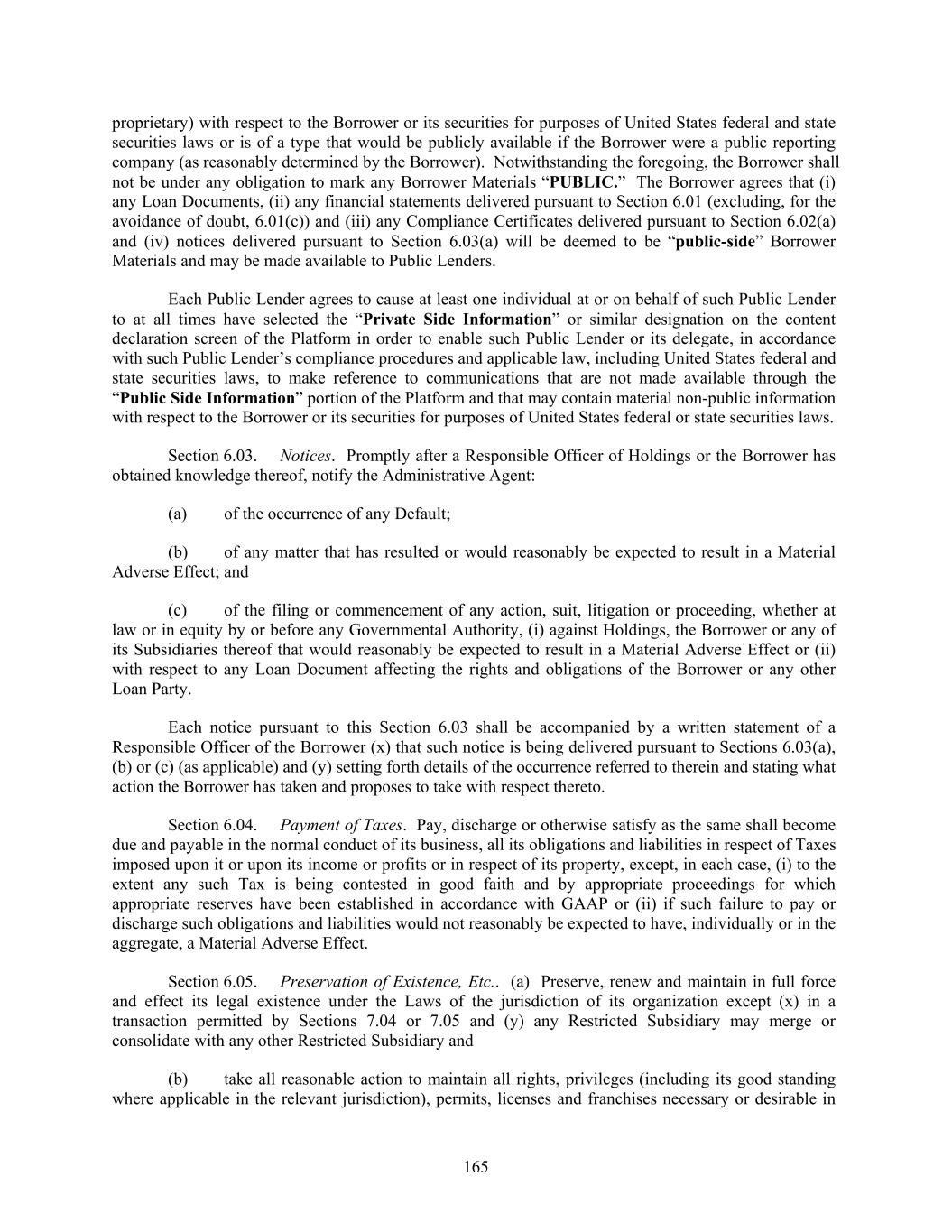 proprietary) with respect to the Borrower or its securities for purposes of United States federal and statesecurities laws or is of a type that would be publicly available if the Borrower were a public reportingcompany (as reasonably determined by the Borrower). Notwithstanding the foregoing, the Borrower shallnot be under any obligation to mark any Borrower Materials “PUBLIC.” The Borrower agrees that (i)any Loan Documents, (ii) any financial statements delivered pursuant to Section 6.01 (excluding, for theavoidance of doubt, 6.01(c)) and (iii) any Compliance Certificates delivered pursuant to Section 6.02(a)and (iv) notices delivered pursuant to Section 6.03(a) will be deemed to be “public-side” BorrowerMaterials and may be made available to Public Lenders.Each Public Lender agrees to cause at least one individual at or on behalf of such Public Lenderto at all times have selected the “Private Side Information” or similar designation on the contentdeclaration screen of the Platform in order to enable such Public Lender or its delegate, in accordancewith such Public Lender’s compliance procedures and applicable law, including United States federal andstate securities laws, to make reference to communications that are not made available through the“Public Side Information” portion of the Platform and that may contain material non-public informationwith respect to the Borrower or its securities for purposes of United States federal or state securities laws.Section 6.03. Notices. Promptly after a Responsible Officer of Holdings or the Borrower hasobtained knowledge thereof, notify the Administrative Agent:(a) of the occurrence of any Default;(b) of any matter that has resulted or would reasonably be expected to result in a MaterialAdverse Effect; and(c) of the filing or commencement of any action, suit, litigation or proceeding, whether atlaw or in equity by or before any Governmental Authority, (i) against Holdings, the Borrower or any ofits Subsidiaries thereof that would reasonably be expected to result in a Material Adverse Effect or (ii)with respect to any Loan Document affecting the rights and obligations of the Borrower or any otherLoan Party.Each notice pursuant to this Section 6.03 shall be accompanied by a written statement of aResponsible Officer of the Borrower (x) that such notice is being delivered pursuant to Sections 6.03(a), (b) or (c) (as applicable) and (y) setting forth details of the occurrence referred to therein and stating whataction the Borrower has taken and proposes to take with respect thereto.Section 6.04. Payment of Taxes. Pay, discharge or otherwise satisfy as the same shall becomedue and payable in the normal conduct of its business, all its obligations and liabilities in respect of Taxesimposed upon it or upon its income or profits or in respect of its property, except, in each case, (i) to theextent any such Tax is being contested in good faith and by appropriate proceedings for whichappropriate reserves have been established in accordance with GAAP or (ii) if such failure to pay ordischarge such obligations and liabilities would not reasonably be expected to have, individually or in theaggregate, a Material Adverse Effect.Section 6.05. Preservation of Existence, Etc.. (a) Preserve, renew and maintain in full forceand effect its legal existence under the Laws of the jurisdiction of its organization except (x) in atransaction permitted by Sections 7.04 or 7.05 and (y) any Restricted Subsidiary may merge orconsolidate with any other Restricted Subsidiary and(b) take all reasonable action to maintain all rights, privileges (including its good standingwhere applicable in the relevant jurisdiction), permits, licenses and franchises necessary or desirable in165