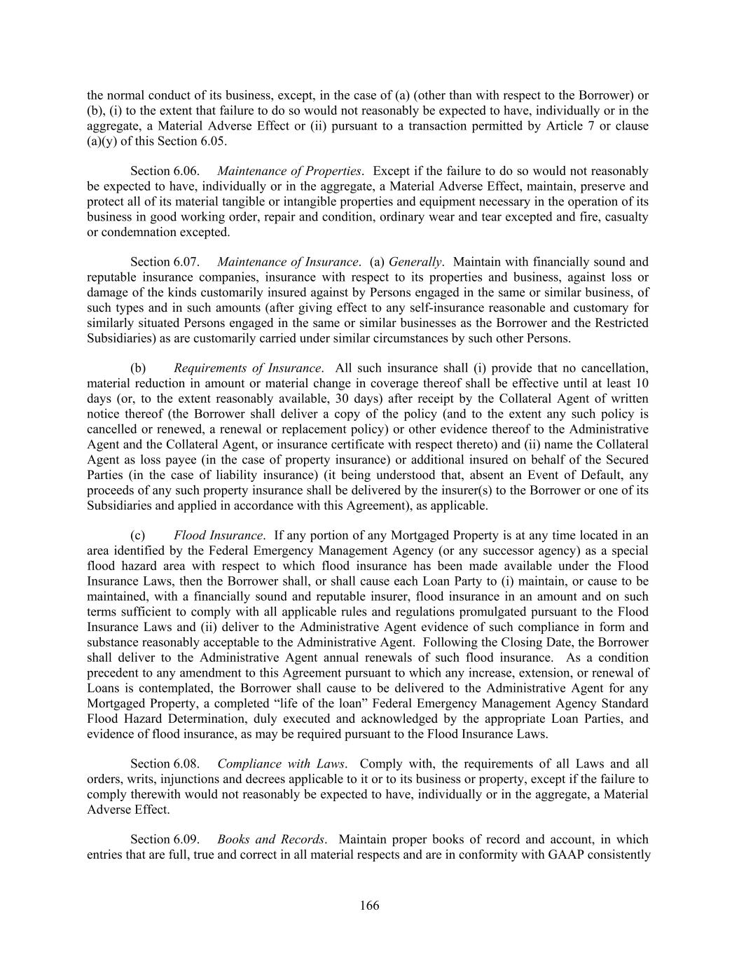 the normal conduct of its business, except, in the case of (a) (other than with respect to the Borrower) or(b), (i) to the extent that failure to do so would not reasonably be expected to have, individually or in theaggregate, a Material Adverse Effect or (ii) pursuant to a transaction permitted by Article 7 or clause(a)(y) of this Section 6.05.Section 6.06. Maintenance of Properties. Except if the failure to do so would not reasonablybe expected to have, individually or in the aggregate, a Material Adverse Effect, maintain, preserve andprotect all of its material tangible or intangible properties and equipment necessary in the operation of itsbusiness in good working order, repair and condition, ordinary wear and tear excepted and fire, casualtyor condemnation excepted.Section 6.07. Maintenance of Insurance. (a) Generally. Maintain with financially sound andreputable insurance companies, insurance with respect to its properties and business, against loss ordamage of the kinds customarily insured against by Persons engaged in the same or similar business, ofsuch types and in such amounts (after giving effect to any self-insurance reasonable and customary forsimilarly situated Persons engaged in the same or similar businesses as the Borrower and the RestrictedSubsidiaries) as are customarily carried under similar circumstances by such other Persons.(b) Requirements of Insurance. All such insurance shall (i) provide that no cancellation,material reduction in amount or material change in coverage thereof shall be effective until at least 10days (or, to the extent reasonably available, 30 days) after receipt by the Collateral Agent of writtennotice thereof (the Borrower shall deliver a copy of the policy (and to the extent any such policy iscancelled or renewed, a renewal or replacement policy) or other evidence thereof to the AdministrativeAgent and the Collateral Agent, or insurance certificate with respect thereto) and (ii) name the CollateralAgent as loss payee (in the case of property insurance) or additional insured on behalf of the SecuredParties (in the case of liability insurance) (it being understood that, absent an Event of Default, anyproceeds of any such property insurance shall be delivered by the insurer(s) to the Borrower or one of itsSubsidiaries and applied in accordance with this Agreement), as applicable.(c) Flood Insurance. If any portion of any Mortgaged Property is at any time located in anarea identified by the Federal Emergency Management Agency (or any successor agency) as a specialflood hazard area with respect to which flood insurance has been made available under the FloodInsurance Laws, then the Borrower shall, or shall cause each Loan Party to (i) maintain, or cause to bemaintained, with a financially sound and reputable insurer, flood insurance in an amount and on suchterms sufficient to comply with all applicable rules and regulations promulgated pursuant to the FloodInsurance Laws and (ii) deliver to the Administrative Agent evidence of such compliance in form andsubstance reasonably acceptable to the Administrative Agent. Following the Closing Date, the Borrowershall deliver to the Administrative Agent annual renewals of such flood insurance. As a conditionprecedent to any amendment to this Agreement pursuant to which any increase, extension, or renewal ofLoans is contemplated, the Borrower shall cause to be delivered to the Administrative Agent for anyMortgaged Property, a completed “life of the loan” Federal Emergency Management Agency StandardFlood Hazard Determination, duly executed and acknowledged by the appropriate Loan Parties, andevidence of flood insurance, as may be required pursuant to the Flood Insurance Laws.Section 6.08. Compliance with Laws. Comply with, the requirements of all Laws and allorders, writs, injunctions and decrees applicable to it or to its business or property, except if the failure tocomply therewith would not reasonably be expected to have, individually or in the aggregate, a MaterialAdverse Effect.Section 6.09. Books and Records. Maintain proper books of record and account, in whichentries that are full, true and correct in all material respects and are in conformity with GAAP consistently166
