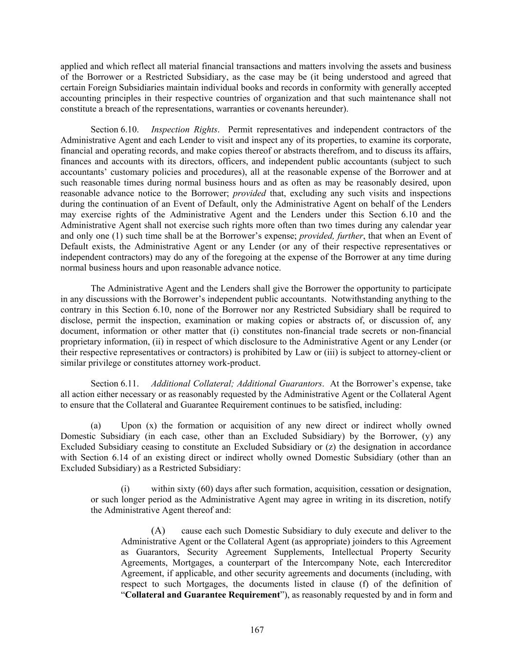 applied and which reflect all material financial transactions and matters involving the assets and businessof the Borrower or a Restricted Subsidiary, as the case may be (it being understood and agreed thatcertain Foreign Subsidiaries maintain individual books and records in conformity with generally acceptedaccounting principles in their respective countries of organization and that such maintenance shall notconstitute a breach of the representations, warranties or covenants hereunder).Section 6.10. Inspection Rights. Permit representatives and independent contractors of theAdministrative Agent and each Lender to visit and inspect any of its properties, to examine its corporate,financial and operating records, and make copies thereof or abstracts therefrom, and to discuss its affairs,finances and accounts with its directors, officers, and independent public accountants (subject to suchaccountants’ customary policies and procedures), all at the reasonable expense of the Borrower and atsuch reasonable times during normal business hours and as often as may be reasonably desired, uponreasonable advance notice to the Borrower; provided that, excluding any such visits and inspectionsduring the continuation of an Event of Default, only the Administrative Agent on behalf of the Lendersmay exercise rights of the Administrative Agent and the Lenders under this Section 6.10 and theAdministrative Agent shall not exercise such rights more often than two times during any calendar yearand only one (1) such time shall be at the Borrower’s expense; provided, further, that when an Event ofDefault exists, the Administrative Agent or any Lender (or any of their respective representatives orindependent contractors) may do any of the foregoing at the expense of the Borrower at any time duringnormal business hours and upon reasonable advance notice.The Administrative Agent and the Lenders shall give the Borrower the opportunity to participatein any discussions with the Borrower’s independent public accountants. Notwithstanding anything to thecontrary in this Section 6.10, none of the Borrower nor any Restricted Subsidiary shall be required todisclose, permit the inspection, examination or making copies or abstracts of, or discussion of, anydocument, information or other matter that (i) constitutes non-financial trade secrets or non-financialproprietary information, (ii) in respect of which disclosure to the Administrative Agent or any Lender (ortheir respective representatives or contractors) is prohibited by Law or (iii) is subject to attorney-client orsimilar privilege or constitutes attorney work-product.Section 6.11. Additional Collateral; Additional Guarantors. At the Borrower’s expense, takeall action either necessary or as reasonably requested by the Administrative Agent or the Collateral Agentto ensure that the Collateral and Guarantee Requirement continues to be satisfied, including:(a) Upon (x) the formation or acquisition of any new direct or indirect wholly ownedDomestic Subsidiary (in each case, other than an Excluded Subsidiary) by the Borrower, (y) anyExcluded Subsidiary ceasing to constitute an Excluded Subsidiary or (z) the designation in accordancewith Section 6.14 of an existing direct or indirect wholly owned Domestic Subsidiary (other than anExcluded Subsidiary) as a Restricted Subsidiary:(i) within sixty (60) days after such formation, acquisition, cessation or designation,or such longer period as the Administrative Agent may agree in writing in its discretion, notifythe Administrative Agent thereof and:(A) cause each such Domestic Subsidiary to duly execute and deliver to theAdministrative Agent or the Collateral Agent (as appropriate) joinders to this Agreementas Guarantors, Security Agreement Supplements, Intellectual Property SecurityAgreements, Mortgages, a counterpart of the Intercompany Note, each IntercreditorAgreement, if applicable, and other security agreements and documents (including, withrespect to such Mortgages, the documents listed in clause (f) of the definition of“Collateral and Guarantee Requirement”), as reasonably requested by and in form and167