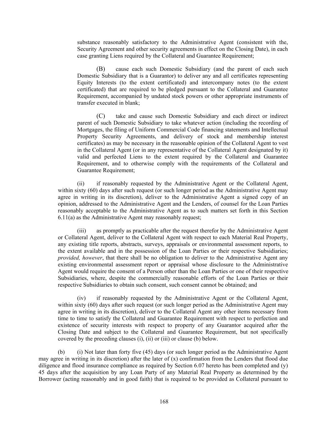 substance reasonably satisfactory to the Administrative Agent (consistent with the,Security Agreement and other security agreements in effect on the Closing Date), in eachcase granting Liens required by the Collateral and Guarantee Requirement;(B) cause each such Domestic Subsidiary (and the parent of each suchDomestic Subsidiary that is a Guarantor) to deliver any and all certificates representingEquity Interests (to the extent certificated) and intercompany notes (to the extentcertificated) that are required to be pledged pursuant to the Collateral and GuaranteeRequirement, accompanied by undated stock powers or other appropriate instruments oftransfer executed in blank;(C) take and cause such Domestic Subsidiary and each direct or indirectparent of such Domestic Subsidiary to take whatever action (including the recording ofMortgages, the filing of Uniform Commercial Code financing statements and IntellectualProperty Security Agreements, and delivery of stock and membership interestcertificates) as may be necessary in the reasonable opinion of the Collateral Agent to vestin the Collateral Agent (or in any representative of the Collateral Agent designated by it)valid and perfected Liens to the extent required by the Collateral and GuaranteeRequirement, and to otherwise comply with the requirements of the Collateral andGuarantee Requirement;(ii) if reasonably requested by the Administrative Agent or the Collateral Agent,within sixty (60) days after such request (or such longer period as the Administrative Agent mayagree in writing in its discretion), deliver to the Administrative Agent a signed copy of anopinion, addressed to the Administrative Agent and the Lenders, of counsel for the Loan Partiesreasonably acceptable to the Administrative Agent as to such matters set forth in this Section6.11(a) as the Administrative Agent may reasonably request;(iii) as promptly as practicable after the request therefor by the Administrative Agentor Collateral Agent, deliver to the Collateral Agent with respect to each Material Real Property,any existing title reports, abstracts, surveys, appraisals or environmental assessment reports, tothe extent available and in the possession of the Loan Parties or their respective Subsidiaries;provided, however, that there shall be no obligation to deliver to the Administrative Agent anyexisting environmental assessment report or appraisal whose disclosure to the AdministrativeAgent would require the consent of a Person other than the Loan Parties or one of their respectiveSubsidiaries, where, despite the commercially reasonable efforts of the Loan Parties or theirrespective Subsidiaries to obtain such consent, such consent cannot be obtained; and(iv) if reasonably requested by the Administrative Agent or the Collateral Agent,within sixty (60) days after such request (or such longer period as the Administrative Agent mayagree in writing in its discretion), deliver to the Collateral Agent any other items necessary fromtime to time to satisfy the Collateral and Guarantee Requirement with respect to perfection andexistence of security interests with respect to property of any Guarantor acquired after theClosing Date and subject to the Collateral and Guarantee Requirement, but not specificallycovered by the preceding clauses (i), (ii) or (iii) or clause (b) below.(b) (i) Not later than forty five (45) days (or such longer period as the Administrative Agentmay agree in writing in its discretion) after the later of (x) confirmation from the Lenders that flood duediligence and flood insurance compliance as required by Section 6.07 hereto has been completed and (y)45 days after the acquisition by any Loan Party of any Material Real Property as determined by theBorrower (acting reasonably and in good faith) that is required to be provided as Collateral pursuant to168