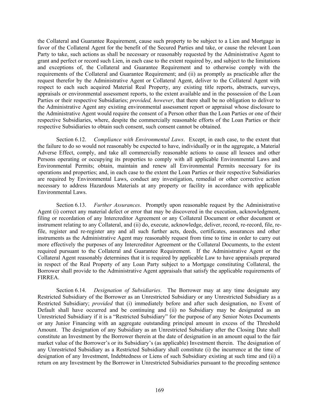 the Collateral and Guarantee Requirement, cause such property to be subject to a Lien and Mortgage infavor of the Collateral Agent for the benefit of the Secured Parties and take, or cause the relevant LoanParty to take, such actions as shall be necessary or reasonably requested by the Administrative Agent togrant and perfect or record such Lien, in each case to the extent required by, and subject to the limitationsand exceptions of, the Collateral and Guarantee Requirement and to otherwise comply with therequirements of the Collateral and Guarantee Requirement; and (ii) as promptly as practicable after therequest therefor by the Administrative Agent or Collateral Agent, deliver to the Collateral Agent withrespect to each such acquired Material Real Property, any existing title reports, abstracts, surveys,appraisals or environmental assessment reports, to the extent available and in the possession of the LoanParties or their respective Subsidiaries; provided, however, that there shall be no obligation to deliver tothe Administrative Agent any existing environmental assessment report or appraisal whose disclosure tothe Administrative Agent would require the consent of a Person other than the Loan Parties or one of theirrespective Subsidiaries, where, despite the commercially reasonable efforts of the Loan Parties or theirrespective Subsidiaries to obtain such consent, such consent cannot be obtained.Section 6.12. Compliance with Environmental Laws. Except, in each case, to the extent thatthe failure to do so would not reasonably be expected to have, individually or in the aggregate, a MaterialAdverse Effect, comply, and take all commercially reasonable actions to cause all lessees and otherPersons operating or occupying its properties to comply with all applicable Environmental Laws andEnvironmental Permits; obtain, maintain and renew all Environmental Permits necessary for itsoperations and properties; and, in each case to the extent the Loan Parties or their respective Subsidiariesare required by Environmental Laws, conduct any investigation, remedial or other corrective actionnecessary to address Hazardous Materials at any property or facility in accordance with applicableEnvironmental Laws.Section 6.13. Further Assurances. Promptly upon reasonable request by the AdministrativeAgent (i) correct any material defect or error that may be discovered in the execution, acknowledgment,filing or recordation of any Intercreditor Agreement or any Collateral Document or other document orinstrument relating to any Collateral, and (ii) do, execute, acknowledge, deliver, record, re-record, file, re-file, register and re-register any and all such further acts, deeds, certificates, assurances and otherinstruments as the Administrative Agent may reasonably request from time to time in order to carry outmore effectively the purposes of any Intercreditor Agreement or the Collateral Documents, to the extentrequired pursuant to the Collateral and Guarantee Requirement. If the Administrative Agent or theCollateral Agent reasonably determines that it is required by applicable Law to have appraisals preparedin respect of the Real Property of any Loan Party subject to a Mortgage constituting Collateral, theBorrower shall provide to the Administrative Agent appraisals that satisfy the applicable requirements ofFIRREA.Section 6.14. Designation of Subsidiaries. The Borrower may at any time designate anyRestricted Subsidiary of the Borrower as an Unrestricted Subsidiary or any Unrestricted Subsidiary as aRestricted Subsidiary; provided that (i) immediately before and after such designation, no Event ofDefault shall have occurred and be continuing and (ii) no Subsidiary may be designated as anUnrestricted Subsidiary if it is a “Restricted Subsidiary” for the purpose of any Senior Notes Documentsor any Junior Financing with an aggregate outstanding principal amount in excess of the ThresholdAmount. The designation of any Subsidiary as an Unrestricted Subsidiary after the Closing Date shallconstitute an Investment by the Borrower therein at the date of designation in an amount equal to the fairmarket value of the Borrower’s or its Subsidiary’s (as applicable) Investment therein. The designation ofany Unrestricted Subsidiary as a Restricted Subsidiary shall constitute (i) the incurrence at the time ofdesignation of any Investment, Indebtedness or Liens of such Subsidiary existing at such time and (ii) areturn on any Investment by the Borrower in Unrestricted Subsidiaries pursuant to the preceding sentence169