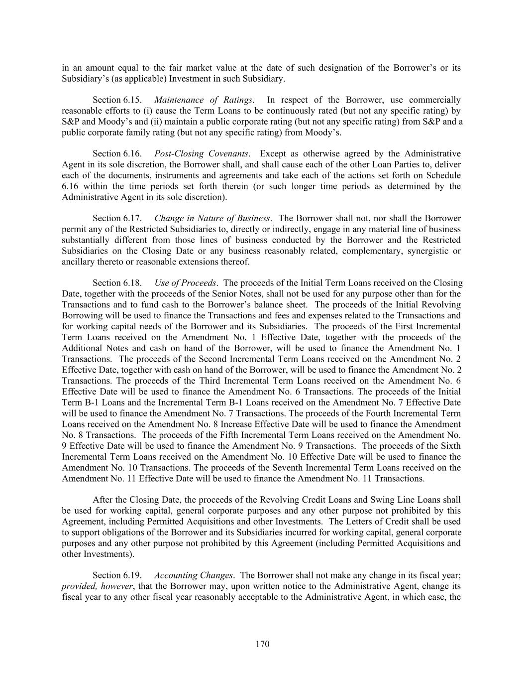 in an amount equal to the fair market value at the date of such designation of the Borrower’s or itsSubsidiary’s (as applicable) Investment in such Subsidiary.Section 6.15. Maintenance of Ratings. In respect of the Borrower, use commerciallyreasonable efforts to (i) cause the Term Loans to be continuously rated (but not any specific rating) byS&P and Moody’s and (ii) maintain a public corporate rating (but not any specific rating) from S&P and apublic corporate family rating (but not any specific rating) from Moody’s.Section 6.16. Post-Closing Covenants. Except as otherwise agreed by the AdministrativeAgent in its sole discretion, the Borrower shall, and shall cause each of the other Loan Parties to, delivereach of the documents, instruments and agreements and take each of the actions set forth on Schedule6.16 within the time periods set forth therein (or such longer time periods as determined by theAdministrative Agent in its sole discretion).Section 6.17. Change in Nature of Business. The Borrower shall not, nor shall the Borrowerpermit any of the Restricted Subsidiaries to, directly or indirectly, engage in any material line of businesssubstantially different from those lines of business conducted by the Borrower and the RestrictedSubsidiaries on the Closing Date or any business reasonably related, complementary, synergistic orancillary thereto or reasonable extensions thereof.Section 6.18. Use of Proceeds. The proceeds of the Initial Term Loans received on the ClosingDate, together with the proceeds of the Senior Notes, shall not be used for any purpose other than for theTransactions and to fund cash to the Borrower’s balance sheet. The proceeds of the Initial RevolvingBorrowing will be used to finance the Transactions and fees and expenses related to the Transactions andfor working capital needs of the Borrower and its Subsidiaries. The proceeds of the First IncrementalTerm Loans received on the Amendment No. 1 Effective Date, together with the proceeds of theAdditional Notes and cash on hand of the Borrower, will be used to finance the Amendment No. 1Transactions. The proceeds of the Second Incremental Term Loans received on the Amendment No. 2Effective Date, together with cash on hand of the Borrower, will be used to finance the Amendment No. 2Transactions. The proceeds of the Third Incremental Term Loans received on the Amendment No. 6Effective Date will be used to finance the Amendment No. 6 Transactions. The proceeds of the InitialTerm B-1 Loans and the Incremental Term B-1 Loans received on the Amendment No. 7 Effective Datewill be used to finance the Amendment No. 7 Transactions. The proceeds of the Fourth Incremental TermLoans received on the Amendment No. 8 Increase Effective Date will be used to finance the AmendmentNo. 8 Transactions. The proceeds of the Fifth Incremental Term Loans received on the Amendment No.9 Effective Date will be used to finance the Amendment No. 9 Transactions. The proceeds of the SixthIncremental Term Loans received on the Amendment No. 10 Effective Date will be used to finance theAmendment No. 10 Transactions. The proceeds of the Seventh Incremental Term Loans received on theAmendment No. 11 Effective Date will be used to finance the Amendment No. 11 Transactions.After the Closing Date, the proceeds of the Revolving Credit Loans and Swing Line Loans shallbe used for working capital, general corporate purposes and any other purpose not prohibited by thisAgreement, including Permitted Acquisitions and other Investments. The Letters of Credit shall be usedto support obligations of the Borrower and its Subsidiaries incurred for working capital, general corporatepurposes and any other purpose not prohibited by this Agreement (including Permitted Acquisitions andother Investments).Section 6.19. Accounting Changes. The Borrower shall not make any change in its fiscal year;provided, however, that the Borrower may, upon written notice to the Administrative Agent, change itsfiscal year to any other fiscal year reasonably acceptable to the Administrative Agent, in which case, the170