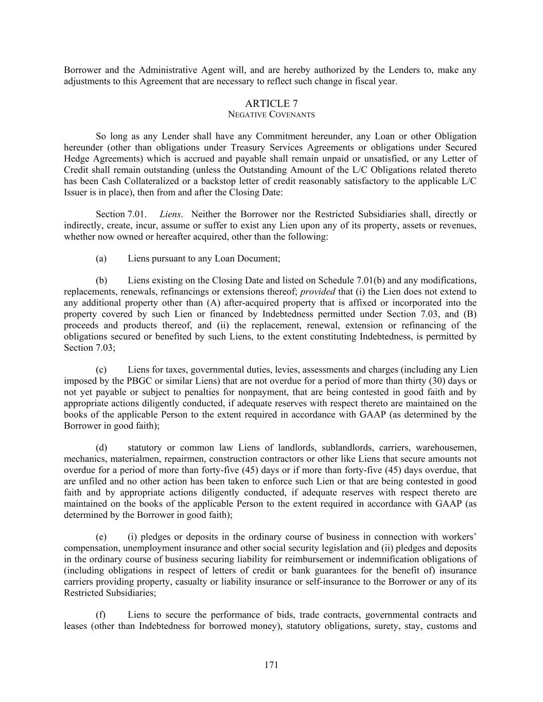 Borrower and the Administrative Agent will, and are hereby authorized by the Lenders to, make anyadjustments to this Agreement that are necessary to reflect such change in fiscal year.ARTICLE 7NEGATIVE COVENANTSSo long as any Lender shall have any Commitment hereunder, any Loan or other Obligationhereunder (other than obligations under Treasury Services Agreements or obligations under SecuredHedge Agreements) which is accrued and payable shall remain unpaid or unsatisfied, or any Letter ofCredit shall remain outstanding (unless the Outstanding Amount of the L/C Obligations related theretohas been Cash Collateralized or a backstop letter of credit reasonably satisfactory to the applicable L/CIssuer is in place), then from and after the Closing Date:Section 7.01. Liens. Neither the Borrower nor the Restricted Subsidiaries shall, directly orindirectly, create, incur, assume or suffer to exist any Lien upon any of its property, assets or revenues,whether now owned or hereafter acquired, other than the following:(a) Liens pursuant to any Loan Document;(b) Liens existing on the Closing Date and listed on Schedule 7.01(b) and any modifications,replacements, renewals, refinancings or extensions thereof; provided that (i) the Lien does not extend toany additional property other than (A) after-acquired property that is affixed or incorporated into theproperty covered by such Lien or financed by Indebtedness permitted under Section 7.03, and (B)proceeds and products thereof, and (ii) the replacement, renewal, extension or refinancing of theobligations secured or benefited by such Liens, to the extent constituting Indebtedness, is permitted by Section 7.03;(c) Liens for taxes, governmental duties, levies, assessments and charges (including any Lienimposed by the PBGC or similar Liens) that are not overdue for a period of more than thirty (30) days ornot yet payable or subject to penalties for nonpayment, that are being contested in good faith and byappropriate actions diligently conducted, if adequate reserves with respect thereto are maintained on thebooks of the applicable Person to the extent required in accordance with GAAP (as determined by theBorrower in good faith);(d) statutory or common law Liens of landlords, sublandlords, carriers, warehousemen,mechanics, materialmen, repairmen, construction contractors or other like Liens that secure amounts notoverdue for a period of more than forty-five (45) days or if more than forty-five (45) days overdue, thatare unfiled and no other action has been taken to enforce such Lien or that are being contested in goodfaith and by appropriate actions diligently conducted, if adequate reserves with respect thereto aremaintained on the books of the applicable Person to the extent required in accordance with GAAP (asdetermined by the Borrower in good faith);(e) (i) pledges or deposits in the ordinary course of business in connection with workers’compensation, unemployment insurance and other social security legislation and (ii) pledges and depositsin the ordinary course of business securing liability for reimbursement or indemnification obligations of(including obligations in respect of letters of credit or bank guarantees for the benefit of) insurancecarriers providing property, casualty or liability insurance or self-insurance to the Borrower or any of itsRestricted Subsidiaries;(f) Liens to secure the performance of bids, trade contracts, governmental contracts andleases (other than Indebtedness for borrowed money), statutory obligations, surety, stay, customs and171