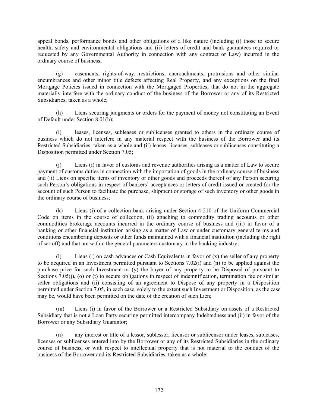 appeal bonds, performance bonds and other obligations of a like nature (including (i) those to securehealth, safety and environmental obligations and (ii) letters of credit and bank guarantees required orrequested by any Governmental Authority in connection with any contract or Law) incurred in theordinary course of business;(g) easements, rights-of-way, restrictions, encroachments, protrusions and other similarencumbrances and other minor title defects affecting Real Property, and any exceptions on the finalMortgage Policies issued in connection with the Mortgaged Properties, that do not in the aggregatematerially interfere with the ordinary conduct of the business of the Borrower or any of its RestrictedSubsidiaries, taken as a whole;(h) Liens securing judgments or orders for the payment of money not constituting an Eventof Default under Section 8.01(h);(i) leases, licenses, subleases or sublicenses granted to others in the ordinary course ofbusiness which do not interfere in any material respect with the business of the Borrower and itsRestricted Subsidiaries, taken as a whole and (ii) leases, licenses, subleases or sublicenses constituting aDisposition permitted under Section 7.05;(j) Liens (i) in favor of customs and revenue authorities arising as a matter of Law to securepayment of customs duties in connection with the importation of goods in the ordinary course of businessand (ii) Liens on specific items of inventory or other goods and proceeds thereof of any Person securingsuch Person’s obligations in respect of bankers’ acceptances or letters of credit issued or created for theaccount of such Person to facilitate the purchase, shipment or storage of such inventory or other goods inthe ordinary course of business;(k) Liens (i) of a collection bank arising under Section 4-210 of the Uniform CommercialCode on items in the course of collection, (ii) attaching to commodity trading accounts or othercommodities brokerage accounts incurred in the ordinary course of business and (iii) in favor of abanking or other financial institution arising as a matter of Law or under customary general terms andconditions encumbering deposits or other funds maintained with a financial institution (including the rightof set-off) and that are within the general parameters customary in the banking industry;(l) Liens (i) on cash advances or Cash Equivalents in favor of (x) the seller of any propertyto be acquired in an Investment permitted pursuant to Sections 7.02(i) and (n) to be applied against thepurchase price for such Investment or (y) the buyer of any property to be Disposed of pursuant toSections 7.05(j), (o) or (t) to secure obligations in respect of indemnification, termination fee or similarseller obligations and (ii) consisting of an agreement to Dispose of any property in a Dispositionpermitted under Section 7.05, in each case, solely to the extent such Investment or Disposition, as the casemay be, would have been permitted on the date of the creation of such Lien;(m) Liens (i) in favor of the Borrower or a Restricted Subsidiary on assets of a RestrictedSubsidiary that is not a Loan Party securing permitted intercompany Indebtedness and (ii) in favor of theBorrower or any Subsidiary Guarantor;(n) any interest or title of a lessor, sublessor, licensor or sublicensor under leases, subleases,licenses or sublicenses entered into by the Borrower or any of its Restricted Subsidiaries in the ordinarycourse of business, or with respect to intellectual property that is not material to the conduct of thebusiness of the Borrower and its Restricted Subsidiaries, taken as a whole;172