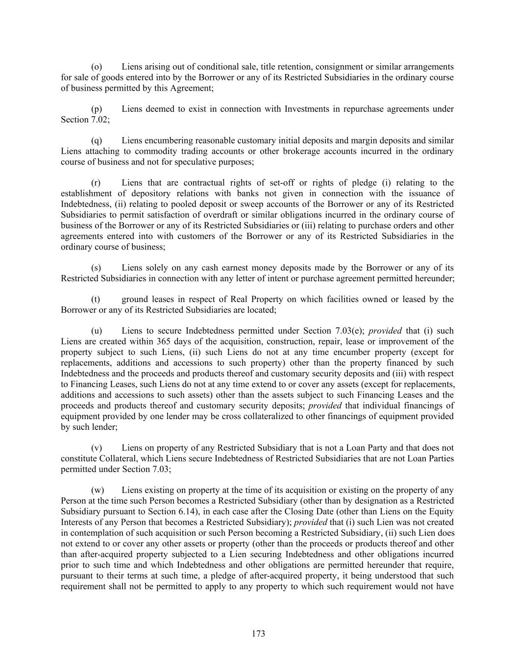 (o) Liens arising out of conditional sale, title retention, consignment or similar arrangementsfor sale of goods entered into by the Borrower or any of its Restricted Subsidiaries in the ordinary courseof business permitted by this Agreement;(p) Liens deemed to exist in connection with Investments in repurchase agreements under Section 7.02;(q) Liens encumbering reasonable customary initial deposits and margin deposits and similarLiens attaching to commodity trading accounts or other brokerage accounts incurred in the ordinarycourse of business and not for speculative purposes;(r) Liens that are contractual rights of set-off or rights of pledge (i) relating to theestablishment of depository relations with banks not given in connection with the issuance ofIndebtedness, (ii) relating to pooled deposit or sweep accounts of the Borrower or any of its RestrictedSubsidiaries to permit satisfaction of overdraft or similar obligations incurred in the ordinary course ofbusiness of the Borrower or any of its Restricted Subsidiaries or (iii) relating to purchase orders and otheragreements entered into with customers of the Borrower or any of its Restricted Subsidiaries in theordinary course of business;(s) Liens solely on any cash earnest money deposits made by the Borrower or any of itsRestricted Subsidiaries in connection with any letter of intent or purchase agreement permitted hereunder;(t) ground leases in respect of Real Property on which facilities owned or leased by theBorrower or any of its Restricted Subsidiaries are located;(u) Liens to secure Indebtedness permitted under Section 7.03(e); provided that (i) suchLiens are created within 365 days of the acquisition, construction, repair, lease or improvement of theproperty subject to such Liens, (ii) such Liens do not at any time encumber property (except forreplacements, additions and accessions to such property) other than the property financed by suchIndebtedness and the proceeds and products thereof and customary security deposits and (iii) with respectto Financing Leases, such Liens do not at any time extend to or cover any assets (except for replacements,additions and accessions to such assets) other than the assets subject to such Financing Leases and theproceeds and products thereof and customary security deposits; provided that individual financings ofequipment provided by one lender may be cross collateralized to other financings of equipment providedby such lender;(v) Liens on property of any Restricted Subsidiary that is not a Loan Party and that does notconstitute Collateral, which Liens secure Indebtedness of Restricted Subsidiaries that are not Loan Partiespermitted under Section 7.03;(w) Liens existing on property at the time of its acquisition or existing on the property of anyPerson at the time such Person becomes a Restricted Subsidiary (other than by designation as a RestrictedSubsidiary pursuant to Section 6.14), in each case after the Closing Date (other than Liens on the EquityInterests of any Person that becomes a Restricted Subsidiary); provided that (i) such Lien was not createdin contemplation of such acquisition or such Person becoming a Restricted Subsidiary, (ii) such Lien doesnot extend to or cover any other assets or property (other than the proceeds or products thereof and otherthan after-acquired property subjected to a Lien securing Indebtedness and other obligations incurredprior to such time and which Indebtedness and other obligations are permitted hereunder that require,pursuant to their terms at such time, a pledge of after-acquired property, it being understood that suchrequirement shall not be permitted to apply to any property to which such requirement would not have173