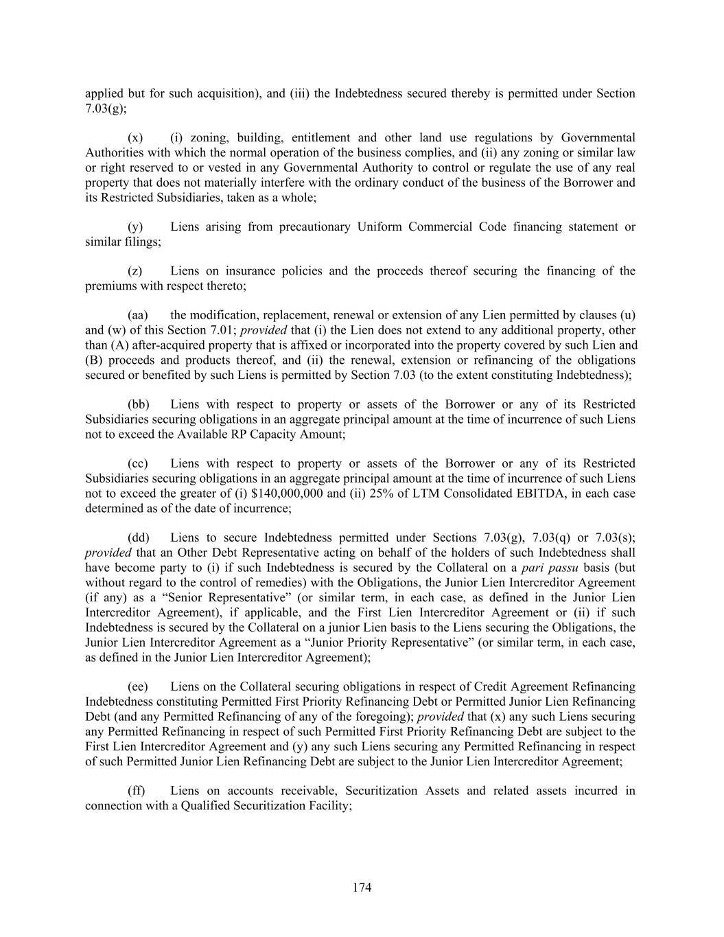 applied but for such acquisition), and (iii) the Indebtedness secured thereby is permitted under Section7.03(g);(x) (i) zoning, building, entitlement and other land use regulations by GovernmentalAuthorities with which the normal operation of the business complies, and (ii) any zoning or similar lawor right reserved to or vested in any Governmental Authority to control or regulate the use of any realproperty that does not materially interfere with the ordinary conduct of the business of the Borrower andits Restricted Subsidiaries, taken as a whole;(y) Liens arising from precautionary Uniform Commercial Code financing statement orsimilar filings;(z) Liens on insurance policies and the proceeds thereof securing the financing of thepremiums with respect thereto;(aa) the modification, replacement, renewal or extension of any Lien permitted by clauses (u)and (w) of this Section 7.01; provided that (i) the Lien does not extend to any additional property, otherthan (A) after-acquired property that is affixed or incorporated into the property covered by such Lien and(B) proceeds and products thereof, and (ii) the renewal, extension or refinancing of the obligationssecured or benefited by such Liens is permitted by Section 7.03 (to the extent constituting Indebtedness);(bb) Liens with respect to property or assets of the Borrower or any of its RestrictedSubsidiaries securing obligations in an aggregate principal amount at the time of incurrence of such Liensnot to exceed the Available RP Capacity Amount;(cc) Liens with respect to property or assets of the Borrower or any of its RestrictedSubsidiaries securing obligations in an aggregate principal amount at the time of incurrence of such Liensnot to exceed the greater of (i) $140,000,000 and (ii) 25% of LTM Consolidated EBITDA, in each casedetermined as of the date of incurrence;(dd) Liens to secure Indebtedness permitted under Sections 7.03(g), 7.03(q) or 7.03(s);provided that an Other Debt Representative acting on behalf of the holders of such Indebtedness shallhave become party to (i) if such Indebtedness is secured by the Collateral on a pari passu basis (butwithout regard to the control of remedies) with the Obligations, the Junior Lien Intercreditor Agreement(if any) as a “Senior Representative” (or similar term, in each case, as defined in the Junior LienIntercreditor Agreement), if applicable, and the First Lien Intercreditor Agreement or (ii) if suchIndebtedness is secured by the Collateral on a junior Lien basis to the Liens securing the Obligations, theJunior Lien Intercreditor Agreement as a “Junior Priority Representative” (or similar term, in each case,as defined in the Junior Lien Intercreditor Agreement);(ee) Liens on the Collateral securing obligations in respect of Credit Agreement RefinancingIndebtedness constituting Permitted First Priority Refinancing Debt or Permitted Junior Lien RefinancingDebt (and any Permitted Refinancing of any of the foregoing); provided that (x) any such Liens securingany Permitted Refinancing in respect of such Permitted First Priority Refinancing Debt are subject to theFirst Lien Intercreditor Agreement and (y) any such Liens securing any Permitted Refinancing in respectof such Permitted Junior Lien Refinancing Debt are subject to the Junior Lien Intercreditor Agreement;(ff) Liens on accounts receivable, Securitization Assets and related assets incurred inconnection with a Qualified Securitization Facility;174