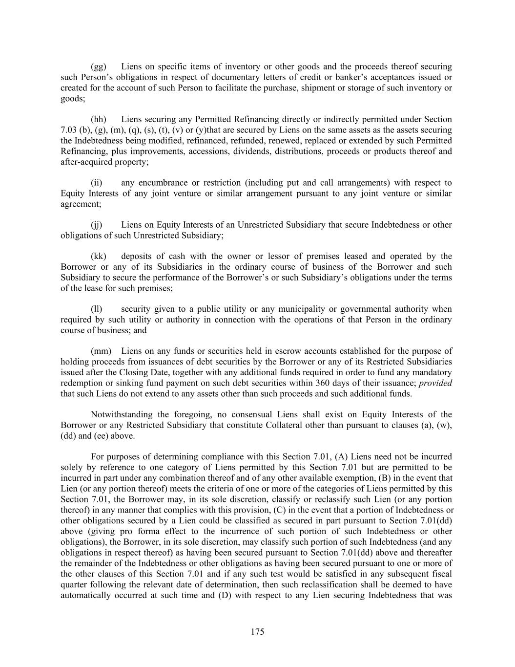 (gg) Liens on specific items of inventory or other goods and the proceeds thereof securingsuch Person’s obligations in respect of documentary letters of credit or banker’s acceptances issued orcreated for the account of such Person to facilitate the purchase, shipment or storage of such inventory orgoods; (hh) Liens securing any Permitted Refinancing directly or indirectly permitted under Section7.03 (b), (g), (m), (q), (s), (t), (v) or (y)that are secured by Liens on the same assets as the assets securingthe Indebtedness being modified, refinanced, refunded, renewed, replaced or extended by such PermittedRefinancing, plus improvements, accessions, dividends, distributions, proceeds or products thereof andafter-acquired property;(ii) any encumbrance or restriction (including put and call arrangements) with respect toEquity Interests of any joint venture or similar arrangement pursuant to any joint venture or similaragreement;(jj) Liens on Equity Interests of an Unrestricted Subsidiary that secure Indebtedness or otherobligations of such Unrestricted Subsidiary;(kk) deposits of cash with the owner or lessor of premises leased and operated by theBorrower or any of its Subsidiaries in the ordinary course of business of the Borrower and suchSubsidiary to secure the performance of the Borrower’s or such Subsidiary’s obligations under the termsof the lease for such premises;(ll) security given to a public utility or any municipality or governmental authority whenrequired by such utility or authority in connection with the operations of that Person in the ordinarycourse of business; and(mm) Liens on any funds or securities held in escrow accounts established for the purpose ofholding proceeds from issuances of debt securities by the Borrower or any of its Restricted Subsidiariesissued after the Closing Date, together with any additional funds required in order to fund any mandatoryredemption or sinking fund payment on such debt securities within 360 days of their issuance; providedthat such Liens do not extend to any assets other than such proceeds and such additional funds.Notwithstanding the foregoing, no consensual Liens shall exist on Equity Interests of theBorrower or any Restricted Subsidiary that constitute Collateral other than pursuant to clauses (a), (w), (dd) and (ee) above.For purposes of determining compliance with this Section 7.01, (A) Liens need not be incurredsolely by reference to one category of Liens permitted by this Section 7.01 but are permitted to beincurred in part under any combination thereof and of any other available exemption, (B) in the event thatLien (or any portion thereof) meets the criteria of one or more of the categories of Liens permitted by thisSection 7.01, the Borrower may, in its sole discretion, classify or reclassify such Lien (or any portionthereof) in any manner that complies with this provision, (C) in the event that a portion of Indebtedness orother obligations secured by a Lien could be classified as secured in part pursuant to Section 7.01(dd)above (giving pro forma effect to the incurrence of such portion of such Indebtedness or otherobligations), the Borrower, in its sole discretion, may classify such portion of such Indebtedness (and anyobligations in respect thereof) as having been secured pursuant to Section 7.01(dd) above and thereafterthe remainder of the Indebtedness or other obligations as having been secured pursuant to one or more ofthe other clauses of this Section 7.01 and if any such test would be satisfied in any subsequent fiscalquarter following the relevant date of determination, then such reclassification shall be deemed to haveautomatically occurred at such time and (D) with respect to any Lien securing Indebtedness that was175