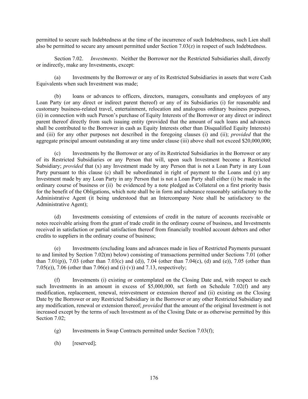 permitted to secure such Indebtedness at the time of the incurrence of such Indebtedness, such Lien shallalso be permitted to secure any amount permitted under Section 7.03(z) in respect of such Indebtedness.Section 7.02. Investments. Neither the Borrower nor the Restricted Subsidiaries shall, directlyor indirectly, make any Investments, except:(a) Investments by the Borrower or any of its Restricted Subsidiaries in assets that were CashEquivalents when such Investment was made;(b) loans or advances to officers, directors, managers, consultants and employees of anyLoan Party (or any direct or indirect parent thereof) or any of its Subsidiaries (i) for reasonable andcustomary business-related travel, entertainment, relocation and analogous ordinary business purposes,(ii) in connection with such Person’s purchase of Equity Interests of the Borrower or any direct or indirectparent thereof directly from such issuing entity (provided that the amount of such loans and advancesshall be contributed to the Borrower in cash as Equity Interests other than Disqualified Equity Interests)and (iii) for any other purposes not described in the foregoing clauses (i) and (ii); provided that theaggregate principal amount outstanding at any time under clause (iii) above shall not exceed $20,000,000;(c) Investments by the Borrower or any of its Restricted Subsidiaries in the Borrower or anyof its Restricted Subsidiaries or any Person that will, upon such Investment become a RestrictedSubsidiary; provided that (x) any Investment made by any Person that is not a Loan Party in any LoanParty pursuant to this clause (c) shall be subordinated in right of payment to the Loans and (y) anyInvestment made by any Loan Party in any Person that is not a Loan Party shall either (i) be made in theordinary course of business or (ii) be evidenced by a note pledged as Collateral on a first priority basisfor the benefit of the Obligations, which note shall be in form and substance reasonably satisfactory to theAdministrative Agent (it being understood that an Intercompany Note shall be satisfactory to theAdministrative Agent);(d) Investments consisting of extensions of credit in the nature of accounts receivable ornotes receivable arising from the grant of trade credit in the ordinary course of business, and Investmentsreceived in satisfaction or partial satisfaction thereof from financially troubled account debtors and othercredits to suppliers in the ordinary course of business;(e) Investments (excluding loans and advances made in lieu of Restricted Payments pursuantto and limited by Section 7.02(m) below) consisting of transactions permitted under Sections 7.01 (otherthan 7.01(p)), 7.03 (other than 7.03(c) and (d)), 7.04 (other than 7.04(c), (d) and (e)), 7.05 (other than 7.05(e)), 7.06 (other than 7.06(e) and (i) (v)) and 7.13, respectively;(f) Investments (i) existing or contemplated on the Closing Date and, with respect to eachsuch Investments in an amount in excess of $5,000,000, set forth on Schedule 7.02(f) and anymodification, replacement, renewal, reinvestment or extension thereof and (ii) existing on the ClosingDate by the Borrower or any Restricted Subsidiary in the Borrower or any other Restricted Subsidiary andany modification, renewal or extension thereof; provided that the amount of the original Investment is notincreased except by the terms of such Investment as of the Closing Date or as otherwise permitted by this Section 7.02;(g) Investments in Swap Contracts permitted under Section 7.03(f);(h) [reserved]; 176