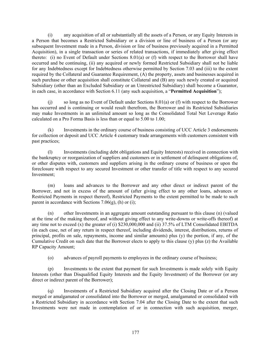 (i) any acquisition of all or substantially all the assets of a Person, or any Equity Interests ina Person that becomes a Restricted Subsidiary or a division or line of business of a Person (or anysubsequent Investment made in a Person, division or line of business previously acquired in a PermittedAcquisition), in a single transaction or series of related transactions, if immediately after giving effectthereto: (i) no Event of Default under Sections 8.01(a) or (f) with respect to the Borrower shall haveoccurred and be continuing, (ii) any acquired or newly formed Restricted Subsidiary shall not be liablefor any Indebtedness except for Indebtedness otherwise permitted by Section 7.03 and (iii) to the extentrequired by the Collateral and Guarantee Requirement, (A) the property, assets and businesses acquired insuch purchase or other acquisition shall constitute Collateral and (B) any such newly created or acquiredSubsidiary (other than an Excluded Subsidiary or an Unrestricted Subsidiary) shall become a Guarantor,in each case, in accordance with Section 6.11 (any such acquisition, a “Permitted Acquisition”);(j) so long as no Event of Default under Sections 8.01(a) or (f) with respect to the Borrowerhas occurred and is continuing or would result therefrom, the Borrower and its Restricted Subsidiariesmay make Investments in an unlimited amount so long as the Consolidated Total Net Leverage Ratiocalculated on a Pro Forma Basis is less than or equal to 5.00 to 1.00;(k) Investments in the ordinary course of business consisting of UCC Article 3 endorsementsfor collection or deposit and UCC Article 4 customary trade arrangements with customers consistent withpast practices;(l) Investments (including debt obligations and Equity Interests) received in connection withthe bankruptcy or reorganization of suppliers and customers or in settlement of delinquent obligations of,or other disputes with, customers and suppliers arising in the ordinary course of business or upon theforeclosure with respect to any secured Investment or other transfer of title with respect to any securedInvestment;(m) loans and advances to the Borrower and any other direct or indirect parent of theBorrower, and not in excess of the amount of (after giving effect to any other loans, advances orRestricted Payments in respect thereof), Restricted Payments to the extent permitted to be made to suchparent in accordance with Sections 7.06(g), (h) or (i);(n) other Investments in an aggregate amount outstanding pursuant to this clause (n) (valuedat the time of the making thereof, and without giving effect to any write-downs or write-offs thereof) atany time not to exceed (x) the greater of (i) $230,000,000 and (ii) 37.5% of LTM Consolidated EBITDA(in each case, net of any return in respect thereof, including dividends, interest, distributions, returns ofprincipal, profits on sale, repayments, income and similar amounts) plus (y) the portion, if any, of theCumulative Credit on such date that the Borrower elects to apply to this clause (y) plus (z) the AvailableRP Capacity Amount;(o) advances of payroll payments to employees in the ordinary course of business;(p) Investments to the extent that payment for such Investments is made solely with EquityInterests (other than Disqualified Equity Interests and the Equity Investment) of the Borrower (or anydirect or indirect parent of the Borrower);(q) Investments of a Restricted Subsidiary acquired after the Closing Date or of a Personmerged or amalgamated or consolidated into the Borrower or merged, amalgamated or consolidated witha Restricted Subsidiary in accordance with Section 7.04 after the Closing Date to the extent that suchInvestments were not made in contemplation of or in connection with such acquisition, merger,177
