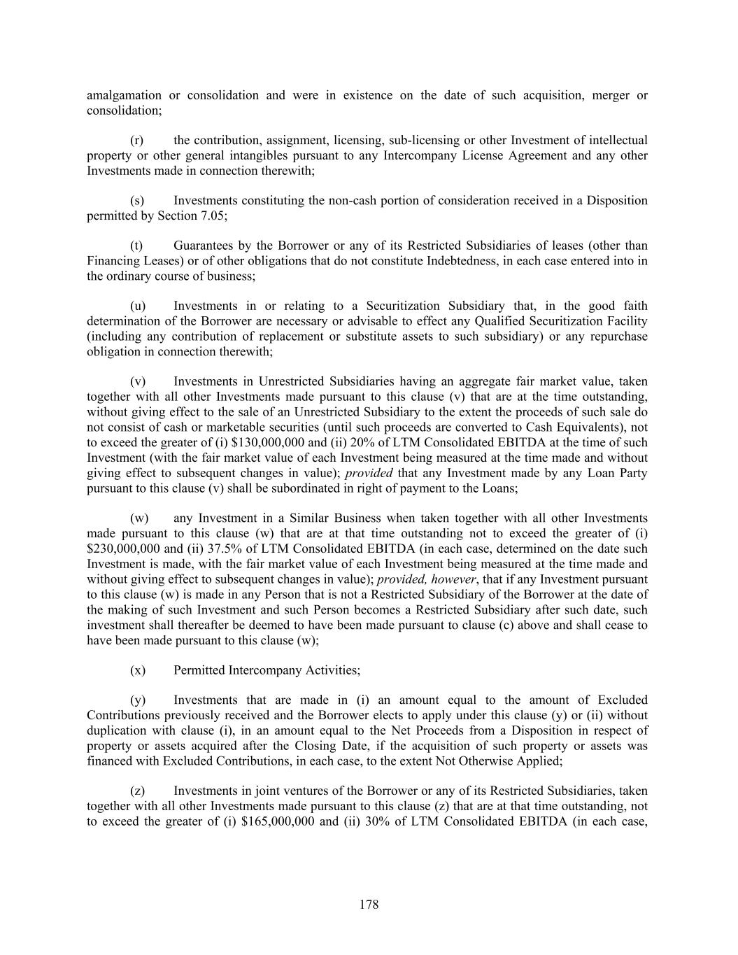 amalgamation or consolidation and were in existence on the date of such acquisition, merger orconsolidation;(r) the contribution, assignment, licensing, sub-licensing or other Investment of intellectualproperty or other general intangibles pursuant to any Intercompany License Agreement and any otherInvestments made in connection therewith;(s) Investments constituting the non-cash portion of consideration received in a Dispositionpermitted by Section 7.05;(t) Guarantees by the Borrower or any of its Restricted Subsidiaries of leases (other thanFinancing Leases) or of other obligations that do not constitute Indebtedness, in each case entered into inthe ordinary course of business;(u) Investments in or relating to a Securitization Subsidiary that, in the good faithdetermination of the Borrower are necessary or advisable to effect any Qualified Securitization Facility(including any contribution of replacement or substitute assets to such subsidiary) or any repurchaseobligation in connection therewith;(v) Investments in Unrestricted Subsidiaries having an aggregate fair market value, takentogether with all other Investments made pursuant to this clause (v) that are at the time outstanding,without giving effect to the sale of an Unrestricted Subsidiary to the extent the proceeds of such sale donot consist of cash or marketable securities (until such proceeds are converted to Cash Equivalents), notto exceed the greater of (i) $130,000,000 and (ii) 20% of LTM Consolidated EBITDA at the time of suchInvestment (with the fair market value of each Investment being measured at the time made and withoutgiving effect to subsequent changes in value); provided that any Investment made by any Loan Partypursuant to this clause (v) shall be subordinated in right of payment to the Loans;(w) any Investment in a Similar Business when taken together with all other Investmentsmade pursuant to this clause (w) that are at that time outstanding not to exceed the greater of (i)$230,000,000 and (ii) 37.5% of LTM Consolidated EBITDA (in each case, determined on the date suchInvestment is made, with the fair market value of each Investment being measured at the time made andwithout giving effect to subsequent changes in value); provided, however, that if any Investment pursuantto this clause (w) is made in any Person that is not a Restricted Subsidiary of the Borrower at the date ofthe making of such Investment and such Person becomes a Restricted Subsidiary after such date, suchinvestment shall thereafter be deemed to have been made pursuant to clause (c) above and shall cease tohave been made pursuant to this clause (w);(x) Permitted Intercompany Activities;(y) Investments that are made in (i) an amount equal to the amount of ExcludedContributions previously received and the Borrower elects to apply under this clause (y) or (ii) withoutduplication with clause (i), in an amount equal to the Net Proceeds from a Disposition in respect ofproperty or assets acquired after the Closing Date, if the acquisition of such property or assets wasfinanced with Excluded Contributions, in each case, to the extent Not Otherwise Applied;(z) Investments in joint ventures of the Borrower or any of its Restricted Subsidiaries, takentogether with all other Investments made pursuant to this clause (z) that are at that time outstanding, notto exceed the greater of (i) $165,000,000 and (ii) 30% of LTM Consolidated EBITDA (in each case,178