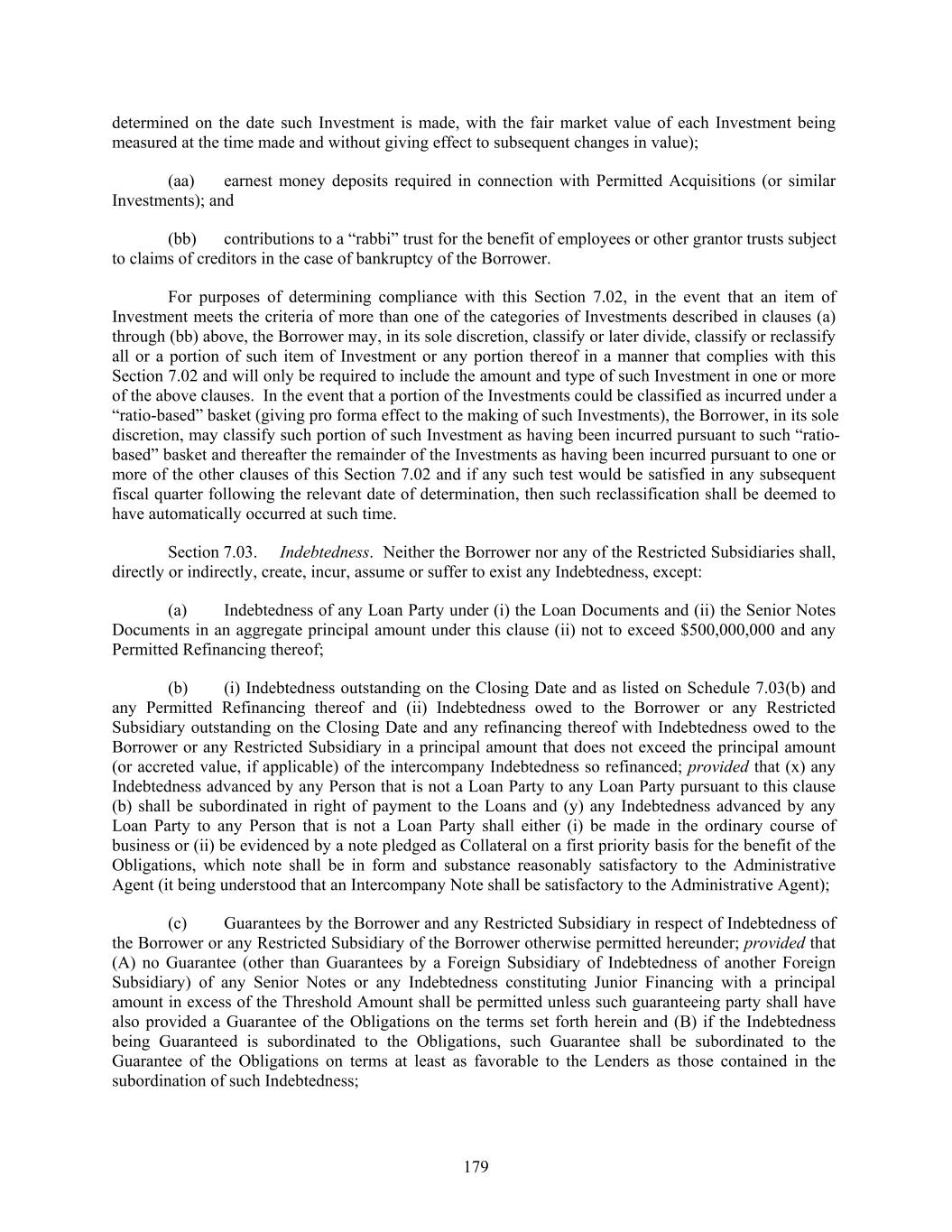 determined on the date such Investment is made, with the fair market value of each Investment beingmeasured at the time made and without giving effect to subsequent changes in value);(aa) earnest money deposits required in connection with Permitted Acquisitions (or similarInvestments); and(bb) contributions to a “rabbi” trust for the benefit of employees or other grantor trusts subjectto claims of creditors in the case of bankruptcy of the Borrower.For purposes of determining compliance with this Section 7.02, in the event that an item ofInvestment meets the criteria of more than one of the categories of Investments described in clauses (a)through (bb) above, the Borrower may, in its sole discretion, classify or later divide, classify or reclassifyall or a portion of such item of Investment or any portion thereof in a manner that complies with thisSection 7.02 and will only be required to include the amount and type of such Investment in one or moreof the above clauses. In the event that a portion of the Investments could be classified as incurred under a“ratio-based” basket (giving pro forma effect to the making of such Investments), the Borrower, in its solediscretion, may classify such portion of such Investment as having been incurred pursuant to such “ratio-based” basket and thereafter the remainder of the Investments as having been incurred pursuant to one ormore of the other clauses of this Section 7.02 and if any such test would be satisfied in any subsequentfiscal quarter following the relevant date of determination, then such reclassification shall be deemed tohave automatically occurred at such time.Section 7.03. Indebtedness. Neither the Borrower nor any of the Restricted Subsidiaries shall,directly or indirectly, create, incur, assume or suffer to exist any Indebtedness, except:(a) Indebtedness of any Loan Party under (i) the Loan Documents and (ii) the Senior NotesDocuments in an aggregate principal amount under this clause (ii) not to exceed $500,000,000 and anyPermitted Refinancing thereof;(b) (i) Indebtedness outstanding on the Closing Date and as listed on Schedule 7.03(b) andany Permitted Refinancing thereof and (ii) Indebtedness owed to the Borrower or any RestrictedSubsidiary outstanding on the Closing Date and any refinancing thereof with Indebtedness owed to theBorrower or any Restricted Subsidiary in a principal amount that does not exceed the principal amount(or accreted value, if applicable) of the intercompany Indebtedness so refinanced; provided that (x) anyIndebtedness advanced by any Person that is not a Loan Party to any Loan Party pursuant to this clause(b) shall be subordinated in right of payment to the Loans and (y) any Indebtedness advanced by anyLoan Party to any Person that is not a Loan Party shall either (i) be made in the ordinary course ofbusiness or (ii) be evidenced by a note pledged as Collateral on a first priority basis for the benefit of theObligations, which note shall be in form and substance reasonably satisfactory to the AdministrativeAgent (it being understood that an Intercompany Note shall be satisfactory to the Administrative Agent);(c) Guarantees by the Borrower and any Restricted Subsidiary in respect of Indebtedness ofthe Borrower or any Restricted Subsidiary of the Borrower otherwise permitted hereunder; provided that(A) no Guarantee (other than Guarantees by a Foreign Subsidiary of Indebtedness of another ForeignSubsidiary) of any Senior Notes or any Indebtedness constituting Junior Financing with a principalamount in excess of the Threshold Amount shall be permitted unless such guaranteeing party shall havealso provided a Guarantee of the Obligations on the terms set forth herein and (B) if the Indebtednessbeing Guaranteed is subordinated to the Obligations, such Guarantee shall be subordinated to theGuarantee of the Obligations on terms at least as favorable to the Lenders as those contained in thesubordination of such Indebtedness; 179