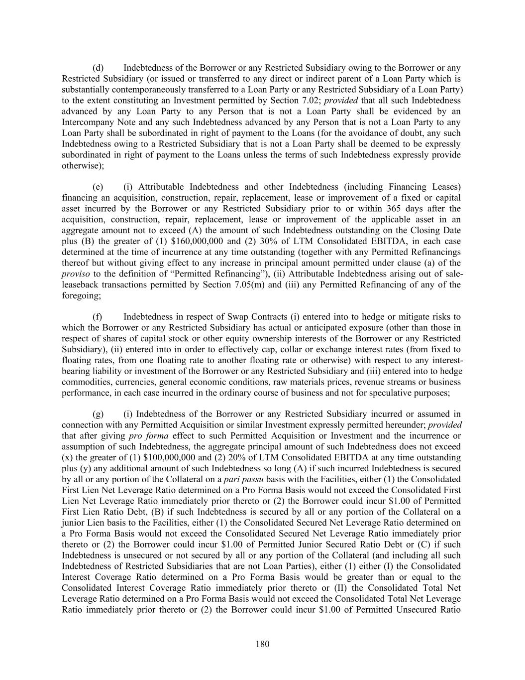 (d) Indebtedness of the Borrower or any Restricted Subsidiary owing to the Borrower or anyRestricted Subsidiary (or issued or transferred to any direct or indirect parent of a Loan Party which issubstantially contemporaneously transferred to a Loan Party or any Restricted Subsidiary of a Loan Party)to the extent constituting an Investment permitted by Section 7.02; provided that all such Indebtednessadvanced by any Loan Party to any Person that is not a Loan Party shall be evidenced by anIntercompany Note and any such Indebtedness advanced by any Person that is not a Loan Party to anyLoan Party shall be subordinated in right of payment to the Loans (for the avoidance of doubt, any suchIndebtedness owing to a Restricted Subsidiary that is not a Loan Party shall be deemed to be expresslysubordinated in right of payment to the Loans unless the terms of such Indebtedness expressly provideotherwise);(e) (i) Attributable Indebtedness and other Indebtedness (including Financing Leases)financing an acquisition, construction, repair, replacement, lease or improvement of a fixed or capitalasset incurred by the Borrower or any Restricted Subsidiary prior to or within 365 days after theacquisition, construction, repair, replacement, lease or improvement of the applicable asset in anaggregate amount not to exceed (A) the amount of such Indebtedness outstanding on the Closing Dateplus (B) the greater of (1) $160,000,000 and (2) 30% of LTM Consolidated EBITDA, in each casedetermined at the time of incurrence at any time outstanding (together with any Permitted Refinancingsthereof but without giving effect to any increase in principal amount permitted under clause (a) of theproviso to the definition of “Permitted Refinancing”), (ii) Attributable Indebtedness arising out of sale-leaseback transactions permitted by Section 7.05(m) and (iii) any Permitted Refinancing of any of theforegoing;(f) Indebtedness in respect of Swap Contracts (i) entered into to hedge or mitigate risks towhich the Borrower or any Restricted Subsidiary has actual or anticipated exposure (other than those inrespect of shares of capital stock or other equity ownership interests of the Borrower or any RestrictedSubsidiary), (ii) entered into in order to effectively cap, collar or exchange interest rates (from fixed tofloating rates, from one floating rate to another floating rate or otherwise) with respect to any interest-bearing liability or investment of the Borrower or any Restricted Subsidiary and (iii) entered into to hedgecommodities, currencies, general economic conditions, raw materials prices, revenue streams or businessperformance, in each case incurred in the ordinary course of business and not for speculative purposes;(g) (i) Indebtedness of the Borrower or any Restricted Subsidiary incurred or assumed inconnection with any Permitted Acquisition or similar Investment expressly permitted hereunder; providedthat after giving pro forma effect to such Permitted Acquisition or Investment and the incurrence orassumption of such Indebtedness, the aggregate principal amount of such Indebtedness does not exceed(x) the greater of (1) $100,000,000 and (2) 20% of LTM Consolidated EBITDA at any time outstandingplus (y) any additional amount of such Indebtedness so long (A) if such incurred Indebtedness is securedby all or any portion of the Collateral on a pari passu basis with the Facilities, either (1) the ConsolidatedFirst Lien Net Leverage Ratio determined on a Pro Forma Basis would not exceed the Consolidated FirstLien Net Leverage Ratio immediately prior thereto or (2) the Borrower could incur $1.00 of PermittedFirst Lien Ratio Debt, (B) if such Indebtedness is secured by all or any portion of the Collateral on ajunior Lien basis to the Facilities, either (1) the Consolidated Secured Net Leverage Ratio determined ona Pro Forma Basis would not exceed the Consolidated Secured Net Leverage Ratio immediately priorthereto or (2) the Borrower could incur $1.00 of Permitted Junior Secured Ratio Debt or (C) if suchIndebtedness is unsecured or not secured by all or any portion of the Collateral (and including all suchIndebtedness of Restricted Subsidiaries that are not Loan Parties), either (1) either (I) the ConsolidatedInterest Coverage Ratio determined on a Pro Forma Basis would be greater than or equal to theConsolidated Interest Coverage Ratio immediately prior thereto or (II) the Consolidated Total NetLeverage Ratio determined on a Pro Forma Basis would not exceed the Consolidated Total Net LeverageRatio immediately prior thereto or (2) the Borrower could incur $1.00 of Permitted Unsecured Ratio180