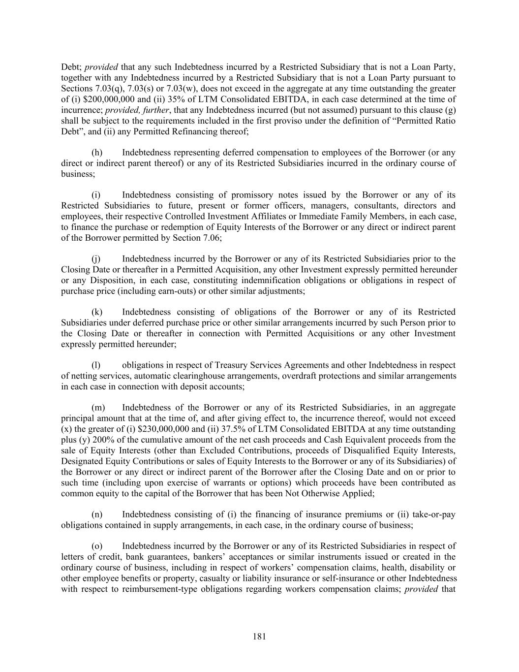 Debt; provided that any such Indebtedness incurred by a Restricted Subsidiary that is not a Loan Party,together with any Indebtedness incurred by a Restricted Subsidiary that is not a Loan Party pursuant toSections 7.03(q), 7.03(s) or 7.03(w), does not exceed in the aggregate at any time outstanding the greaterof (i) $200,000,000 and (ii) 35% of LTM Consolidated EBITDA, in each case determined at the time ofincurrence; provided, further, that any Indebtedness incurred (but not assumed) pursuant to this clause (g)shall be subject to the requirements included in the first proviso under the definition of “Permitted RatioDebt”, and (ii) any Permitted Refinancing thereof;(h) Indebtedness representing deferred compensation to employees of the Borrower (or anydirect or indirect parent thereof) or any of its Restricted Subsidiaries incurred in the ordinary course ofbusiness;(i) Indebtedness consisting of promissory notes issued by the Borrower or any of itsRestricted Subsidiaries to future, present or former officers, managers, consultants, directors andemployees, their respective Controlled Investment Affiliates or Immediate Family Members, in each case,to finance the purchase or redemption of Equity Interests of the Borrower or any direct or indirect parentof the Borrower permitted by Section 7.06;(j) Indebtedness incurred by the Borrower or any of its Restricted Subsidiaries prior to theClosing Date or thereafter in a Permitted Acquisition, any other Investment expressly permitted hereunderor any Disposition, in each case, constituting indemnification obligations or obligations in respect ofpurchase price (including earn-outs) or other similar adjustments;(k) Indebtedness consisting of obligations of the Borrower or any of its RestrictedSubsidiaries under deferred purchase price or other similar arrangements incurred by such Person prior tothe Closing Date or thereafter in connection with Permitted Acquisitions or any other Investmentexpressly permitted hereunder;(l) obligations in respect of Treasury Services Agreements and other Indebtedness in respectof netting services, automatic clearinghouse arrangements, overdraft protections and similar arrangementsin each case in connection with deposit accounts;(m) Indebtedness of the Borrower or any of its Restricted Subsidiaries, in an aggregateprincipal amount that at the time of, and after giving effect to, the incurrence thereof, would not exceed(x) the greater of (i) $230,000,000 and (ii) 37.5% of LTM Consolidated EBITDA at any time outstandingplus (y) 200% of the cumulative amount of the net cash proceeds and Cash Equivalent proceeds from thesale of Equity Interests (other than Excluded Contributions, proceeds of Disqualified Equity Interests,Designated Equity Contributions or sales of Equity Interests to the Borrower or any of its Subsidiaries) ofthe Borrower or any direct or indirect parent of the Borrower after the Closing Date and on or prior tosuch time (including upon exercise of warrants or options) which proceeds have been contributed ascommon equity to the capital of the Borrower that has been Not Otherwise Applied;(n) Indebtedness consisting of (i) the financing of insurance premiums or (ii) take-or-payobligations contained in supply arrangements, in each case, in the ordinary course of business;(o) Indebtedness incurred by the Borrower or any of its Restricted Subsidiaries in respect ofletters of credit, bank guarantees, bankers’ acceptances or similar instruments issued or created in theordinary course of business, including in respect of workers’ compensation claims, health, disability orother employee benefits or property, casualty or liability insurance or self-insurance or other Indebtednesswith respect to reimbursement-type obligations regarding workers compensation claims; provided that181