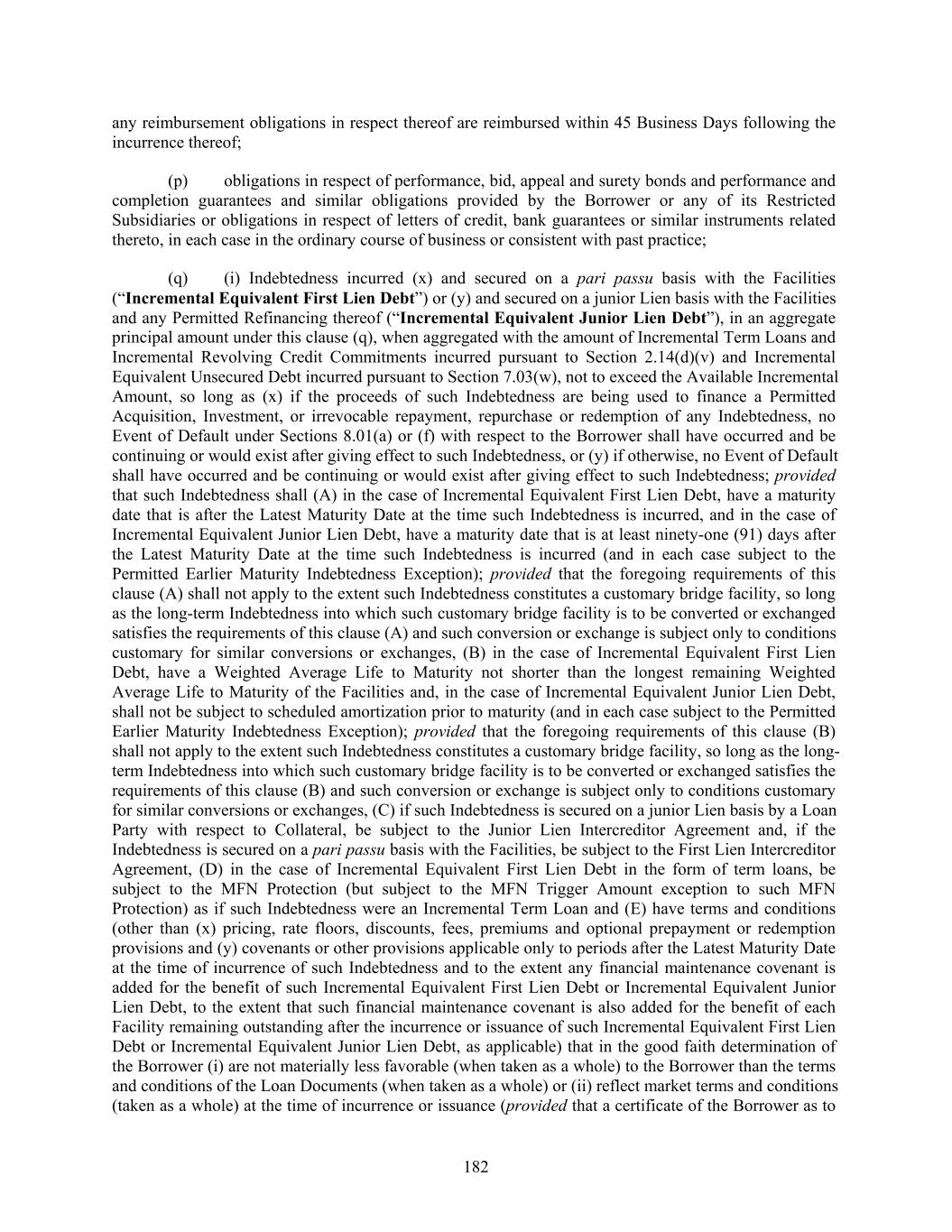 any reimbursement obligations in respect thereof are reimbursed within 45 Business Days following theincurrence thereof;(p) obligations in respect of performance, bid, appeal and surety bonds and performance andcompletion guarantees and similar obligations provided by the Borrower or any of its RestrictedSubsidiaries or obligations in respect of letters of credit, bank guarantees or similar instruments relatedthereto, in each case in the ordinary course of business or consistent with past practice;(q) (i) Indebtedness incurred (x) and secured on a pari passu basis with the Facilities(“Incremental Equivalent First Lien Debt”) or (y) and secured on a junior Lien basis with the Facilitiesand any Permitted Refinancing thereof (“Incremental Equivalent Junior Lien Debt”), in an aggregateprincipal amount under this clause (q), when aggregated with the amount of Incremental Term Loans andIncremental Revolving Credit Commitments incurred pursuant to Section 2.14(d)(v) and IncrementalEquivalent Unsecured Debt incurred pursuant to Section 7.03(w), not to exceed the Available IncrementalAmount, so long as (x) if the proceeds of such Indebtedness are being used to finance a PermittedAcquisition, Investment, or irrevocable repayment, repurchase or redemption of any Indebtedness, noEvent of Default under Sections 8.01(a) or (f) with respect to the Borrower shall have occurred and becontinuing or would exist after giving effect to such Indebtedness, or (y) if otherwise, no Event of Defaultshall have occurred and be continuing or would exist after giving effect to such Indebtedness; providedthat such Indebtedness shall (A) in the case of Incremental Equivalent First Lien Debt, have a maturitydate that is after the Latest Maturity Date at the time such Indebtedness is incurred, and in the case ofIncremental Equivalent Junior Lien Debt, have a maturity date that is at least ninety-one (91) days afterthe Latest Maturity Date at the time such Indebtedness is incurred (and in each case subject to thePermitted Earlier Maturity Indebtedness Exception); provided that the foregoing requirements of thisclause (A) shall not apply to the extent such Indebtedness constitutes a customary bridge facility, so longas the long-term Indebtedness into which such customary bridge facility is to be converted or exchangedsatisfies the requirements of this clause (A) and such conversion or exchange is subject only to conditionscustomary for similar conversions or exchanges, (B) in the case of Incremental Equivalent First LienDebt, have a Weighted Average Life to Maturity not shorter than the longest remaining WeightedAverage Life to Maturity of the Facilities and, in the case of Incremental Equivalent Junior Lien Debt,shall not be subject to scheduled amortization prior to maturity (and in each case subject to the PermittedEarlier Maturity Indebtedness Exception); provided that the foregoing requirements of this clause (B)shall not apply to the extent such Indebtedness constitutes a customary bridge facility, so long as the long-term Indebtedness into which such customary bridge facility is to be converted or exchanged satisfies therequirements of this clause (B) and such conversion or exchange is subject only to conditions customaryfor similar conversions or exchanges, (C) if such Indebtedness is secured on a junior Lien basis by a LoanParty with respect to Collateral, be subject to the Junior Lien Intercreditor Agreement and, if theIndebtedness is secured on a pari passu basis with the Facilities, be subject to the First Lien IntercreditorAgreement, (D) in the case of Incremental Equivalent First Lien Debt in the form of term loans, besubject to the MFN Protection (but subject to the MFN Trigger Amount exception to such MFNProtection) as if such Indebtedness were an Incremental Term Loan and (E) have terms and conditions(other than (x) pricing, rate floors, discounts, fees, premiums and optional prepayment or redemptionprovisions and (y) covenants or other provisions applicable only to periods after the Latest Maturity Dateat the time of incurrence of such Indebtedness and to the extent any financial maintenance covenant isadded for the benefit of such Incremental Equivalent First Lien Debt or Incremental Equivalent JuniorLien Debt, to the extent that such financial maintenance covenant is also added for the benefit of eachFacility remaining outstanding after the incurrence or issuance of such Incremental Equivalent First LienDebt or Incremental Equivalent Junior Lien Debt, as applicable) that in the good faith determination ofthe Borrower (i) are not materially less favorable (when taken as a whole) to the Borrower than the termsand conditions of the Loan Documents (when taken as a whole) or (ii) reflect market terms and conditions(taken as a whole) at the time of incurrence or issuance (provided that a certificate of the Borrower as to182