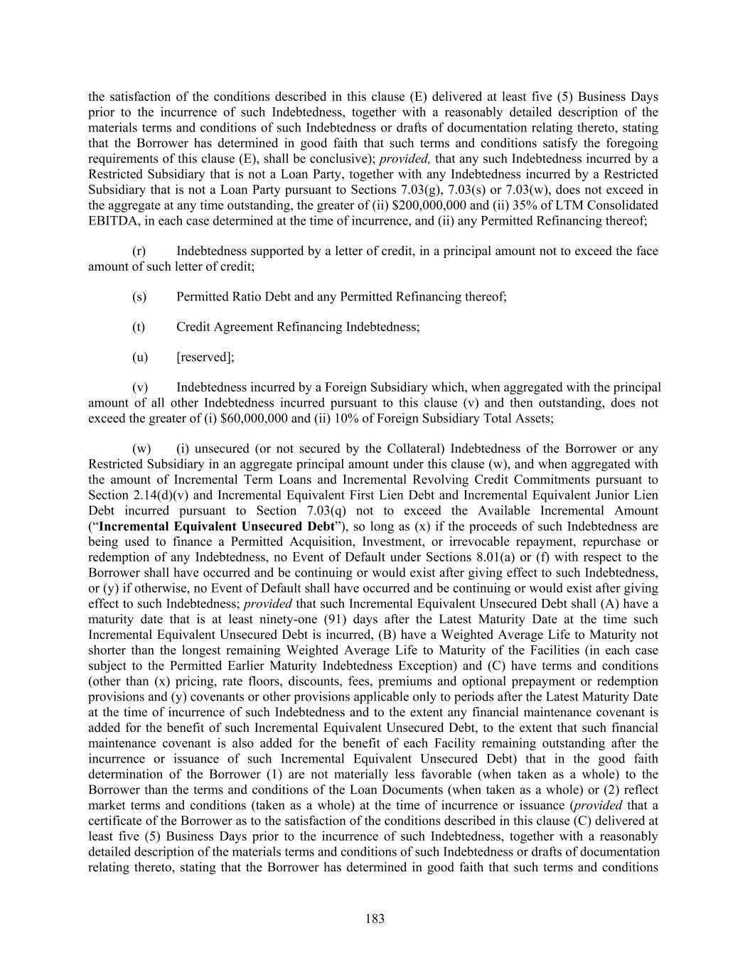 the satisfaction of the conditions described in this clause (E) delivered at least five (5) Business Daysprior to the incurrence of such Indebtedness, together with a reasonably detailed description of thematerials terms and conditions of such Indebtedness or drafts of documentation relating thereto, statingthat the Borrower has determined in good faith that such terms and conditions satisfy the foregoingrequirements of this clause (E), shall be conclusive); provided, that any such Indebtedness incurred by aRestricted Subsidiary that is not a Loan Party, together with any Indebtedness incurred by a RestrictedSubsidiary that is not a Loan Party pursuant to Sections 7.03(g), 7.03(s) or 7.03(w), does not exceed inthe aggregate at any time outstanding, the greater of (ii) $200,000,000 and (ii) 35% of LTM ConsolidatedEBITDA, in each case determined at the time of incurrence, and (ii) any Permitted Refinancing thereof;(r) Indebtedness supported by a letter of credit, in a principal amount not to exceed the faceamount of such letter of credit;(s) Permitted Ratio Debt and any Permitted Refinancing thereof;(t) Credit Agreement Refinancing Indebtedness;(u) [reserved];(v) Indebtedness incurred by a Foreign Subsidiary which, when aggregated with the principalamount of all other Indebtedness incurred pursuant to this clause (v) and then outstanding, does notexceed the greater of (i) $60,000,000 and (ii) 10% of Foreign Subsidiary Total Assets;(w) (i) unsecured (or not secured by the Collateral) Indebtedness of the Borrower or anyRestricted Subsidiary in an aggregate principal amount under this clause (w), and when aggregated withthe amount of Incremental Term Loans and Incremental Revolving Credit Commitments pursuant toSection 2.14(d)(v) and Incremental Equivalent First Lien Debt and Incremental Equivalent Junior LienDebt incurred pursuant to Section 7.03(q) not to exceed the Available Incremental Amount(“Incremental Equivalent Unsecured Debt”), so long as (x) if the proceeds of such Indebtedness arebeing used to finance a Permitted Acquisition, Investment, or irrevocable repayment, repurchase orredemption of any Indebtedness, no Event of Default under Sections 8.01(a) or (f) with respect to theBorrower shall have occurred and be continuing or would exist after giving effect to such Indebtedness,or (y) if otherwise, no Event of Default shall have occurred and be continuing or would exist after givingeffect to such Indebtedness; provided that such Incremental Equivalent Unsecured Debt shall (A) have amaturity date that is at least ninety-one (91) days after the Latest Maturity Date at the time suchIncremental Equivalent Unsecured Debt is incurred, (B) have a Weighted Average Life to Maturity notshorter than the longest remaining Weighted Average Life to Maturity of the Facilities (in each casesubject to the Permitted Earlier Maturity Indebtedness Exception) and (C) have terms and conditions(other than (x) pricing, rate floors, discounts, fees, premiums and optional prepayment or redemptionprovisions and (y) covenants or other provisions applicable only to periods after the Latest Maturity Dateat the time of incurrence of such Indebtedness and to the extent any financial maintenance covenant isadded for the benefit of such Incremental Equivalent Unsecured Debt, to the extent that such financialmaintenance covenant is also added for the benefit of each Facility remaining outstanding after theincurrence or issuance of such Incremental Equivalent Unsecured Debt) that in the good faithdetermination of the Borrower (1) are not materially less favorable (when taken as a whole) to theBorrower than the terms and conditions of the Loan Documents (when taken as a whole) or (2) reflectmarket terms and conditions (taken as a whole) at the time of incurrence or issuance (provided that acertificate of the Borrower as to the satisfaction of the conditions described in this clause (C) delivered atleast five (5) Business Days prior to the incurrence of such Indebtedness, together with a reasonablydetailed description of the materials terms and conditions of such Indebtedness or drafts of documentationrelating thereto, stating that the Borrower has determined in good faith that such terms and conditions183
