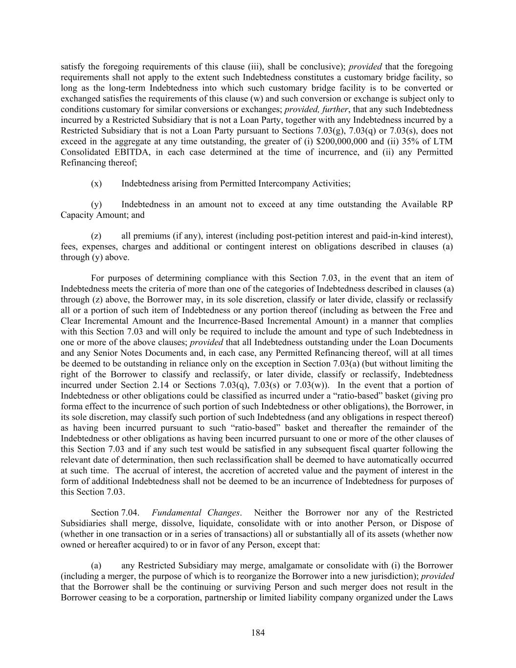 satisfy the foregoing requirements of this clause (iii), shall be conclusive); provided that the foregoingrequirements shall not apply to the extent such Indebtedness constitutes a customary bridge facility, solong as the long-term Indebtedness into which such customary bridge facility is to be converted orexchanged satisfies the requirements of this clause (w) and such conversion or exchange is subject only toconditions customary for similar conversions or exchanges; provided, further, that any such Indebtednessincurred by a Restricted Subsidiary that is not a Loan Party, together with any Indebtedness incurred by aRestricted Subsidiary that is not a Loan Party pursuant to Sections 7.03(g), 7.03(q) or 7.03(s), does notexceed in the aggregate at any time outstanding, the greater of (i) $200,000,000 and (ii) 35% of LTMConsolidated EBITDA, in each case determined at the time of incurrence, and (ii) any PermittedRefinancing thereof;(x) Indebtedness arising from Permitted Intercompany Activities;(y) Indebtedness in an amount not to exceed at any time outstanding the Available RPCapacity Amount; and(z) all premiums (if any), interest (including post-petition interest and paid-in-kind interest),fees, expenses, charges and additional or contingent interest on obligations described in clauses (a)through (y) above.For purposes of determining compliance with this Section 7.03, in the event that an item ofIndebtedness meets the criteria of more than one of the categories of Indebtedness described in clauses (a)through (z) above, the Borrower may, in its sole discretion, classify or later divide, classify or reclassifyall or a portion of such item of Indebtedness or any portion thereof (including as between the Free andClear Incremental Amount and the Incurrence-Based Incremental Amount) in a manner that complieswith this Section 7.03 and will only be required to include the amount and type of such Indebtedness inone or more of the above clauses; provided that all Indebtedness outstanding under the Loan Documentsand any Senior Notes Documents and, in each case, any Permitted Refinancing thereof, will at all timesbe deemed to be outstanding in reliance only on the exception in Section 7.03(a) (but without limiting theright of the Borrower to classify and reclassify, or later divide, classify or reclassify, Indebtednessincurred under Section 2.14 or Sections 7.03(q), 7.03(s) or 7.03(w)). In the event that a portion ofIndebtedness or other obligations could be classified as incurred under a “ratio-based” basket (giving proforma effect to the incurrence of such portion of such Indebtedness or other obligations), the Borrower, inits sole discretion, may classify such portion of such Indebtedness (and any obligations in respect thereof)as having been incurred pursuant to such “ratio-based” basket and thereafter the remainder of theIndebtedness or other obligations as having been incurred pursuant to one or more of the other clauses ofthis Section 7.03 and if any such test would be satisfied in any subsequent fiscal quarter following therelevant date of determination, then such reclassification shall be deemed to have automatically occurredat such time. The accrual of interest, the accretion of accreted value and the payment of interest in theform of additional Indebtedness shall not be deemed to be an incurrence of Indebtedness for purposes ofthis Section 7.03.Section 7.04. Fundamental Changes. Neither the Borrower nor any of the RestrictedSubsidiaries shall merge, dissolve, liquidate, consolidate with or into another Person, or Dispose of(whether in one transaction or in a series of transactions) all or substantially all of its assets (whether nowowned or hereafter acquired) to or in favor of any Person, except that:(a) any Restricted Subsidiary may merge, amalgamate or consolidate with (i) the Borrower(including a merger, the purpose of which is to reorganize the Borrower into a new jurisdiction); providedthat the Borrower shall be the continuing or surviving Person and such merger does not result in theBorrower ceasing to be a corporation, partnership or limited liability company organized under the Laws184