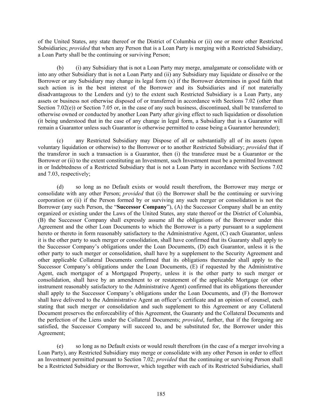 of the United States, any state thereof or the District of Columbia or (ii) one or more other RestrictedSubsidiaries; provided that when any Person that is a Loan Party is merging with a Restricted Subsidiary,a Loan Party shall be the continuing or surviving Person;(b) (i) any Subsidiary that is not a Loan Party may merge, amalgamate or consolidate with orinto any other Subsidiary that is not a Loan Party and (ii) any Subsidiary may liquidate or dissolve or theBorrower or any Subsidiary may change its legal form (x) if the Borrower determines in good faith thatsuch action is in the best interest of the Borrower and its Subsidiaries and if not materiallydisadvantageous to the Lenders and (y) to the extent such Restricted Subsidiary is a Loan Party, anyassets or business not otherwise disposed of or transferred in accordance with Sections 7.02 (other than Section 7.02(e)) or Section 7.05 or, in the case of any such business, discontinued, shall be transferred tootherwise owned or conducted by another Loan Party after giving effect to such liquidation or dissolution(it being understood that in the case of any change in legal form, a Subsidiary that is a Guarantor willremain a Guarantor unless such Guarantor is otherwise permitted to cease being a Guarantor hereunder);(c) any Restricted Subsidiary may Dispose of all or substantially all of its assets (uponvoluntary liquidation or otherwise) to the Borrower or to another Restricted Subsidiary; provided that ifthe transferor in such a transaction is a Guarantor, then (i) the transferee must be a Guarantor or theBorrower or (ii) to the extent constituting an Investment, such Investment must be a permitted Investmentin or Indebtedness of a Restricted Subsidiary that is not a Loan Party in accordance with Sections 7.02and 7.03, respectively;(d) so long as no Default exists or would result therefrom, the Borrower may merge orconsolidate with any other Person; provided that (i) the Borrower shall be the continuing or survivingcorporation or (ii) if the Person formed by or surviving any such merger or consolidation is not theBorrower (any such Person, the “Successor Company”), (A) the Successor Company shall be an entityorganized or existing under the Laws of the United States, any state thereof or the District of Columbia,(B) the Successor Company shall expressly assume all the obligations of the Borrower under thisAgreement and the other Loan Documents to which the Borrower is a party pursuant to a supplementhereto or thereto in form reasonably satisfactory to the Administrative Agent, (C) each Guarantor, unlessit is the other party to such merger or consolidation, shall have confirmed that its Guaranty shall apply tothe Successor Company’s obligations under the Loan Documents, (D) each Guarantor, unless it is theother party to such merger or consolidation, shall have by a supplement to the Security Agreement andother applicable Collateral Documents confirmed that its obligations thereunder shall apply to theSuccessor Company’s obligations under the Loan Documents, (E) if requested by the AdministrativeAgent, each mortgagor of a Mortgaged Property, unless it is the other party to such merger orconsolidation, shall have by an amendment to or restatement of the applicable Mortgage (or otherinstrument reasonably satisfactory to the Administrative Agent) confirmed that its obligations thereundershall apply to the Successor Company’s obligations under the Loan Documents, and (F) the Borrowershall have delivered to the Administrative Agent an officer’s certificate and an opinion of counsel, eachstating that such merger or consolidation and such supplement to this Agreement or any CollateralDocument preserves the enforceability of this Agreement, the Guaranty and the Collateral Documents andthe perfection of the Liens under the Collateral Documents; provided, further, that if the foregoing aresatisfied, the Successor Company will succeed to, and be substituted for, the Borrower under thisAgreement;(e) so long as no Default exists or would result therefrom (in the case of a merger involving aLoan Party), any Restricted Subsidiary may merge or consolidate with any other Person in order to effectan Investment permitted pursuant to Section 7.02; provided that the continuing or surviving Person shallbe a Restricted Subsidiary or the Borrower, which together with each of its Restricted Subsidiaries, shall185